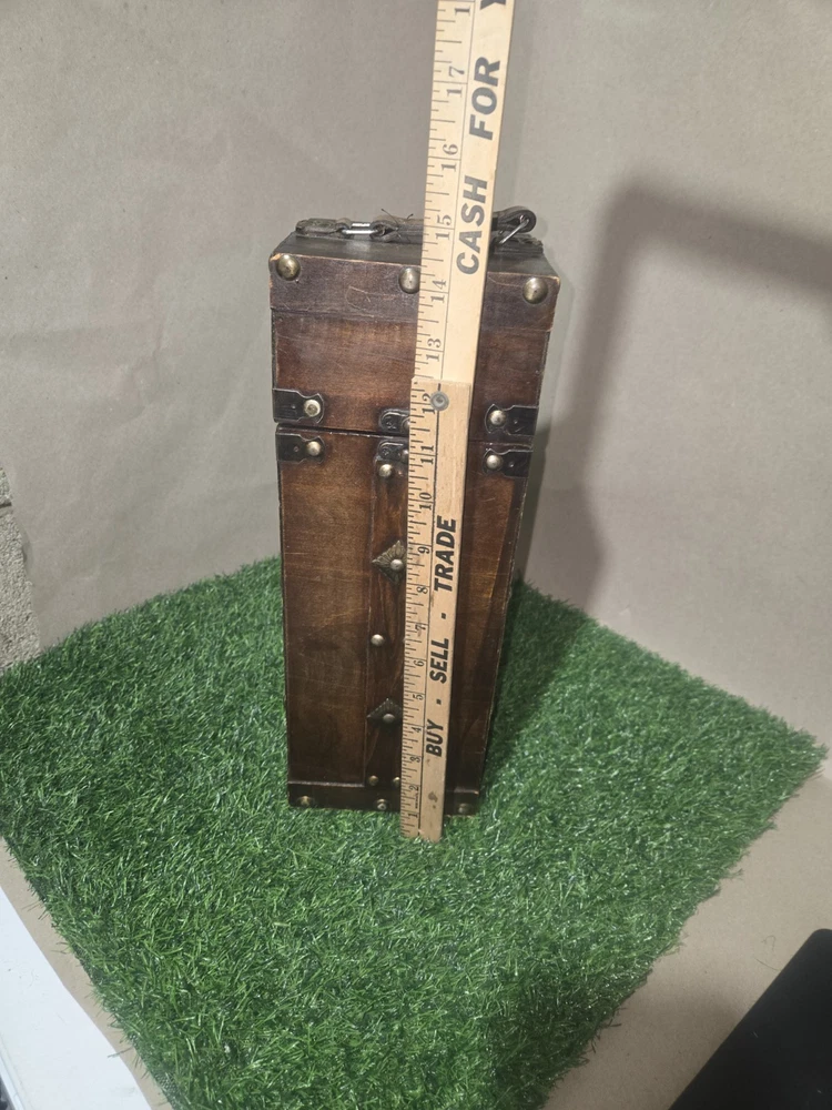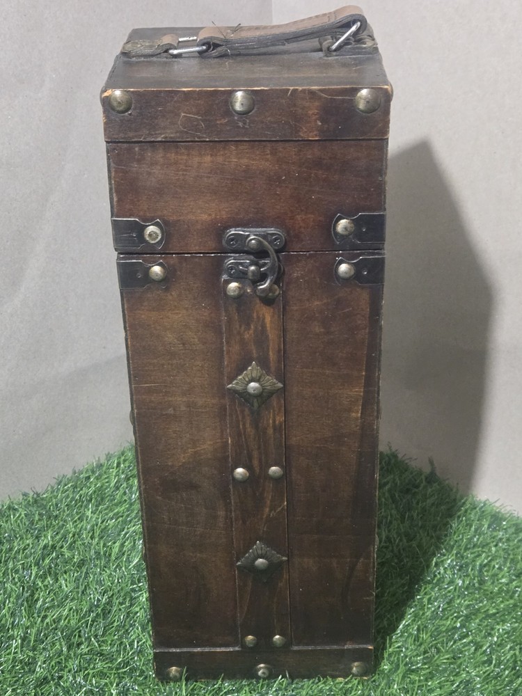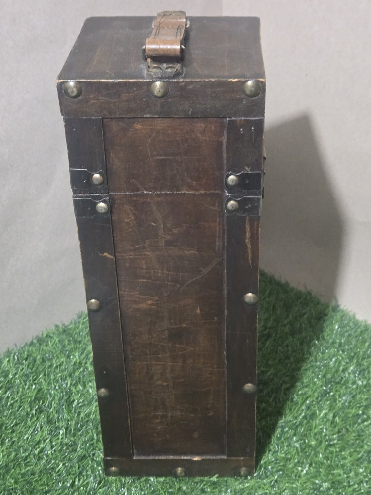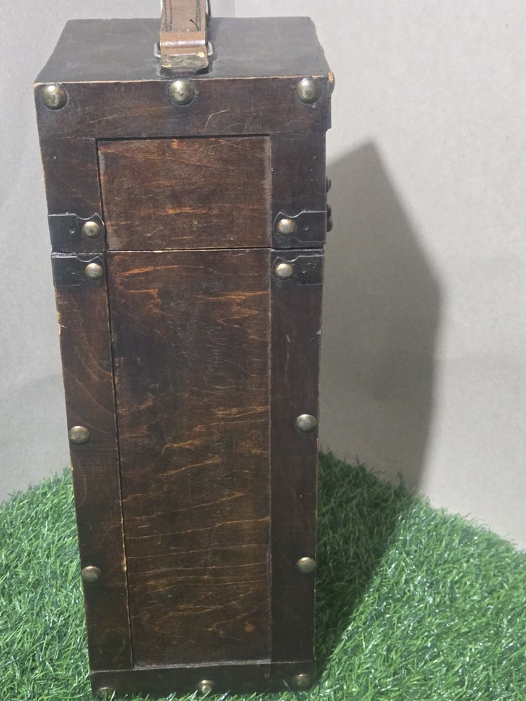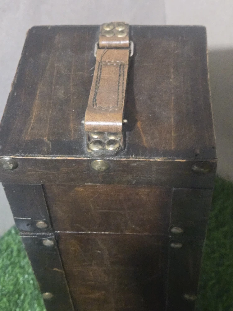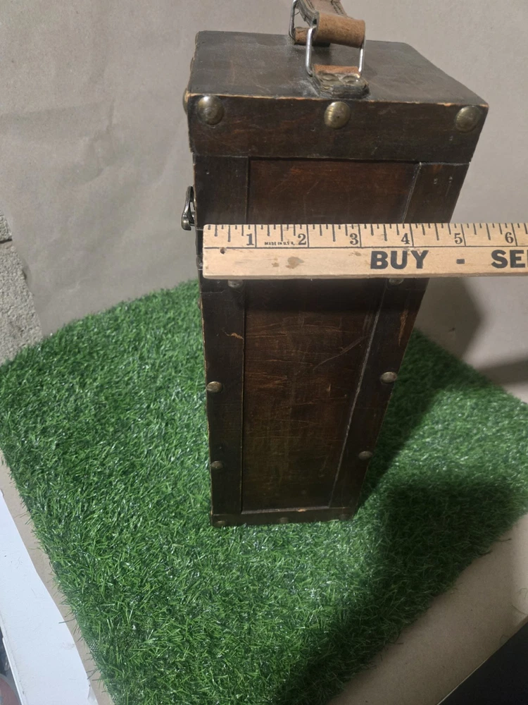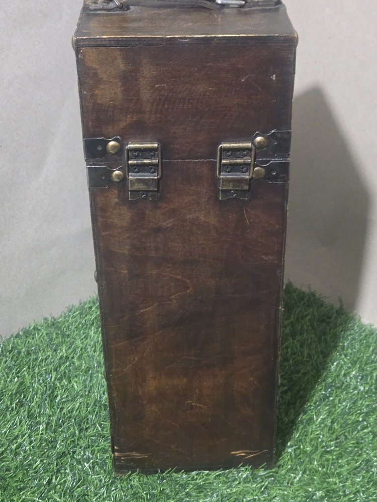 Wine Box Carrier Wood Brass Hardware Leather Like Handle Storage Gift Decor 14”. Condition is Used. Shipped with USPS Ground Advantage.