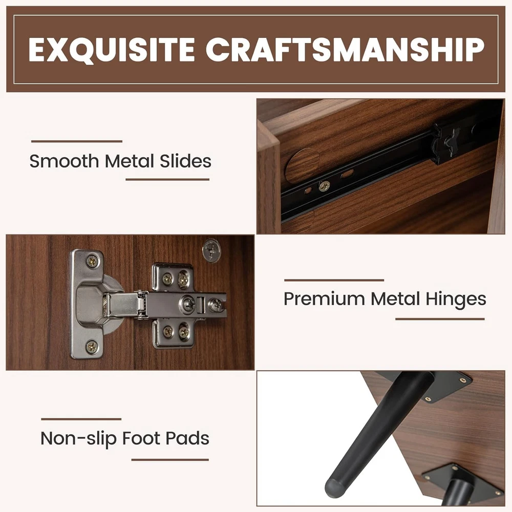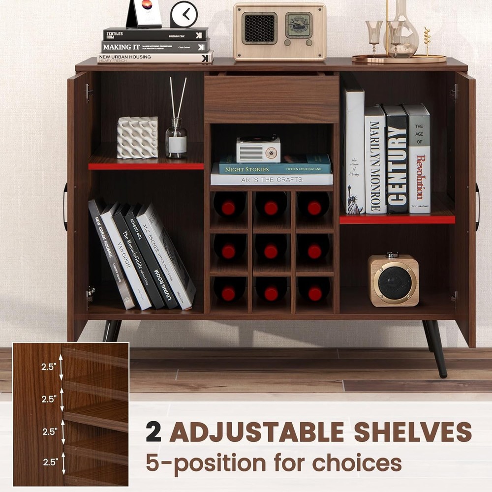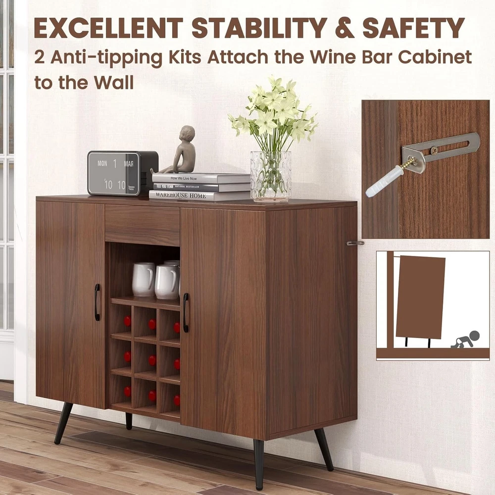 Product Description Description: This wine bar cabinet is a nice solution for wines and other items. It comes with spacious top, pull-out drawer, open compartment and 2 door cabinets, keeping a variety of objects organized for tidy environment. Besides, the wine rack easily stores 9-bottle wines and can be removed for large items. And the 2 adjustable shelves bring customized storage. With exquisite craftsmanship, the wine bar cabinet is sturdy and durable. Moreover, the 2 anti-tipping devices further enhance the stability for safety using experience. This mid-century coffee bar cabinet is supposed to be a practical yet elegant addition to your home. Features: Tabletop, drawer, cabinets and open compartment for large storage space Wine rack can be taken out to offer other objects space 2 adjustable shelves enable the cabinet to easily store different sized items 2 anti-toppling devices ensure excellent stability & safety Easy to clean with sufficient clearance to the ground Can be used as a buffet sideboard, wine bar cabinet, liquor cabinet, etc Smooth metal slides to better open and close drawer Premium metal hinges are sturdy and durable for usage Specifications: Color: Walnut Material: Engineered Wood, MDF, Metal Overall Dimensions: 38" x 16" x 31" (L x W x H) Open Compartment Dimensions: 11.5" x 14.5" x 6.5" (W x D x H) Cabinet Dimensions: 12" x 14.5" x 23.5" (L x W x H) Each Grid of Wine Rack: 3.5" x 3.5" x 14.5" (W x H x D) Interior of Drawer: 9.5" x 12.5" x 3" (W x D x H) Cabinet from Ground: 6" Weight Capacity of Tabletop: 155 lbs Weight capacity of Each Shelf: 30 lbs Weight Capacity of Drawer: 15 lbs Net Weight: 75 lbs Package Includes: 1 x Buffet Cabinet 1 x Instruction On Aug 14, 2025 at 20:04:26 PDT, seller added the following information: