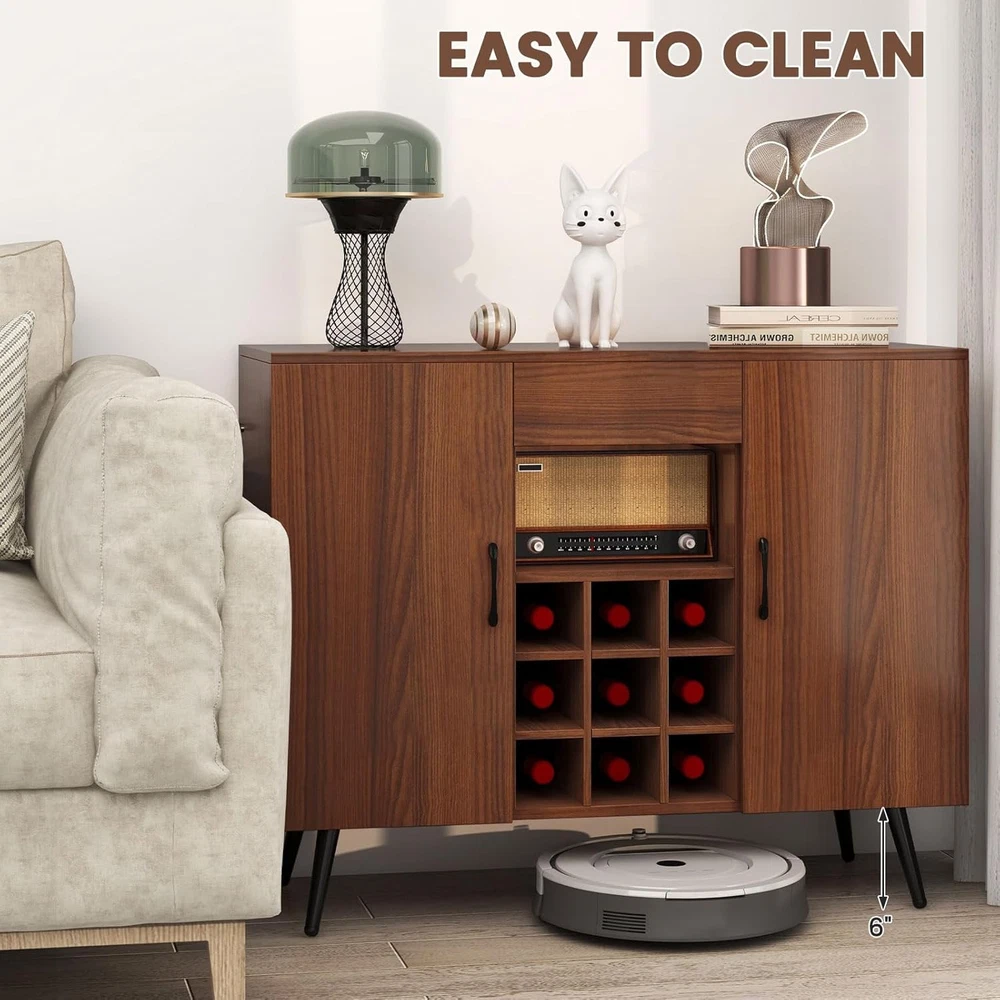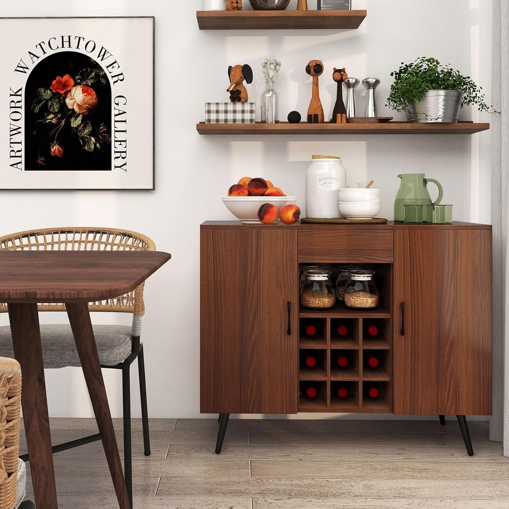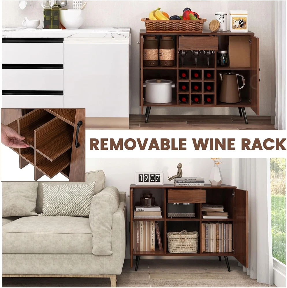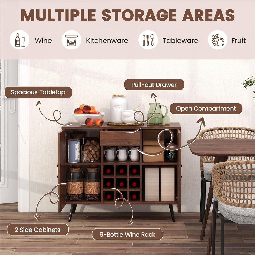 Product Description Description: This wine bar cabinet is a nice solution for wines and other items. It comes with spacious top, pull-out drawer, open compartment and 2 door cabinets, keeping a variety of objects organized for tidy environment. Besides, the wine rack easily stores 9-bottle wines and can be removed for large items. And the 2 adjustable shelves bring customized storage. With exquisite craftsmanship, the wine bar cabinet is sturdy and durable. Moreover, the 2 anti-tipping devices further enhance the stability for safety using experience. This mid-century coffee bar cabinet is supposed to be a practical yet elegant addition to your home. Features: Tabletop, drawer, cabinets and open compartment for large storage space Wine rack can be taken out to offer other objects space 2 adjustable shelves enable the cabinet to easily store different sized items 2 anti-toppling devices ensure excellent stability & safety Easy to clean with sufficient clearance to the ground Can be used as a buffet sideboard, wine bar cabinet, liquor cabinet, etc Smooth metal slides to better open and close drawer Premium metal hinges are sturdy and durable for usage Specifications: Color: Walnut Material: Engineered Wood, MDF, Metal Overall Dimensions: 38" x 16" x 31" (L x W x H) Open Compartment Dimensions: 11.5" x 14.5" x 6.5" (W x D x H) Cabinet Dimensions: 12" x 14.5" x 23.5" (L x W x H) Each Grid of Wine Rack: 3.5" x 3.5" x 14.5" (W x H x D) Interior of Drawer: 9.5" x 12.5" x 3" (W x D x H) Cabinet from Ground: 6" Weight Capacity of Tabletop: 155 lbs Weight capacity of Each Shelf: 30 lbs Weight Capacity of Drawer: 15 lbs Net Weight: 75 lbs Package Includes: 1 x Buffet Cabinet 1 x Instruction On Aug 14, 2025 at 21:36:31 PDT, seller added the following information: