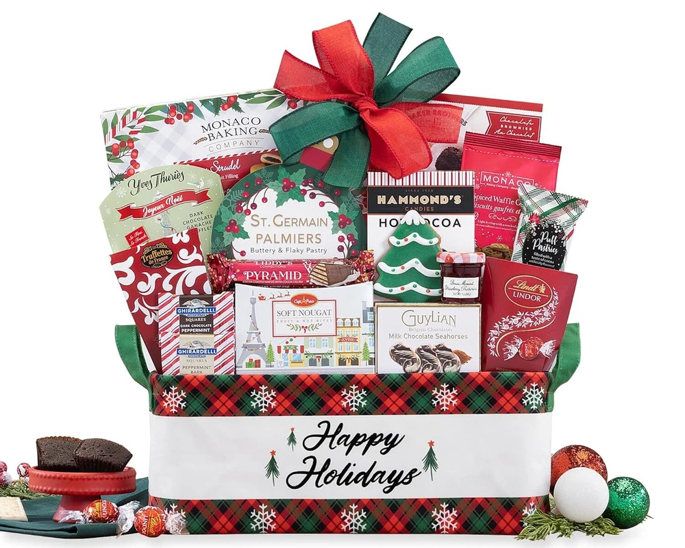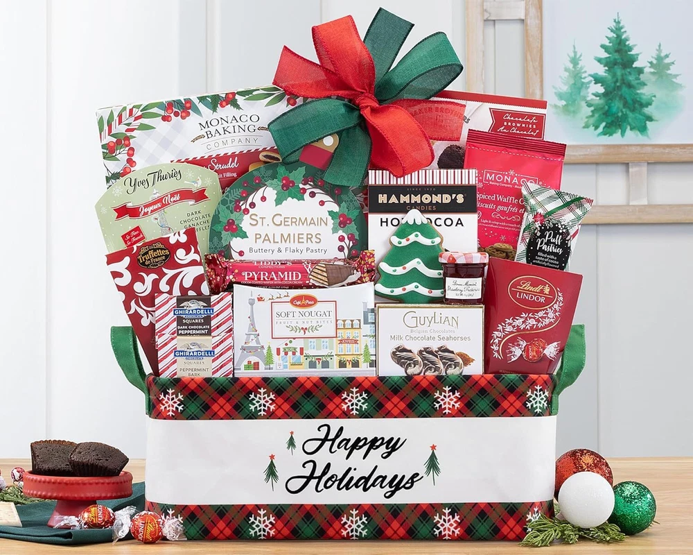 Wine Country Gift Baskets The Holiday Flare Snack Gifts Christmas Holiday Food Gift Product Details Is Discontinued By Manufacturer : No Product Dimensions : 15 x 5 x 11 inches; 0.37 ounces Item model number : 597 Manufacturer : Houdini, Inc. DBA Wine Country Gift Baskets Brand: Wine Country Gift Baskets Package Information: Gift Basket Container Number of Items: 1 Flavor: Gourmet Food Item Weight: 0.02 Pounds Wish them happy holidays with this collection of sweet and savory fare designed with the holidays in mind. Spiced waffle cookies, Lindt milk chocolate truffles, peanut fruit nougats, chocolate brownies, Yves Thuries dark chocolate truffles, cherry strudel cookies, Ghirardelli milk and dark chocolate peppermint bark, Truffettes dark chocolate truffles, strawberry preserves, Belgian milk chocolate seahorse truffles, hot cocoa, a Christmas tree cookie and more make this cordial gift the perfect way to create a great impression around the holidays. Gift Size: 15" x 5" x 11" Item 537