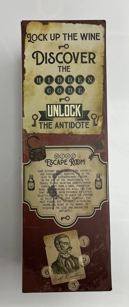 This is a Wine Escape Room Game by Boxer Gifts, designed for adults. It comes in a black color and weighs 1.06 pounds. The package dimensions are 15.67x4.37x4.21 inches. This unique gift includes a wine bottle puzzle box for an entertaining and unusual experience. The box is able to be opened from the bottom, but nothing has ever been removed . The plastic seal on the cards and lock is still attached. The item is very clean and smoke-free. There may be some light imperfections to the outer box. Please check the pictures carefully in order to better assess the condition of the box. I am willing to bundle deal with multiple purchases. I will provide fast and careful shipping. I will respond to all inquiries. Thank you for your time.