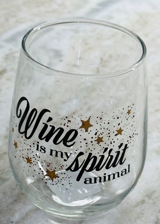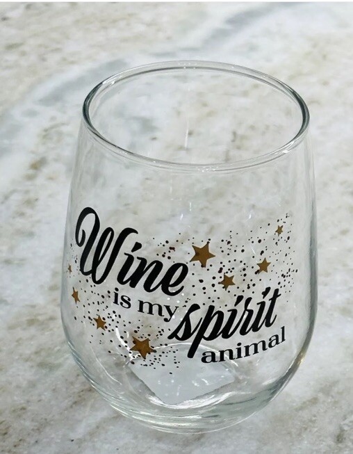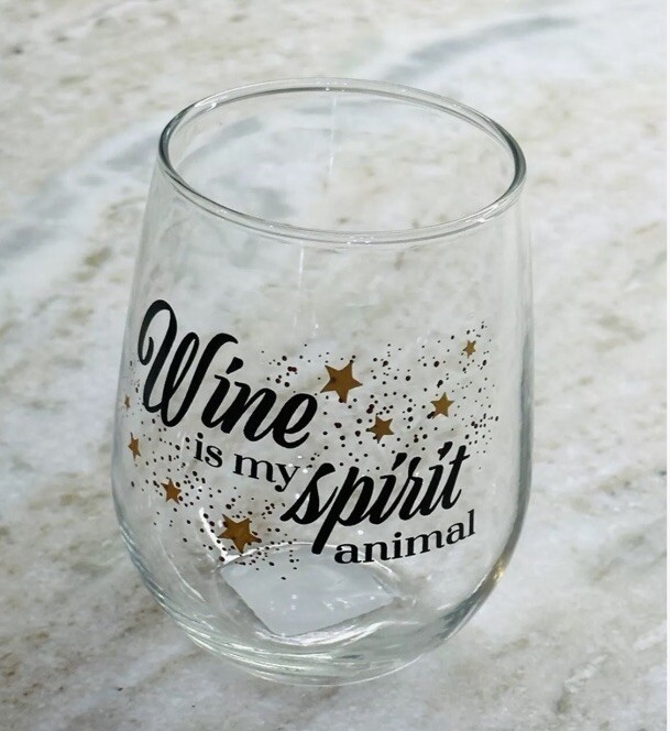 Indulge in your love for wine with this stunning stemless wine glass. The glass has a capacity of 17 oz and is perfect for all occasions. The clear glass is embellished with glitter, adding a touch of glamour to your drinkware collection. The wine glass is made of high-quality glass material and has a round shape. It features an inspirational quote, "Wine is my Spirit animal", making it a great addition to your home bar. This wine glass is perfect for adults and makes a great gift for wine lovers.