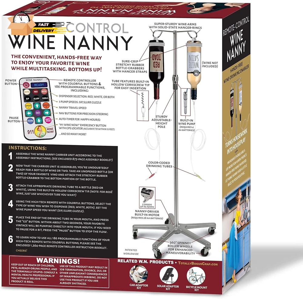 Store New Arrivals Add to Favorite View Feedback Contact "Wine Nanny" Prank Gift Box - Perfect Gag Gift for Funny White Elephant Description Item model number 1234 Unit Count 1.0 Count Style Wine Nanny Number of Items 1 Color Red Product Dimensions 11.25"L x 9"W x 3.25"H Material Glass Package Dimensions 12.13 x 11.22 x 0.63 inches Item Weight 3.52 ounces Theme Funny,Elephant Manufacturer recommended age 18 - 18 years Occasion Bridal Shower, Christmas, Birthday Manufacturer Brands Is Discontinued By Manufacturer No Cartoon Character Elephant Included Components Joke Components The ultimate joke gift box designed to look like a real, upscale product box for an absolutely ludicrous product that doesn’t really exist. Every panel is a hilarious parody of product info, selling points, instructions and warnings - all of which appear at first glance to be plausible. Transforms any gift into “that gift!” that people will be giggling about for a long time. Assembled box size is 11.25” x 9” x 3.25” - perfect for many different types of gifts. The gift box is empty, of course. The “product” is a joke. SATISFACTION GUARANTEED Gift giving is an art form, and this Wine Nanny joke gift box will undoubtedly elevate your artistry to a whole new level, helping you solidify your reputation as the most awesome gifter ever. What better way to create a memorable gifting moment than to prank your friend or loved one by disguising your present as something completely ridiculous, yet possibly desirable for serious wine enthusiasts who have secretly dreamed of having such a gadget. When the recipient unwraps your gift and sees the package for what they’re supposedly getting, there is bound to be a plethora of reactions, ranging from puzzlement, to possibly delight at the thought of having wine delivered to their mouth by a remote control IV stand on wheels, to “wait, how does that big thing fit in this box?” Whatever the responses, laughs are sure to follow once they realize they’re being merrily pranked. (Note: for those who say "oh darn, I was really hoping for a remote control wine nanny", you should probably have a nice glass of their favorite vino at the ready to sooth their disappointment) Ideal for any occasion - Christmas, holidays, birthdays, white elephant gift exchanges, bachelorette parties, bridal showers, or any time you need a gift that will definitely stand out from the rest. These hilariously tongue-in-cheek gift boxes are guaranteed to liven up any gift giving event, not to mention provide priceless photo opps and stimulate giggle-worthy commentary. Unlike the non-existent product the box purports to hold, these high quality gift boxes are super easy to assemble and use. Just unflatten it, close the bottom flap put your real gift(s) inside through the top flap, wrap it up with gift paper (or not, if you’re a minimalist), and give it! Let the hilarity ensue! ABOUT US We offer the best prices around on high quality products. Our E-store includes media such as books, movies, music and games while offering electronics, toys, sporting apparel, clothing, tools, general home, garden items and more. SHIPPING We are always working hard to ensure your package arrives as soon as possible. Please understand that some factors like weather, high postal traffic, and the performance of shipping companies are outside of our control. We offer free shipping to the lower 48 states and ship within 2 business days of payment, usually sooner. We do not accept P.O. Boxes. Please provide a physical address. For shipping outside of the continental USA, we only use eBay's Global Shipping Program.The item is shipped to KY and then sent to the rest of the world. International customers are responsible for all duties and taxes. Continue to check out in order to calculate costs for shipping the item to your country. Messages regarding eBay's Global Shipping Program MUST be directed at eBay EXCLUSIVELY. RETURNS We offer a 30-Day Return Policy on items which you are not completely satisfied with. You have the option for a full-refund or an exchange of the item. No returns are available on items shipped outside of the USA. PAYMENT We accept PayPal. CONTACT US This page content is yet to come Please ad us to your favorite seller and visit again later Thank You CUSTOMER SATISFACTION We try our very best to make sure every customer is completely satisfied. If there's a problem, message us! We're happy to help. WE ACCEPT Copyright © 2021 AutoDS. | All Rights Reserved