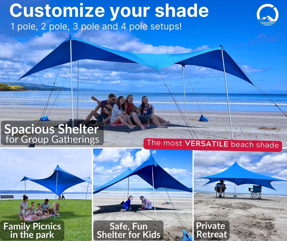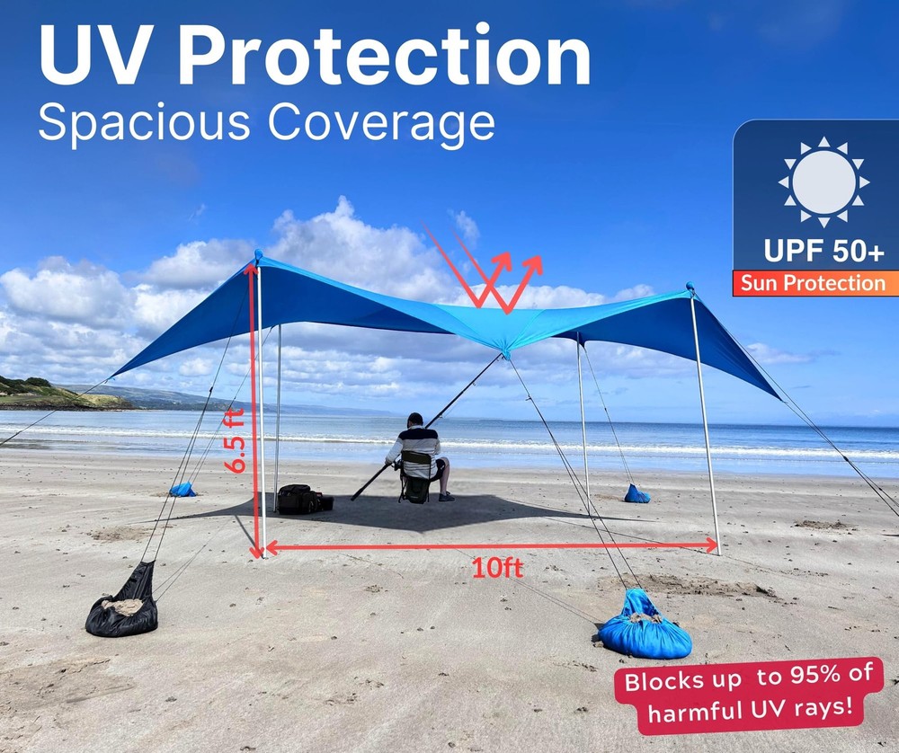 EFFORTLESS POP-UP SETUP & UV PROTECTION: Experience hassle-free assembly with our pop-up design, offering UPF 50+ protection. Perfect for creating a cool retreat at the beach, in your backyard, or at outdoor festivals. STABILITY WITH SANDBAGS & HEAVY-DUTY DESIGN: Our beach tent includes durable sandbags and reinforced poles for secure setup on both grass and sand. This wind-resistant shelter stays stable even in breezy conditions. REINFORCED STITCHING FOR TEAR-RESISTANT DESIGN: The canopy is expertly stitched in sections, allowing it to evenly distribute tension and minimize stress on the seams, making it more resistant to tearing over time. CUSTOMIZABLE SHADE & LARGE COVERAGE: Easily adjust the canopy for privacy or group shade, with a sail-inspired setup for maximum comfort. Fits up to 8 people, making it great for family use. PORTABLE & TRAVEL-FRIENDLY: Lightweight and compact, this tent comes with a carry bag featuring a padded shoulder strap. Perfect for summer trips, outdoor festivals, and family gatherings. Click 'ADD TO CART'!