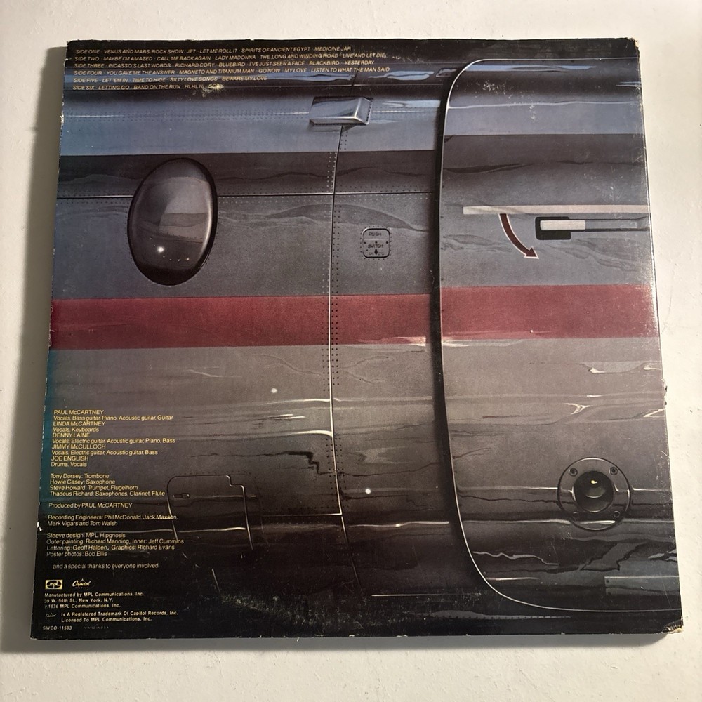 The product is a vinyl record titled "Wings Over America" by the artist Wings, released in 1976 by Capitol Records. The 12" record comes in a cardboard sleeve and is graded as Very Good (VG) in both record and sleeve condition. It features the original inner sleeve and cover, making it a sought-after collector's item for music enthusiasts looking for classic rock albums from the 1970s.