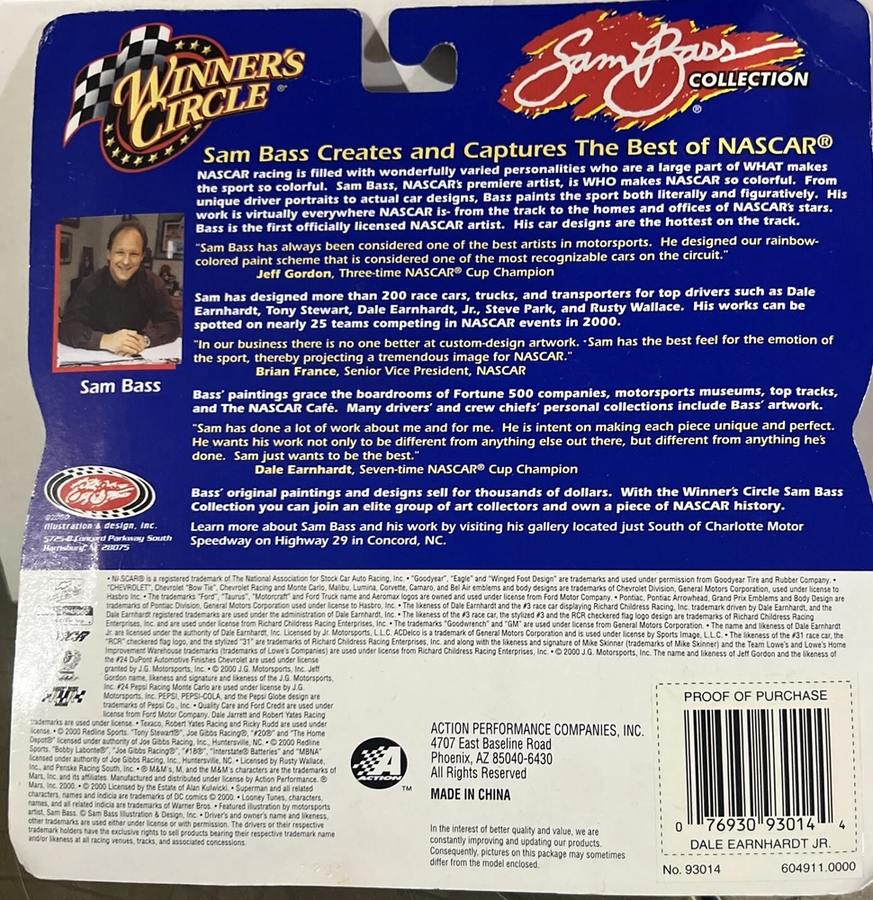 This exclusive limited edition Winner's Circle Sam Bass Collection diecast car is a must-have for any NASCAR fan. Featuring Dale Earnhardt Jr. as the driver, this 1:43 scale model is a beautifully crafted replica of the iconic Chevrolet Monte Carlo. The red color and art print series race design make it a unique addition to any collection. Made of high-quality diecast material, this unopened box model is perfect for collectors of all ages. The limited edition car is a tribute to the "Spirit of the Night" character family and comes with a recommended age range of ages 4 and up. This model was manufactured in China and is a part of the Winner's Circle brand series. Get your hands on this exclusive collectible today!