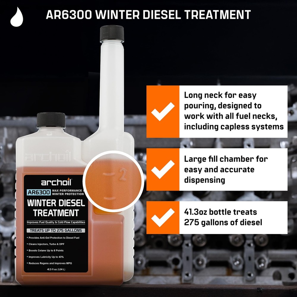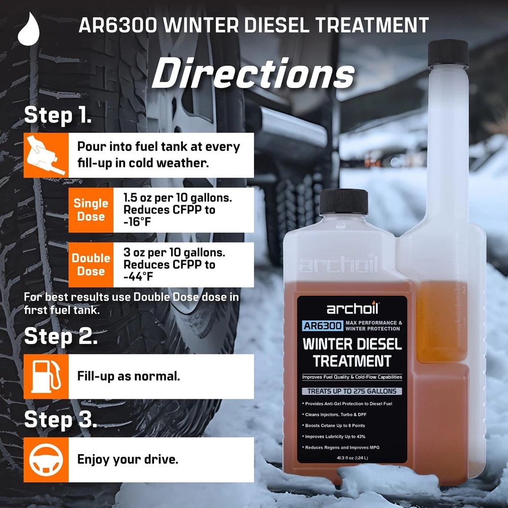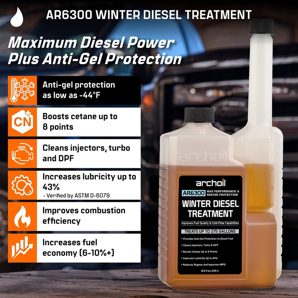 Archoil AR6300 Winter Diesel Treatment - Treats 275 Gallons - Additive for All Diesel Vehicles Includes Anti-Gel Protection Anti-gel: Prevents diesel fuel from gelling and plugging the fuel filter Promotes complete combustion for improved performance and boosts cetane Protects fuel pump and injectors from wear and failure Helps dissolve sludge and other fuel system deposits Treats 275 gallons of diesel - use at every fill-up AR6300 Winter Diesel Treatment is a concentrated fuel treatment which is added to every tank of diesel to boost performance, ensure fuel quality, protect your fuel system and protect against gelling in cold weather. AR6300 promotes a more complete combustion which improves efficiency, power and response. AR6300 Features -- Cold Filter Plugging Point Depressant: Prevents diesel fuel from gelling and plugging the fuel filter -- Combustion Modifier: Promotes complete combustion -- Lubricant: Protects fuel pump and injectors from wear and failure, lubricates upper cylinder -- Dispersant/Detergent: Helps dissolve sludge and other fuel system deposits. Restores degraded fuel -- Stabilizer: Enables extended fuel storage -- Corrosion Inhibitor: Protects the fuel system from corrosion -- Demulsifier: Helps separate water from diesel fuel -- Improves cetane Archoil AR6300 Winter Diesel Treatment - Treats 275 Gallons - Additive for All Diesel Vehicles Includes Anti-Gel Protection Archoil AR6300 Winter Diesel Treatment - Treats 275 Gallons - Additive for All Diesel Vehicles Includes Anti-Gel Protection Archoil AR6300 Winter Diesel Treatment - Treats 275 Gallons - Additive for All Diesel Vehicles Includes Anti-Gel Protection Archoil AR6300 Winter Diesel Treatment - Treats 275 Gallons - Additive for All Diesel Vehicles Includes Anti-Gel Protection Archoil AR6300 Winter Diesel Treatment - Treats 275 Gallons - Additive for All Diesel Vehicles Includes Anti-Gel Protection Archoil AR6300 Winter Diesel Treatment - Treats 275 Gallons - Additive for All Diesel Vehicles Includes Anti-Gel Protection Archoil AR6300 Winter Diesel Treatment - Treats 275 Gallons - Additive for All Diesel Vehicles Includes Anti-Gel Protection Archoil AR6300 Winter Diesel Treatment - Treats 275 Gallons - Additive for All Diesel Vehicles Includes Anti-Gel Protection Archoil AR6300 Winter Diesel Treatment - Treats 275 Gallons - Additive for All Diesel Vehicles Includes Anti-Gel Protection Archoil AR6300 Winter Diesel Treatment - Treats 275 Gallons - Additive for All Diesel Vehicles Includes Anti-Gel Protection Shipping We offer FREE shipping on all orders! We ship within Three business days of payment, usually sooner. We use a selection of shipping services such as UPS, FedEx, USPS etc. We only ship to the lower 48 states, no APO/FPO addresses or PO Boxes allowed. Local pickups and combined shipping options are not provided at this time. Return You can return a product for up to 30 days from the date you purchased it. Any product you return must be in the same condition you received it and in the original packaging. Please keep the receipt. Payment We accept payment by any of the following methods: Please pay as soon as possible after winning an auction, as that will allow us to post your item to you sooner! Feedback Customer satisfaction is very important to us. If you have any problem with your order, please contact us and we will do our best to make you satisfied. Contact Us If you have any queries, please contact us via ebay. We usually respond within 24 hours on weekdays. Please visit our eBay store to check out other items for sale! Thank you for shopping at our store.