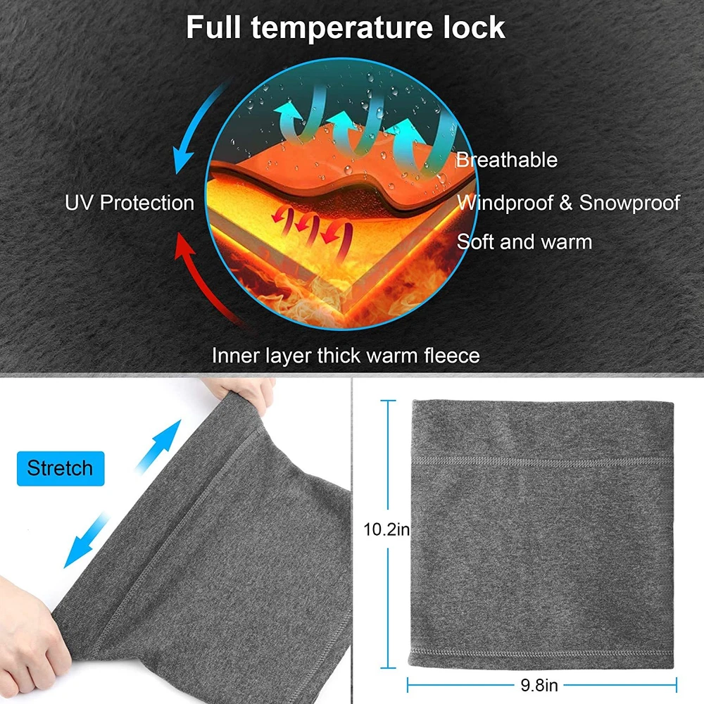 Product Description: Features: 1. NECK WARMER: Double-layer neck warmer is made of thicken fleece fabric which has the premium thermal retention to protect yourself & family from the heaviest winter weather. 2. SIZE: Length 10.2", width 9.8". Longer design to cover your face and neck for better wind and cold protection. Four needle six thread sewing seams makes it more durable. Stretchable to fit most heads to provide the ultimate winter protection. Perfect fit for women men and children. And it will keep original shape even washed many times. 3. MULTIFUNCTIONAL: Wearing comfort is the ideal choice for winter and cold weather, no more worry about cold, wind, dust and sun's uv ray while skiing, motorcycling, running, biking, trekking, mountain climbing, fishing, snowboarding, cycling in winter. 4. MULTI-USE: Multifunctional: Besides as a neck gaiter, you can use this item as ear warmer, beanie, pirate cap, balaclava, ski face mask, motorcycle face mask, snow face mask, cycling face mask and more. Package Included: 1x Winter Neck Warmer Gaiter