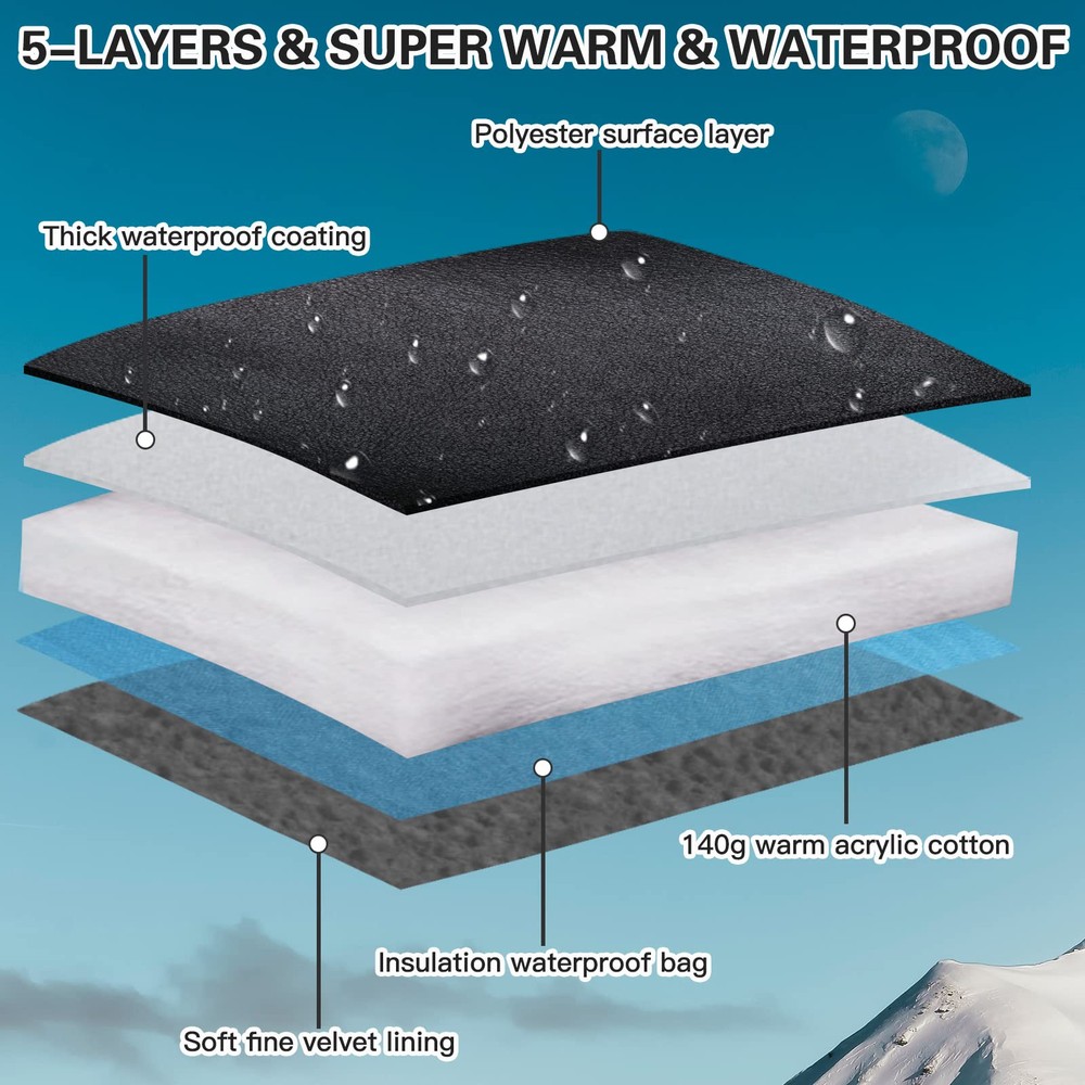 UPGRADED 5 LAYERS OF THICK GLOVES: The waterproof gloves are constructed in 5 layers including windproof T800 four-sided elastic surface polyester, over 140G premium cotton, and ultra-soft polar fleece lining, which is isolated your hands from cold even in -20℉ weather. MULTI-LAYER WATERPROOF & EXTREMELY DRY AND WARM: mens winter gloves are made of water-repellent polyester out-layer fabric and the TPU waterproofer inlayer, which play an excellent role in blocking moisture and wind chill. The TPU membrane inside serves as a second barrier against small molecular water droplets formed by melting snow and keeps your hands dry and warm. SEEM TO HAVE NOTHING ON: Our womens winter gloves own anti-slip and touch screen functions, The palm of our waterproof gloves for men is covered with PU synthetic leather, and the special concave-convex rubber dots can enhance grip force. In addition, TPU leather is added with high environmental protection carbon molecular elements and has conductivity. No need to take off your waterproof gloves women to answer phones, texting, take photos, and operate touchscreen devices. ALL-ROUND COMFORT AND CONVENIENCE: Anti-losing buckles and elastic rope reduce the probability of snow gloves women loss. And it is difficult for the cold wind to invade the glove inside with the adjustable wrist strap and the elastic cuff. Don't hesitate! It's definitely a great winter gift for friends and relatives. UNISEX SIZE & PERFECT FOR OUTDOOR ACTIVITIES: Please measure your hands’ circumference according to the size chart before purchasing. After you get the touchscreen gloves, just enjoy yourself in skiing, snowboarding, skating, hiking, climbing, running, cycling, driving, snow shoveling, and other outdoor winter activities. If you have any matter or dissatisfaction with our ski gloves men, please don't hesitate to contact us, we are honored to solve it for you.