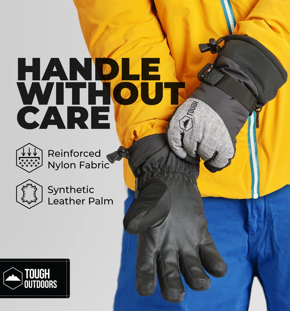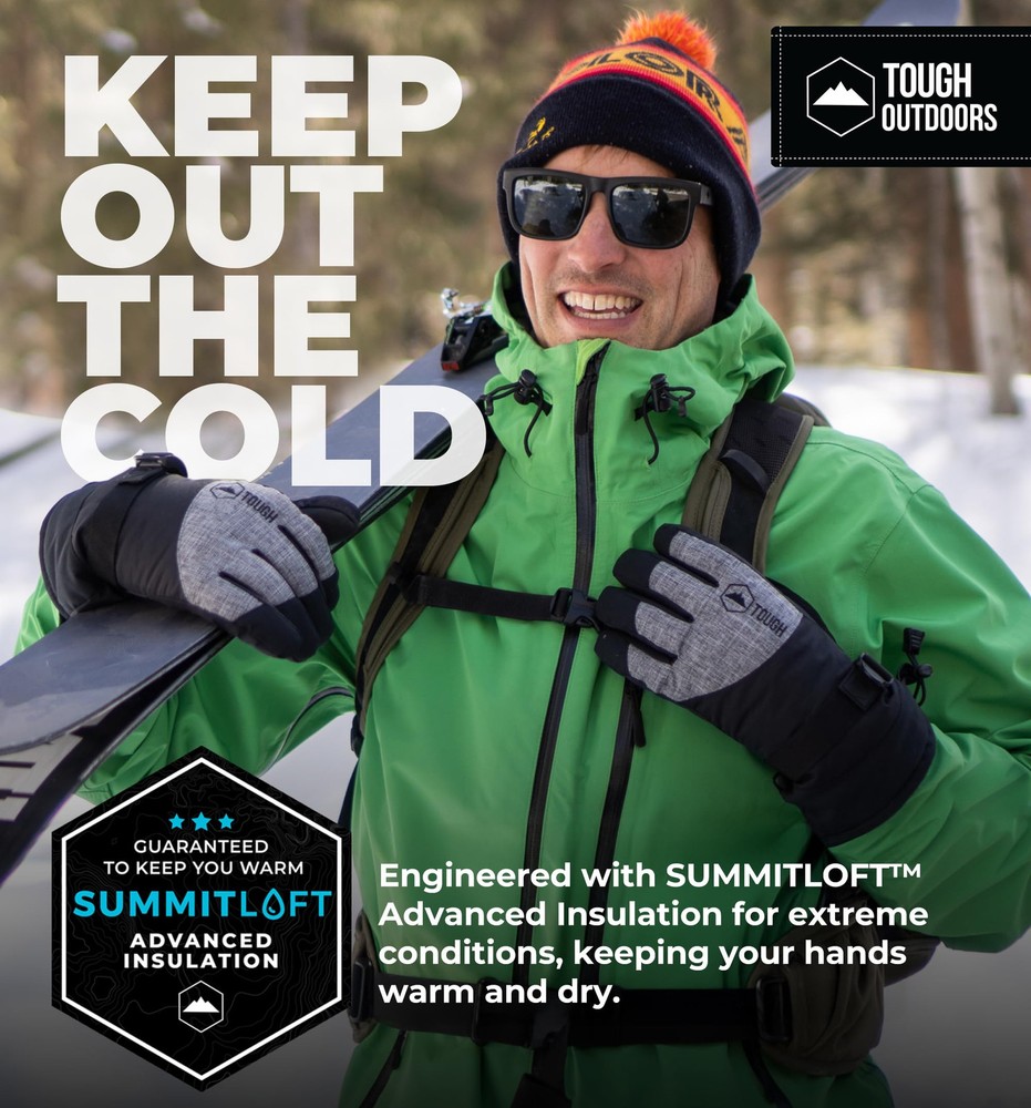 BEAT THE COLD: Stay warm with insulated winter gloves men and women love — featuring our SUMMITLOFT insulation to keep your hands cozy and comfortable during snowboarding, skiing, and other winter activities. BREATHABLE & MOISTURE-WICKING: Our ski gloves are designed with a water and wind-resistant nylon shell and a TPU breathable membrane that lets moisture escape, keeping your hands dry while you stay active in cold weather. BUILT TO LAST: Crafted with a synthetic leather palm and reinforced all-nylon outer layer, these durable waterproof womens and mens winter gloves are designed for long-lasting performance. ENHANCED GRIP: The double-faced synthetic leather palm on our insulated gloves increases grip and protects your hands — perfect for holding ski poles, shovels, or snowmobiles with warm gloves. SNUG & SECURE FIT: Featuring an adjustable wrist buckle and drawstring closure, these women's and men's winter gloves ensure a good fit, keeping you warm and protected all day.