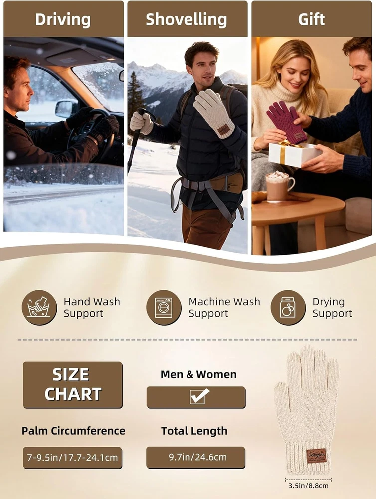 These winter gloves feature a premium blend of alpaca wool and acrylic fiber. The alpaca wool lining offers an exceptionally soft feel, while the acrylic component enhances durability, effectively reducing pilling to ensure the gloves maintain their original shape and elasticity over time. Touchscreen-compatible fingertips. The thumb and index finger feature a special conductive fiber process, allowing effortless operation of smartphones, tablets, and other touchscreen devices. No need to expose skin to the cold to send messages or take photos. Non-slip palm for secure grip. The palm surface features a high-friction silicone dot matrix coating, providing a firm, slip-resistant grip on steering wheels, shopping bags, ski poles, or phone cases. Stay in control, stay composed. These unisex gloves are the perfect companion for an active lifestyle. Whether commuting daily, hitting the slopes, or braving snowy outings, they deliver unmatched comfort and exceptional performance for all winter adventures. The perfect holiday gift. Looking for the ideal present? These unisex gloves are the answer. Combining practicality, comfort, and style, they make an excellent gift.