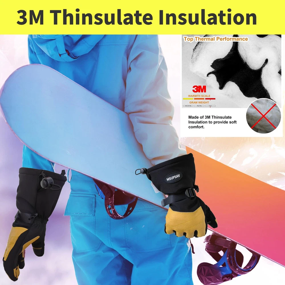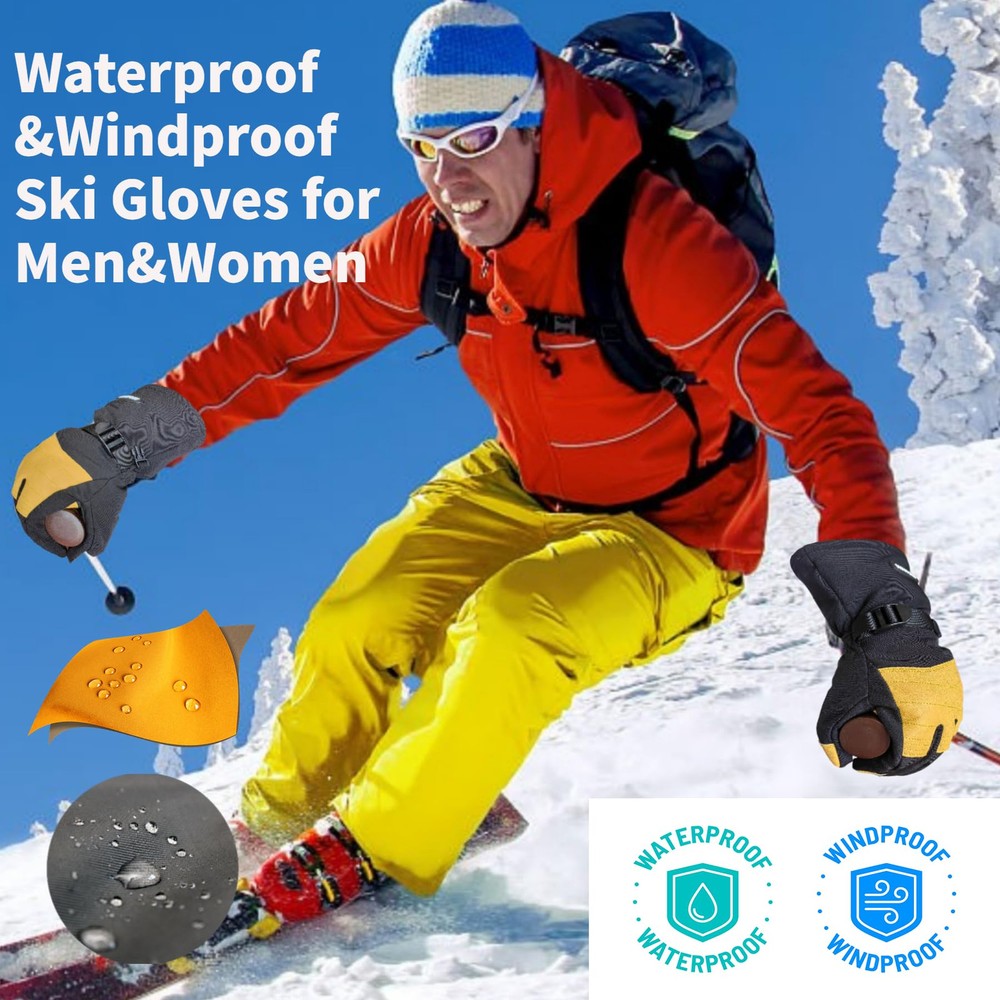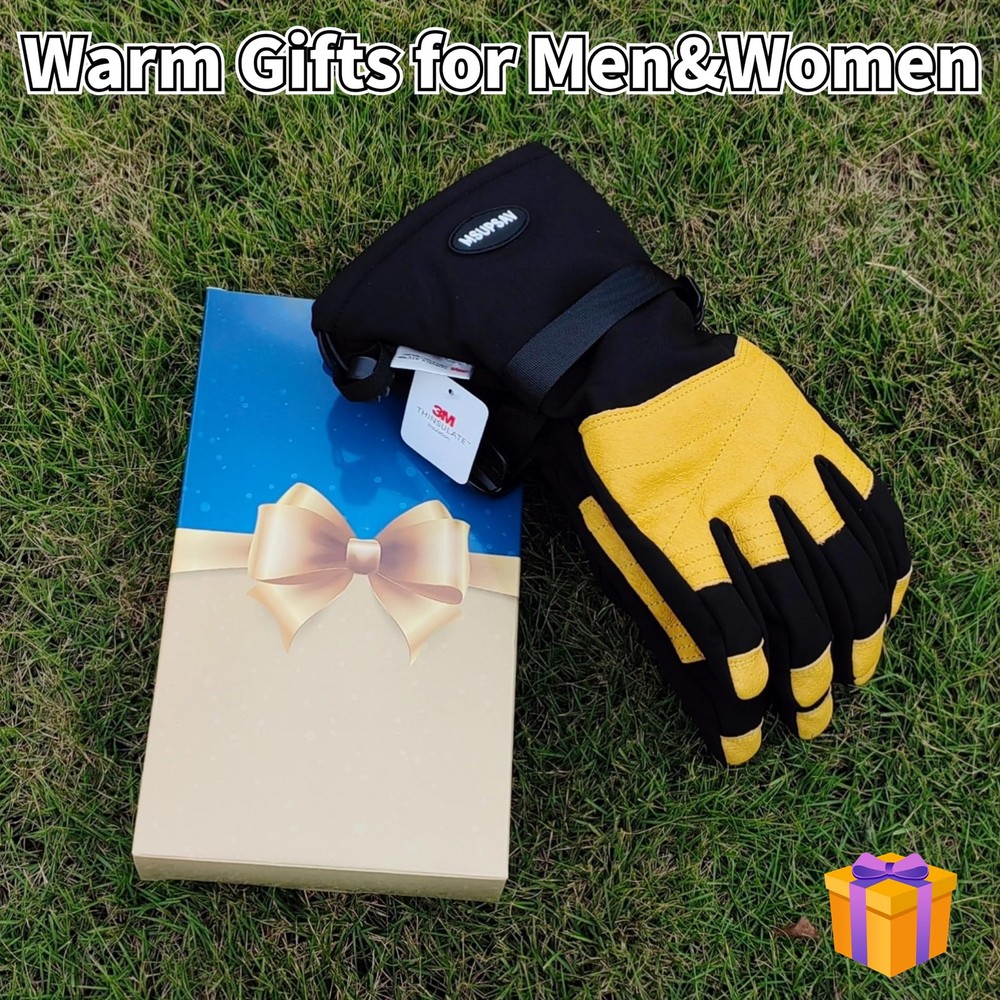 INSULATION WINTER GLOVES:The gloves are insulated with warm and powerful thinsulate,which traps body heat efficiently and provides nearly twice the warmth of other material. Thinsulate is also highly breathable and moisture-wicking. Suitable for Mid-winter conditions. which is thick enough to keep hands warmth in cold chilly weather in skiing, snowboarding, winter riding, hiking and other snow sports etc. WATERPROOF &WINDPROOF FUNCTION SKIING GLOVES:The composite three-layers soft shell prevents cold wind and snows outside in riding and skiing. The insert waterproof TPU membrane provides entirely guards to keep hands dry in long time snowsports at outdoors.Breathable membrane technology keeps your hands dry and allows sweat out, ensuring dry comfort under snowy, sweaty,damp or rainy. HIGH DURABILITY AND ABRASION RESISTANCE WATERPROOF GLOVES:Waterproof premium Anti-slip grain leather palm and back of hand both of padded offers enhance grip and long-lasting durability to add extra protection and resistance to wear.The part between thumb finger and the index is reinforced with grain leather to protect against thumb joints pain in grip and ensures durability.Durable fabric on the back for ensures safety during skiing, cycling,driving and working. BEST GIFTS FOR MEN AND WOMEN:Birthday gifts for men&women,mom,dad,grandpa,grandma,friends and family.The unique presents also suitable as a gift on birthday,mothers day,valentines day,thanksgiving day,gardening and christmas. SERVICE AND ASSURANCE-All products come with 30-day hassle free return and lifetime satisfaction assurance. If the gloves do not meet your expectation or you have any concerns, please don't hesitate to contact us because we are always here to help until problem completely solved!