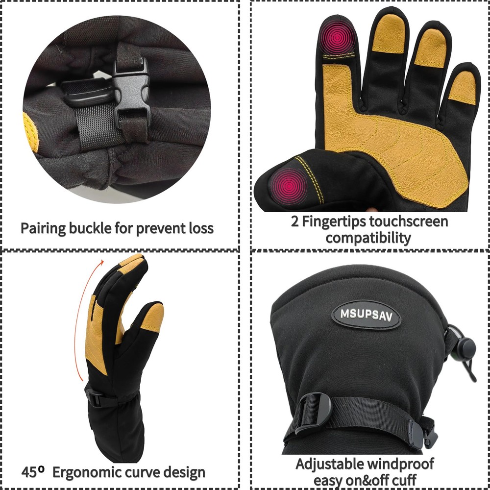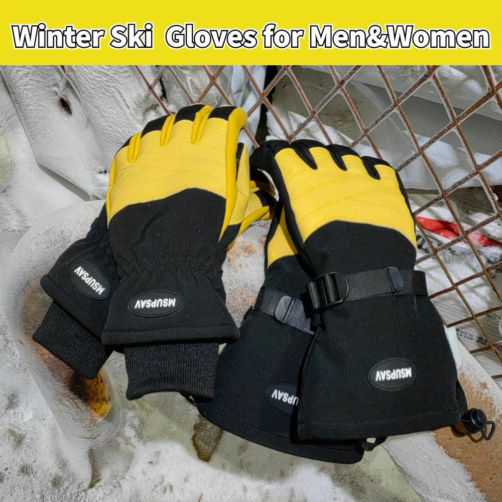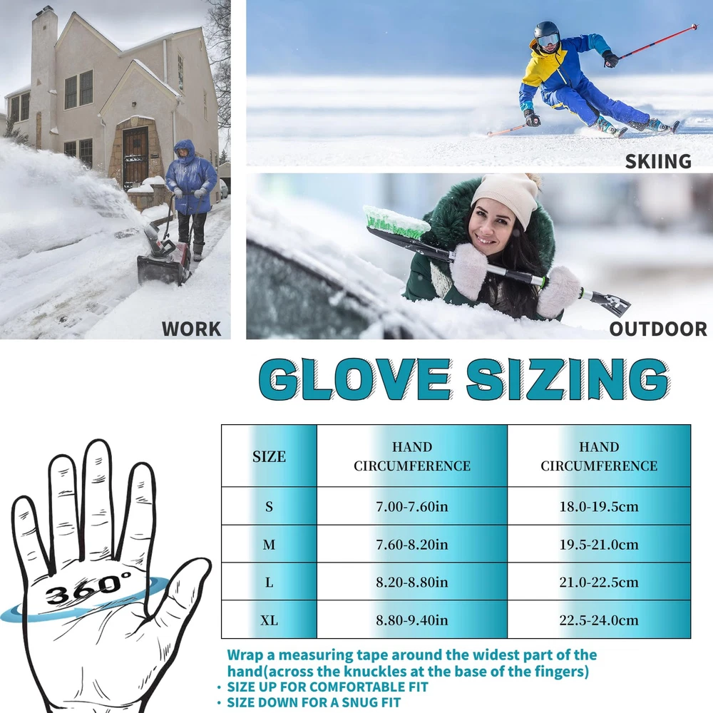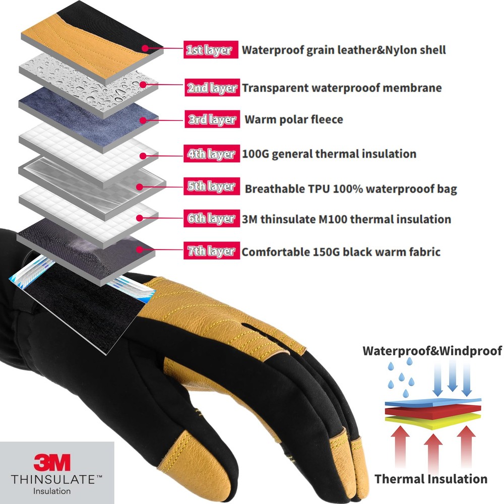 INSULATION WINTER GLOVES:The gloves are insulated with warm and powerful thinsulate,which traps body heat efficiently and provides nearly twice the warmth of other material. Thinsulate is also highly breathable and moisture-wicking. Suitable for Mid-winter conditions. which is thick enough to keep hands warmth in cold chilly weather in skiing, snowboarding, winter riding, hiking and other snow sports etc. WATERPROOF &WINDPROOF FUNCTION SKIING GLOVES:The composite three-layers soft shell prevents cold wind and snows outside in riding and skiing. The insert waterproof TPU membrane provides entirely guards to keep hands dry in long time snowsports at outdoors.Breathable membrane technology keeps your hands dry and allows sweat out, ensuring dry comfort under snowy, sweaty,damp or rainy. HIGH DURABILITY AND ABRASION RESISTANCE WATERPROOF GLOVES:Waterproof premium Anti-slip grain leather palm and back of hand both of padded offers enhance grip and long-lasting durability to add extra protection and resistance to wear.The part between thumb finger and the index is reinforced with grain leather to protect against thumb joints pain in grip and ensures durability.Durable fabric on the back for ensures safety during skiing, cycling,driving and working. BEST GIFTS FOR MEN AND WOMEN:Birthday gifts for men&women,mom,dad,grandpa,grandma,friends and family.The unique presents also suitable as a gift on birthday,mothers day,valentines day,thanksgiving day,gardening and christmas. SERVICE AND ASSURANCE-All products come with 30-day hassle free return and lifetime satisfaction assurance. If the gloves do not meet your expectation or you have any concerns, please don't hesitate to contact us because we are always here to help until problem completely solved!