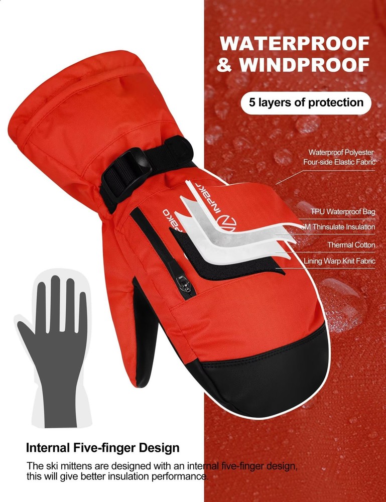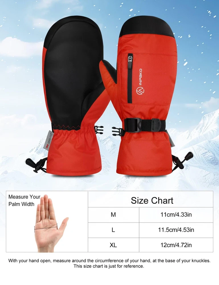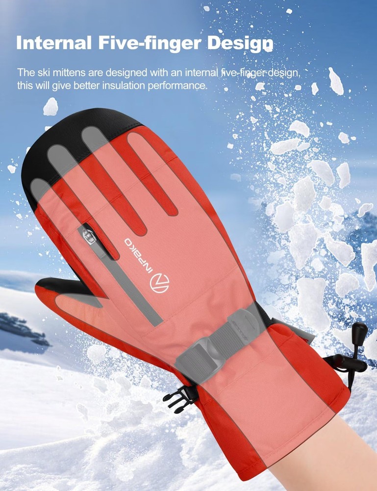 ✅【Gloves Inside Mittens】 The inner lining of the mittens is glove-shaped, it has five finger grooves, and each finger is separated inside the mittens in a way that prevents sweaty hands and keeps your hands warm and dry while being more flexible. ✅【3M Th-insulate Insulation】 These ski mittens are insulated with warm and lightweight 3m material, This material is lightweight and can effectively retain heat, preventing heat loss, thus providing efficient thermal properties, this snow winter gloves can keep hands warmth in cold chilly weather in skiing, snowboarding, winter riding, hiking and other snow sports. ✅【Waterproof & Windproof & Breathable】 This winter ski glove is made of 5-layer soft- shell material. Built-in TPU waterproof film and wind film to protect your hands for use in an ice cellar or any extreme winter environment. Maximum cold resistance temperature -10°F. Leather palm for touch screen and non-slip. ✅【More Details】 1. The adjustable wrist strap on the palm of the snowboard gloves can protect against the cold outside air, but also can be adjusted to a comfortable level of elasticity. 2. The waterproof zipper pocket designed on the back of the hand can be used to store credit cards and other small items, so it is easy for you to access. 3. The anti-lost button on the side allows you to find the ski glove easily. 4. The elasticized design on the wrist makes it more comfortable for you to wear. ✅【Multiple Applications】 The snow mittens are suitable for most winter sports such as skiing, snowboarding, snowmobiling, ice fishing ,shoveling snow, make a snowman, riding, cycling, motorcycle. It can also be worn for daily warmth in winter, which is a good gift choice for him/her.
