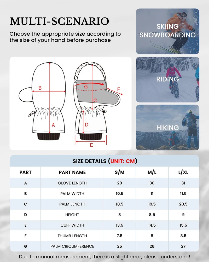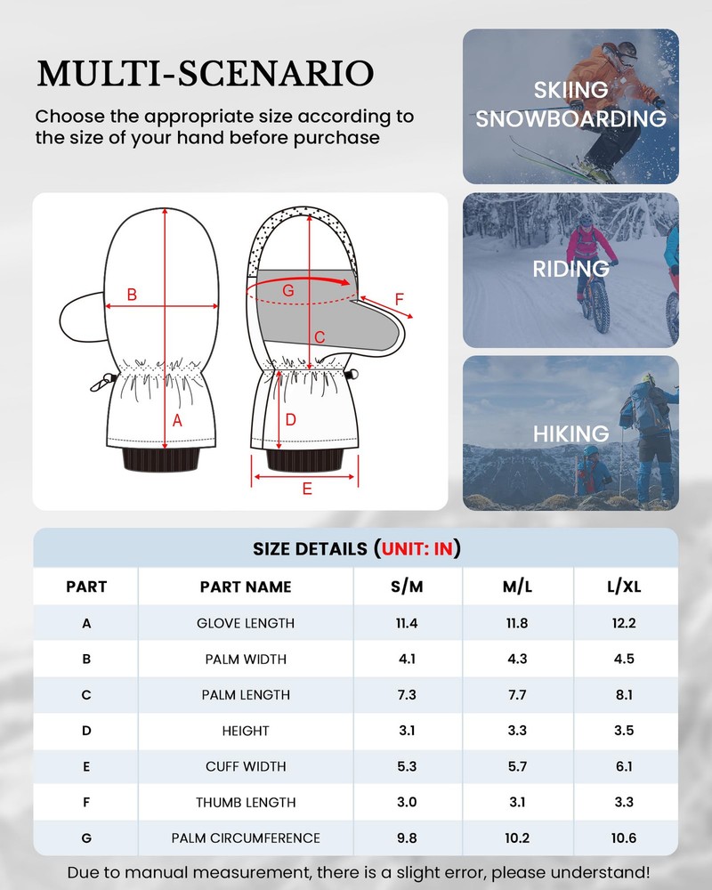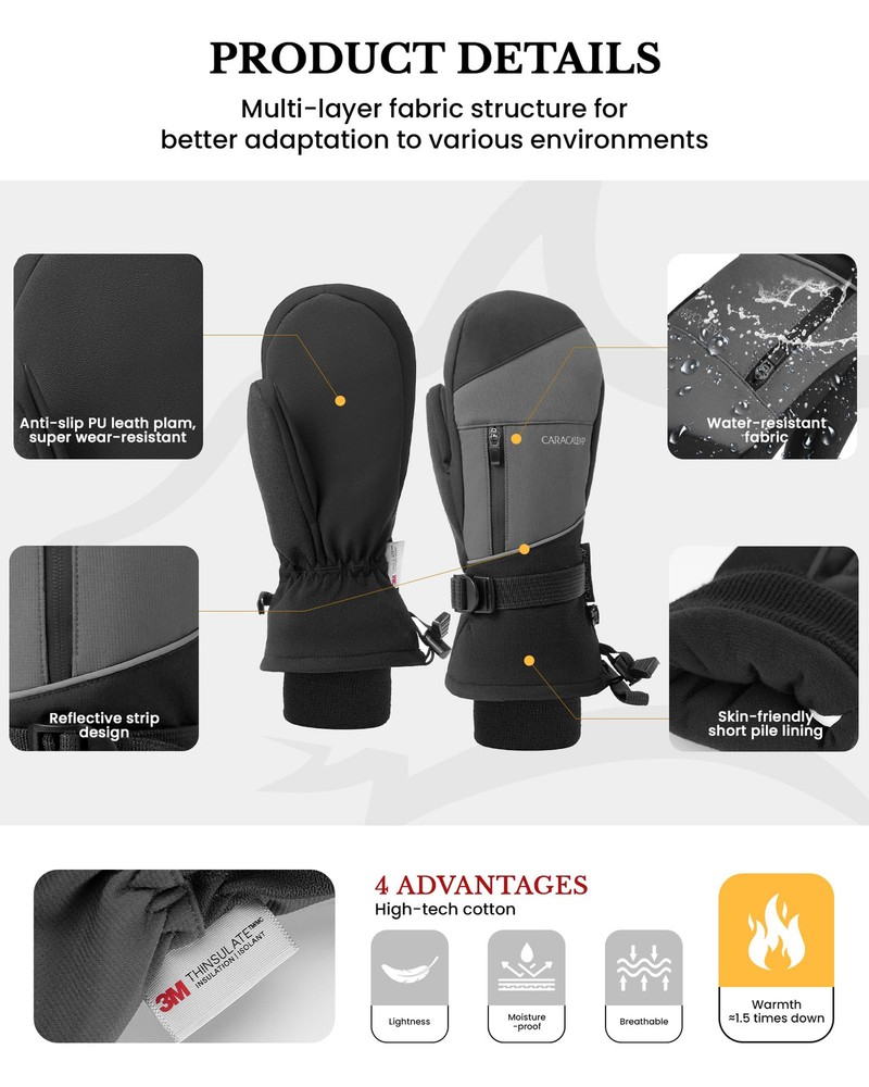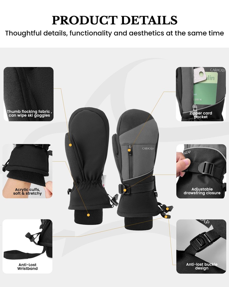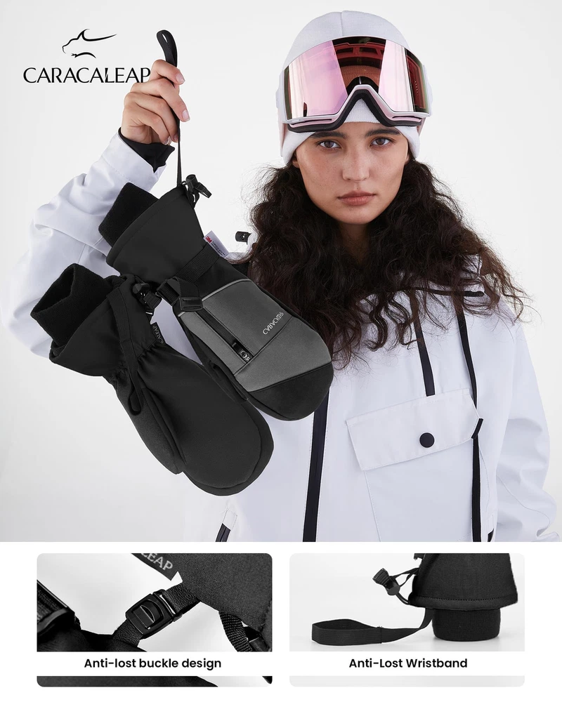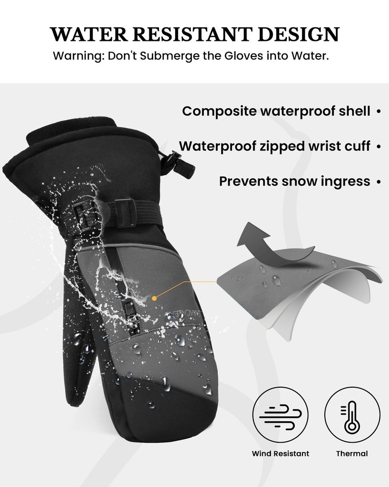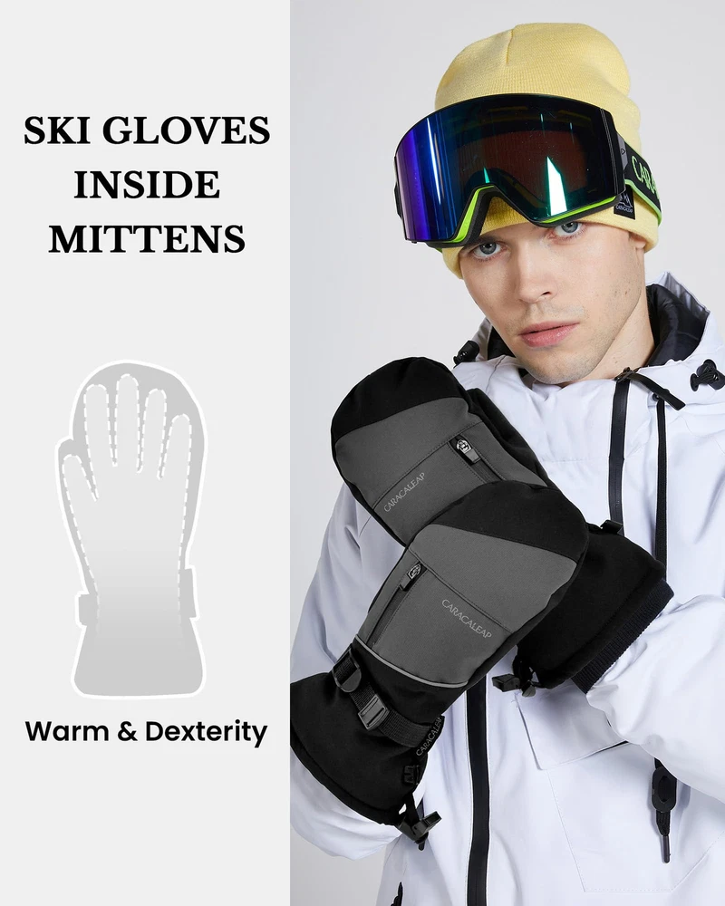 ❤️🔥Super Warm & High Quality: Waterproof Snow Mittens are designed with multiple layers of insulation. The exterior features a 100% polyester shell with a TPU waterproof coating to fend off cold and moisture. The soft fleece lining and Thinsulate insulation Inside of Snow Mittens ensure rapid hand-warming, even in the most frigid conditions. With our mittens, you can count on your hands staying warm and cozy, allowing you to enjoy extended hours on the slopes. ❤️🔥Waterproof & Breathable: Waterproof Snow Mittens for men & women boast a high-density polyester shell combined with a TPU waterproof and breathable membrane on the surface. This combination shields your hands from moisture while allowing sweat and heat to escape, ensuring your hands remain dry and comfortable throughout your skiing adventures. ❤️🔥Internal 5-finger Design: Our Waterptoof Snow Mittens provides a special design feature where the fingers are individually encased within a mittens, allowing for a more precise and flexible movement of each finger while still providing protection or coverage. The Mittens provide warmer and more comprehensive protection and cushioning than traditional 5-finger gloves, while offering greater flexibility and lightness compared to traditional mittens. ❤️🔥Durable and Grip-Enhancing:The palm of our cold weather Waterproof Snow Mittens is constructed from durable and soft faux sheepskin PU material. It not only enhances your grip on ski poles and shovels but also maintains finger dexterity. This ensures your safety on the slopes and empowers you to tackle any terrain with confidence. The microfiber on the thumb even facilitates easy goggle wiping. ❤️🔥Adjustable Cuffs & Anti-Loss: Our Waterproof Snow Mittens feature adjustable wrist straps and dual drawstring closures at the wrist and cuff, providing a snug fit and preventing snow and cold air from infiltrating. These adjustments can be tailored to your preference. The wrist straps and a small clasp for linking both gloves ensure you'll never lose your gloves. In addition, the Mittens have a zippered pocket that can also store cards, keys, cash or other small items.