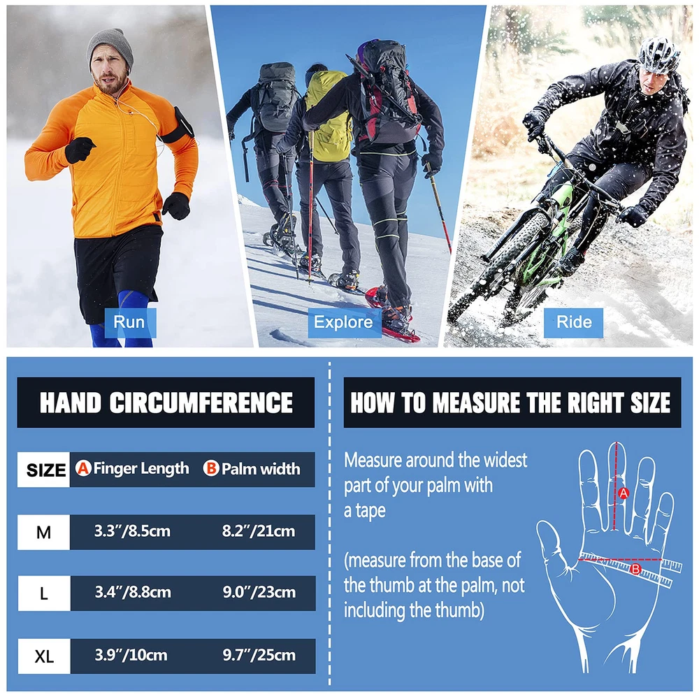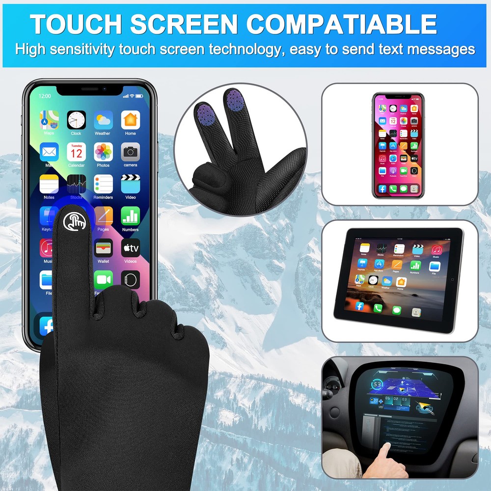 ð¥ð¥ãWARM AND COMFORTABLEãWinter gloves are made of premium Dacron and soft 3M Thinsulate Insulation cotton liner,which are moisture-wicking and breathable.Flannel lining and elastic cuffs enhance warmth and elasticity. Prevents cold, wind and rain from entering,keeps hands warm even when the temperature drops below zero. ð¥ð¥ãSENSITIVE TOUCHSCREENãAll fingertips are coated with touch conductive material, which maximizes the ratio of dexterity and warmth.You can operate any smart phone/tablet/car touch screen,without taking off warm gloves. convenient and flexible for outdoor calls, texting, typing, playing games or viewing navigation. ð¥ð¥ãANTI-SLIP DESIGNãWinter ski gloves are covered with full anti-skid PU leather on the palm to increase friction and abrasion resistance. Help you to hold ski poles, shovels or snowmobiles safely and securely, and protect our fingers from strong winter winds. ð¥ð¥ãWINDPROOF & WATERPROOFãMulti-layer soft shell moisture-proof fabric and TUP layer reinforced waterproof membrane. The tight elastic cuffs fit your wrist comfortably and are wind and rainproof. Which can keep hands warm and dry even in snow or light rain when you do outdoor sports or daily wear. ð¥ð¥ãBE YOUR BEST WINTER PARTNER ãWinter warm gloves are an excellent practical gift for men women, family or friends. Perfect for cycling, running, driving, horseback riding, hiking, mountaineering, golf, fishing, shooting, snow shoveling, cross-country skiing, snowmobiles and Other outdoor winter activities. If you encounter size or other problems, please feel free to contact us.