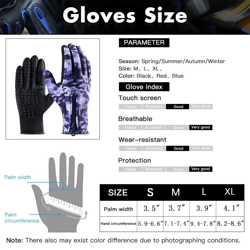 Features: 1. High-grade diving fabrics, feel is exquisite, soft and elastic, shockproof, moisture, elasticity, waterproof, etc. Outdoor riding ski gloves, really professional wind proof fabric warm and breathable, windproof and waterproof, portable and flexible! 2. Suitable for winter outdoor sports, like horse riding, skiing, mountaineering, running, mountaineering driving and other outdoor exploration activities. 3. When you climb a mountain, it can effectively protect your hands, to prevent your hand scratches and wear; 4. When you riding, it can non-slip, windproof, warm; Effective avoid slip when driving; 5. When you take a photo, it can prevent the camera from slipping; 6. Warm fleece inside: the real wind soft fleece fabrics, heat preservation performance is good, to bring you the comfortable close skin wear experience. 7. The gloves at the back have zippers. So you can adjust the size to fit your hand comfortably. The silicone on the palm of the glove can better hold the handlebar even on difficult roads. 8. Capture every moment of winter adventure without taking off your gloves! These gloves are touchscreen compatible, so your fingers don't numb with cold when you take pictures of the rockies from a ski lift. 9. Winter riding gloves are made of high-density waterproof material to protect your hands from getting wet. The avoid-skid leather on the palm makes outdoor sports such as cycling safer. 10. The upgraded fabric can block all the wind outside the hand, and the zipper design provides a comfortable and firm fit, which can block the wind and cold of the wrist. Description: Material: Fleece, Diving Cloth Package Included: 1 Pair of Winter Gloves Notice: 1. Please allow 2-3% error due to manual measurement. 2. The colors may have different as the difference display, please understand. Contact US: Your satisfaction is our highest priority. Please contact us if you have any questions or requests about our products or service. We are always glad to assist you and stand by our products.