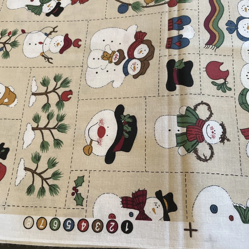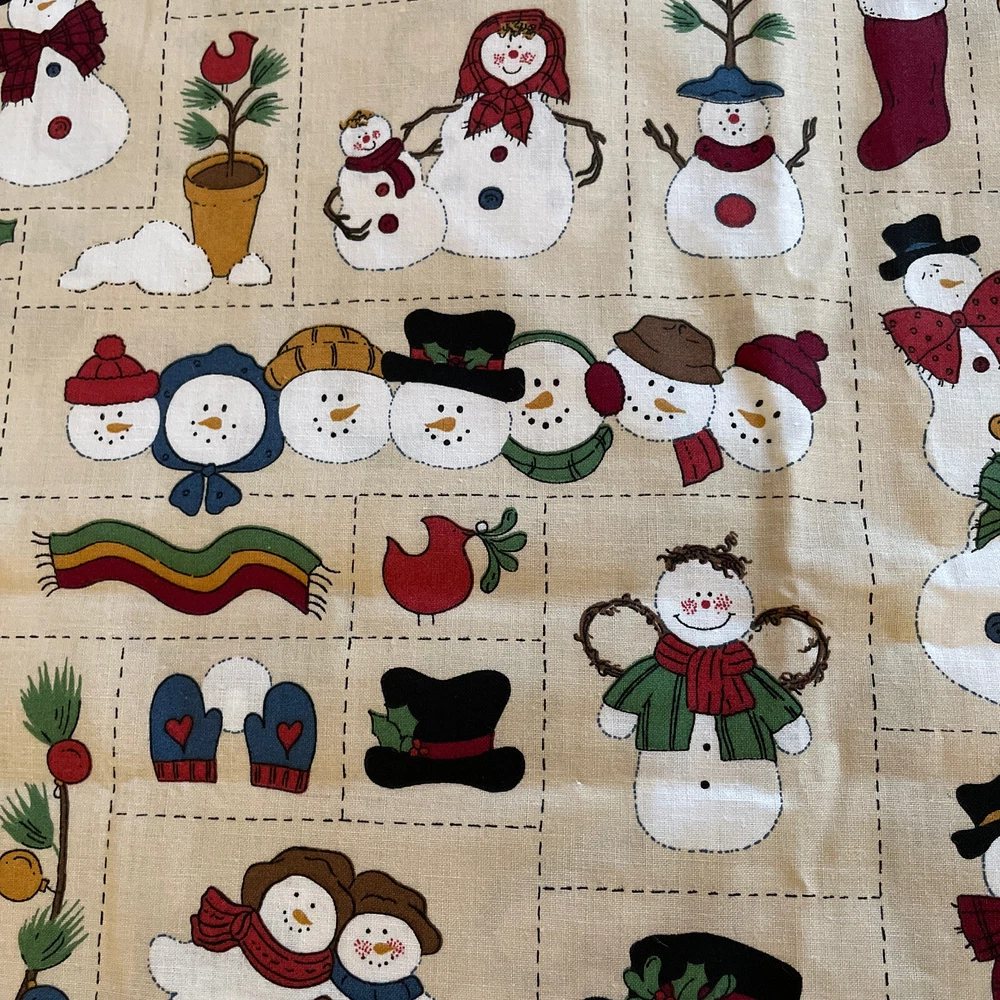 Winter christmas snowman Family patchwork print 2 Yard Bundle. Unmarked/unbranded piece. Comes with 2 cuts of the same print. In total measures just under 2 yards; one of the cuts is a yard and the other is 35”. Has been cut to print, so fabric may not be square. Has a slight musty odor.