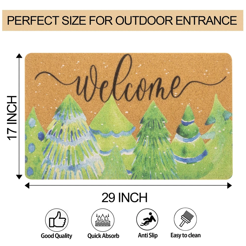 Cute Winter Christmas theme design of welcome mat bring festive spirit into your house. High Quality: The winter pine trees doormat is made of artificial coir, which is sturdy and reliable for long-term use, no shedding, can withstand high-traffic areas. Application: Cute Christmas theme design of welcome mat bring festive spirit into your house. Christmas mats for front door are reliable and pet friendly. The tightly woven coir traps dirt, debris and moisture while updating your front door. Non Slip: The Christmas decorative door mat measures 17" x 29". The thickness of the pile is 0.4 inch. The non-slip PVC backing provides grip support for your floors to prevent slipping. Easy to Clean: The non-slip outdoor entrance mat can be an excellent addition to home. Shake off the dirt from the doormat or use a vacuum cleaner and rinse the entrance mat with a hose. Welcome your guests and family with this funny welcome mat on the front porch. Occasion: Christmas welcome mat will add a beautiful touch to your front door, porch, patio, garage, garden, balcony, farmhouse. Instantly transform your home into elegance. Designed specifically for indoor and outdoor use, it's the perfect choice for any room or entryway in the home.