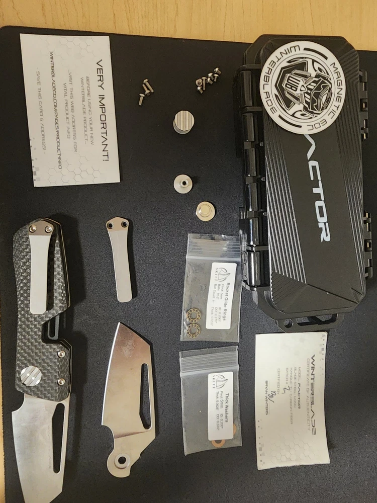 Winterblade Factor B2 + Extra Blade + Extra Pocket Clip + T8 Hardware + Full Kit Like-New Condition. This Factor comes with an extra blade and such, factory edge still sharp on both blades, it comes with the original T6 hardware and magnets, but it has official Winterblade T8s installed now. I also have skiff bearings and washers I will include that fit. Feel free to ask anything!