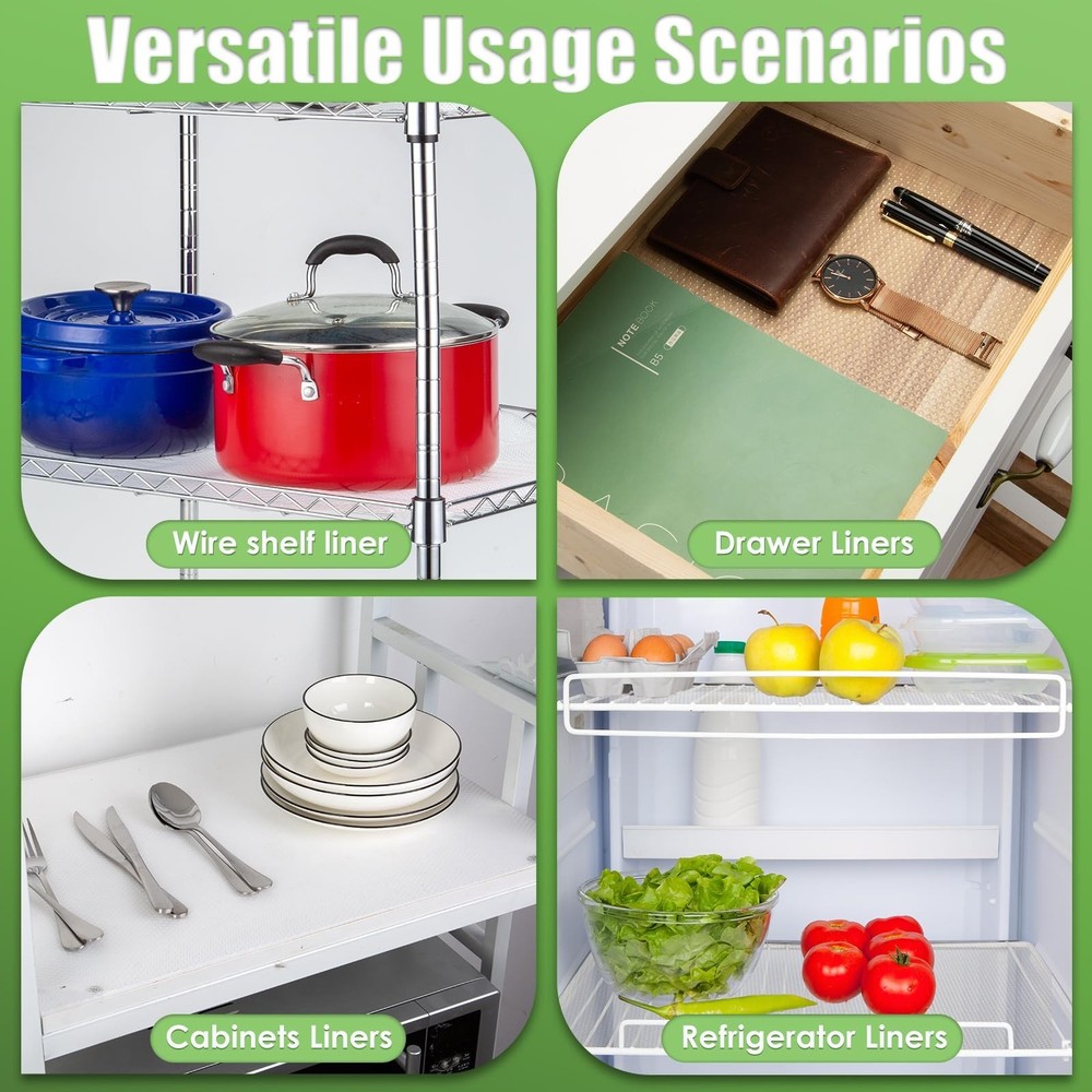 Wire Shelf Liner 16x197'' Clear Shelf Liner Kitchen,Cabinets,Drawer Liner, Cupboard, Under Sink, Pantry,Non-Adhesive Liner,Stain-Proof Shelf,1.2mm Thicken/Waterproof/Anti-Slip Liners Product Details Color: Clear Size: 16"W x 197"L Brand: AMZABBY MPN: Shelf Liner16 EAN: 7750397809757 UPC: Does not apply Brand: AMZABBY Color: Clear Material: Plastic Product Dimensions: 197"L x 16"W Recommended Uses For Product: 1.2mm,Shelf Special Feature: Keep fresh, Storage, Slip Resistant, Clean, Non-Adhesive Theme: Food Pattern: Fruit Product Care Instructions: water clean Number of Items: 1 Brand: AMZABBY Color: Clear Material: Plastic Product Dimensions: 197"L x 16"W Recommended Uses For Product: 1.2mm,Shelf Special Feature: Keep fresh, Storage, Slip Resistant, Clean, Non-Adhesive Theme: Food Pattern: Fruit Product Care Instructions: water clean Number of Items: 1 Number of Pieces: 1 Size: 16"W x 197"L Is Stain Resistant: Yes Manufacturer: AMZABBY Unit Count: 21.88 Square Feet Item Weight: 1.98 pounds Country of Origin: USA Item model number: Shelf Liner16 Date First Available: August 20, 2022 HIGH QUALITY MATERIAL:The AMZABBY wire clear shelf liner are made of food grade EVA material with BPA free. which is durable and reusable. Wire Shelf Liner can directly contact food.convex dots on top and smooth bottom help to prevent movement for fragile. MULTI USE LINER:Non adhesive shelf liner is great for refrigerator mats to keep the fresh of food and fruits.also can be kitchen cabinet liner,drawer liner,wire shelf liner,cupboard liner,shoe shelf liner,glass shelves liner etc. Its perfect decor for your home and protect furniture from other daily wear and tear. EASY TO CUT:Drawer liner comes in the most popular pre-cut sizes for easy installation.Including 1 roll liner with16 inch x 197 inch size, Kitchen cabinet liner can be easy cut to any size or shape with scissors. Glass shelves liner raindrop arrangement design can help you to cut into a straight line without tools. EASY TO CLEAN:AMZABBY wire Shelf Liners is washable, reusable and fast to dry.you can wipe the dirt with a damp cloth.or wash cupboard liner with water and then dry naturally in the shade fast to dry. doesn't leave any stain marks.doesn't leave any stain marks. NON ADHESIVE LINER:Non-Adhesive shelf liner design.Without curl edge when used in Kitchen drawer liner. And reusable.