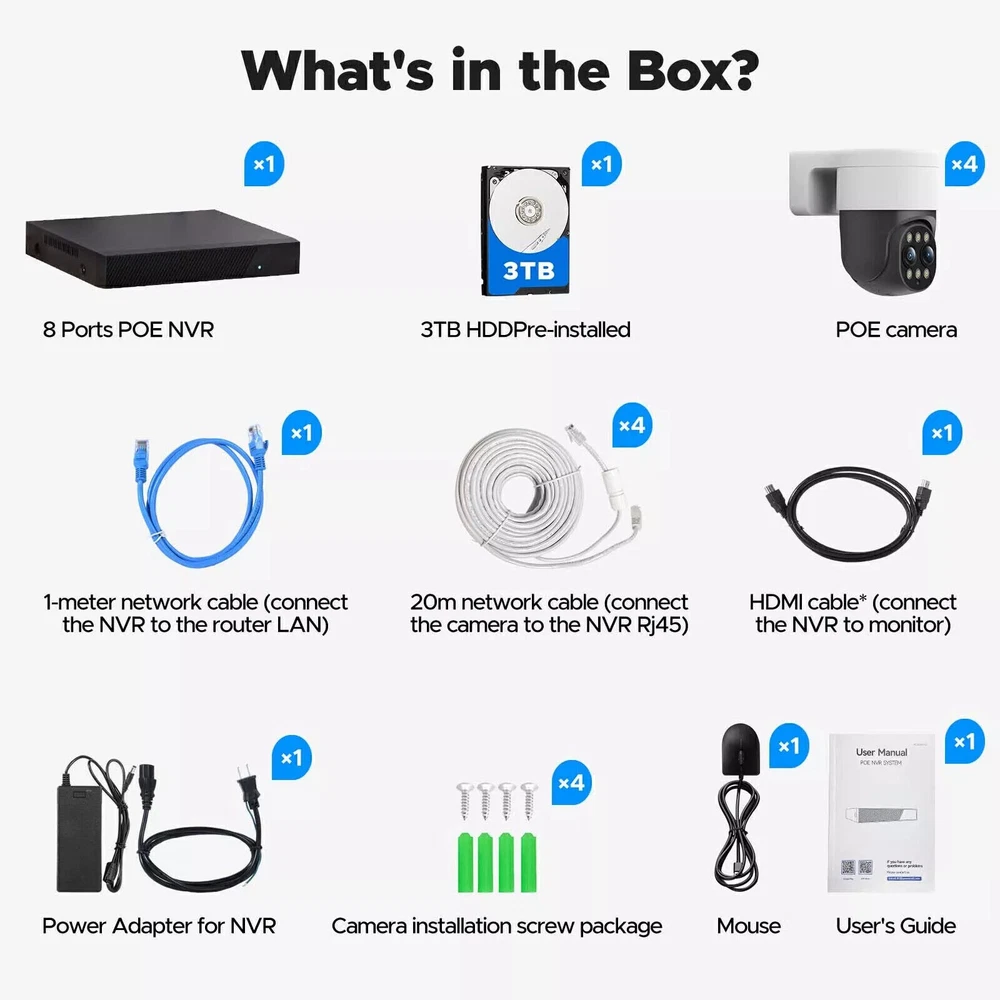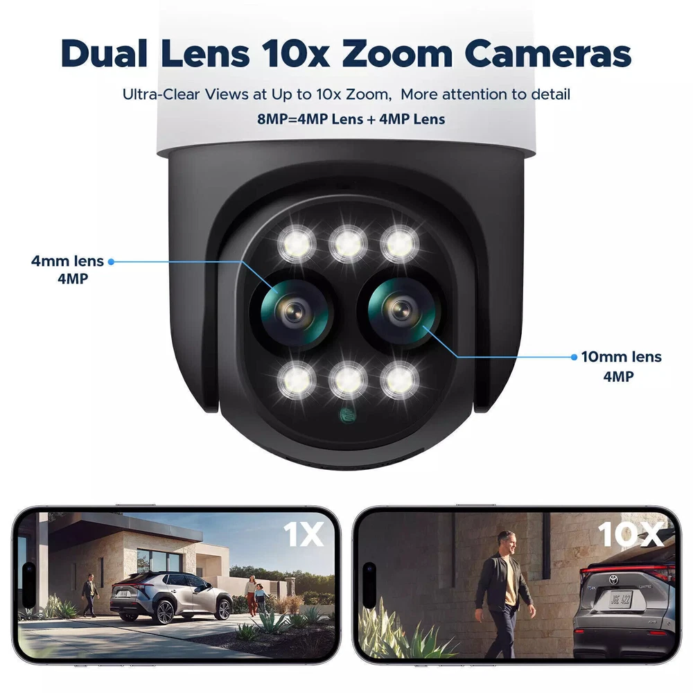 New Releases 6Pcs 4MP Wireless Solar Battery Powered Security Camera System Home Outdoor Wifi 329.99 USD Free shipping Toguard 10X Hybrid Zoom Light Bulb Security Camera Outdoor E27 PTZ Dual Lens 2MP 32.99 USD Free shipping CAMCAMP 8CH 4K POE Security Camera System IP Camera 3TBHDD 2-way Audio AI Detect 275.49 USD 289.99 USD Free shipping 5% off TOGUARD 8CH NVR 1080P Video Wireless Security Camera System Outdoor WIFI CCTV3TB 189.71 USD 199.69 USD Free shipping 5% off CAMCAMP 4K POE Smart Security Camera System Outdoor with 3TB Hard Disk Dual Lens IP PTZ Camera Auto Tracking 10x Hybrid Zoom Ultra H.265 8MP 8CH CCTV System Full Color Night Surveillance Kit Key Word: ▶ Dual Lens 10X Hybrid Zoom : Mind-blowing 10X PoE security camera system becomes affordable for your home and business security, giving you peace of mind with a wide field of view and clear close-ups. You'll see more detail in your security camera images, and small objects become larger and clearer in your field of view.(8MP=Dual lens :4MP+4MP) ▶ 355° Pan / 90° Tilt & Auto Human Tracking : Pan 355° Tilt 90°Captures every details without blind zone. More than that, AI Auto tracking function can track down suspicious human when enter surveillance area ▶ AI Algorithm Human Detection : By customizing the surveillance area or setting a line for human, and the alarm alerts will be triggered instantly to APP/NVR when detecting human crossing the line or intruding the alarm area ▶ Intruder Alarm lights and push alerts on Free APP : We could be alerted any time a person enter your property by receiving push notification from free phone APP, and alarm light will be triggered to drive away the suspicious objects ( Note: APP has No Monthly Fees) ▶ Real-time 2 Way Audio & Audio Recording : User can talk directly on phone app(No fees)for asking courier to put package to a certain place you point, and hear sound from Free App or TV monitor connected to NVR ▶ 3TB HDD+7/24/365 Record+Smart Playback : We have Various Record Modes like ①Regular 7/24/365 ②Motion Detection Record . AI Algorithm Tech allow you to select a certain period to playback the videos you want ▶ Work with or without Internet : For Local TV monitor surveillance, the camera system can work without Internet ,but If you want to remote access via APP or PC Client Software, we need to connect the system to router to access to internet Why Choose PoE Security Camera System? Disadvantages of Wireless Security Camera Systems Advantages of PoE Security Camera Systems Wireless security camera systems often face issues with limited range, PoE security systems provide reliable power and data over a single which can reduce their effectiveness in larger properties. Additionally, Ethernet cable, simplifying installation and without the interference they can suffer from signal instability due to interference from other issues common in wireless systems.They offer stable, high-quality wireless devices, leading to unreliable video quality and connectivity. video and have a range limited only by the cable length. Dual Lens 10X Hybrid Zoom, Get More Details With the hybrid zoom tech, you will never miss the bigger picture while also seeing what's important – down to every detail. This pan-tilt-zoom camera features advanced dual-lens technologies to fulfill unprecedented 10X mixed zoom for home protection. Pan & Tilt, Up & Down, Cover Your More Area Expand your coverage with the Pan-Tilt Security camera. Cover every angle and eliminate blind spots with the camera's vertical and horizontal rotation.Hybrid zoom in or out to see every detail near and far. Easily install on a ceiling or wall to get the perfect view. A uto Tracking Auto tracking helps you get the details on intruders by enabling it. When motion is detected the camera will automatically pan, tilt, Keep track of intruders and leave them nowhere to hide. Simplify POE installation,Easy to setup Video, Audio, and Power Carried By A Single Ethernet Cable(Included). Allows You Setup Your Home Security Camera System Easily. No Signal Issue Nor Wiring Hassles. The Power over Ethernet (PoE) is an advanced technology, which enables you to use a single network cable for both video and power transmission, installation easier! Besides, thanks to PoE you will never worry about electric leaks! Human Detection&Motion Detection If the camera detects humanoid movements, the system will send out an alarm (Show message to APP, Send email, system buzzer). You can know that someone is approaching your home anytime, anywhere. Put the Spotlight on Crime, Be Safe All the Time Motion turn on the spotlights , while also acting as a powerful deterrent. Work Even without Internet Color Night Vision The recording goes on with an HDD inserted in the DVR, even (1) Black-and-white (Infrared light) (2) Color mode (alarm light be on all night) without the Internet. Internet is only required when needing remote For energy saving, to set up alarm light by choosing Black and white mode, access, playback, etc. Real-Time Two-Way Audio Communication The built in high-quality speakers and m icroph ones make sure to communicate with people in the surveillance area when you’re away from home. 24/7 Monitoring and Recording, NVR Never Sleeps 8MP 4K PoE NVR security camera system supports simultaneous live feed and 24/7 recording for all cameras. the security IP camera can not only record just motion clips, but also every single minute of what happened. When something abnormal is detected, you’ll get notified instantly. You will never miss anything. Smart Playback Our security camera system boasts a built-in 3TB hard drive, offering extensive storage for seamless video playback. This allows users to efficiently review footage around the clock, facilitating comprehensive monitoring of events and enhancing overall security management capabilities. Detect Where You Want Define up to 32 coordinates to realize fixed-point and timed camera monitoring.