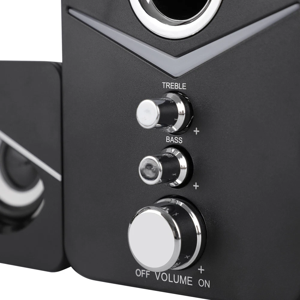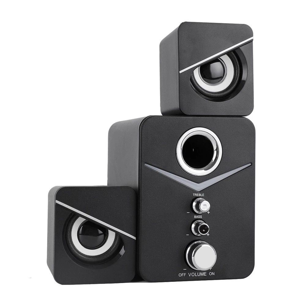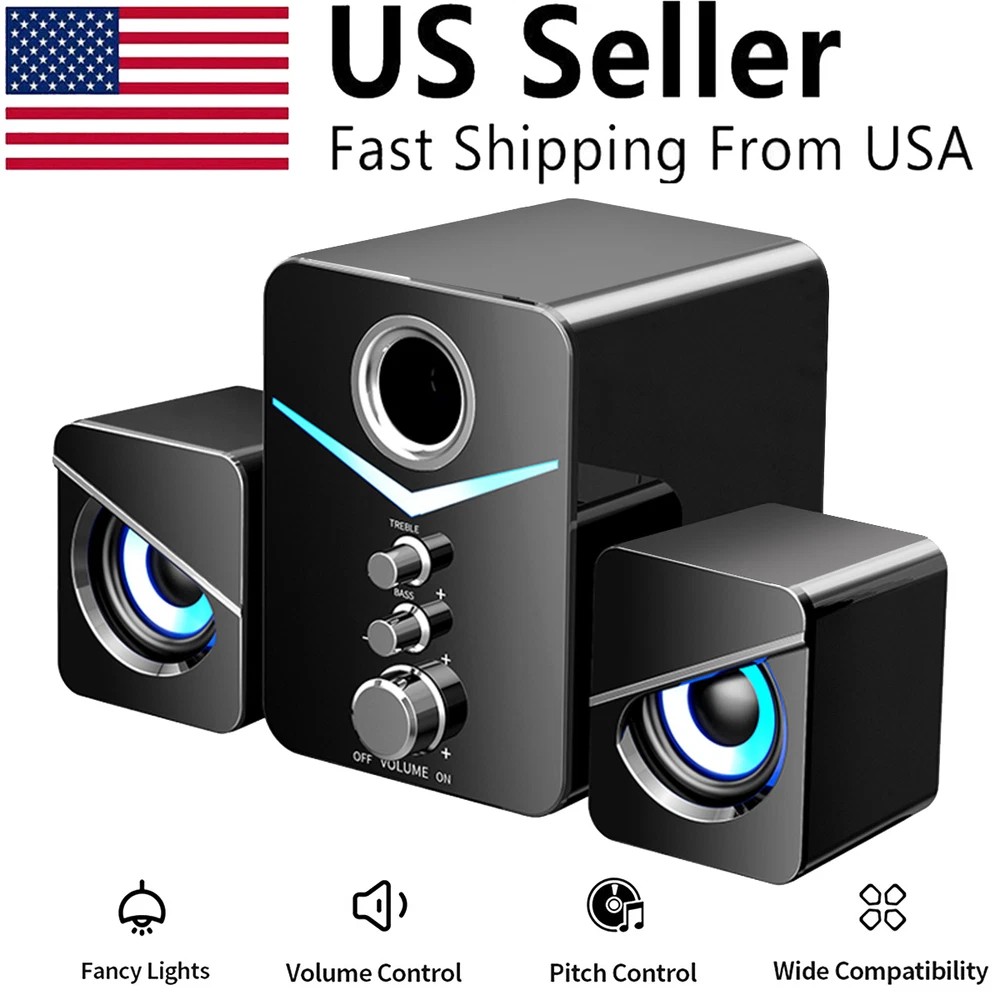 Wired Computer Speakers System Stereo Bass Subwoofer LED For Desktop Laptop PC FEATURES: - Supports A2DP 1.0/AVRCP 1.5/AVRTP 1.0/AVCTP 1.4/HFP 1.5/AVDP 1.0 - Three speakers enhance the sound experience - Can connect computer and mobile phone, very convenient - The speaker can be turned on/off and the volume can be adjusted through the control button - Easy to operate - The blue light is displayed when powered on, and the startup status is always on. After shutting down, the ambient light is turned off SPECIFICATIONS: Frequency response range: 30HZ-15KHZ Speaker power: 3W+2W X 2 Channel: 2.1 channel Supporting protocols: A2DP 1.0/AVRCP 1.5/AVRTP 1.0/AVCTP 1.4/HFP 1.5/AVDP 1.0 Number of speakers: 3W X 1+2W X 2 Voltage: USB/DC5V Speaker size: 3 inches+2 USAGE: ① USB power input connection, can be driven through USB power interfaces such as laptops, computer hosts, mobile phone power adapters, etc ② Universal 3.5mm audio connector, after connecting to the power supply, plug the 3.5mm audio connector into audio devices such as laptops, computer consoles, mobile phones, etc. ③ TREBLE adjusts the high frequency, BASS adjusts the low frequency, VOLUME adjusts the volume, and the switch knob PACKAGE INCLUDED: 1 x Main Speaker 2 x Side Speaker