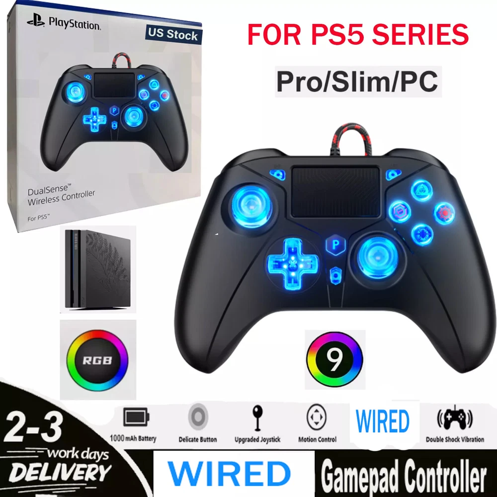 Product Description Product Detail: Connection method: Wired Compatible platforms: For PS4/PS5/PC/Steam Deck/Mac ✅ Equipped with RGB LED color channel indication, convenient for distinguishing different users and roles. Function: For PS5/PS4 functions: Connect to the PS5/PS4 console through the handle to control the corresponding PS5/PS4 games; The handle has a built-in 3.5MM headphone jack and supports voice function; Supports dual-point capacitive sensing touchpad; Supports dual-motor vibration function. ✅ Six axis function: A brand new motion sensing technology with built-in three-axis gyroscope and three-axis accelerator can detect all-round dynamic information including Roll (left and right tilt), Pitch (front and back tilt), and Yaw (left and right rotation). In addition to accurately sensing the tilt angle of the handle, it can also capture acceleration information of three-dimensional space X, Y, Z, and 3-axis, and quickly transmit all data to the game system, Players can fully use this innovative motion sensing technology to perform special operations in games. ✅ Headphone port: The 3.5mm TRRS stereo jack can connect headphones and microphones, allowing users to receive and transmit audio simultaneously. ✅ Turbo function settings: Set the function of the function key Turbo, the function keys include (╳, ○, □, △, L1, L2, L3, R1, R2, R3) 1. Press and hold any function key 2. Then press the Turbo key MACRO programming function: 1. Press the SET key for 3 seconds,P indicator light flashing slowly,and the motor vibrates 2. press any function key ↑,↓,←,→,╳, ○, □, △, L1, L2, L3, R1, R2, R3 and record key press and release times (The macro programming can record a maximum of 16 key values) 3. After recording,press ant key of PL/PR,the motor vibrates and the P indicator is always on, the button programming is successful Headphone port: The 3.5mm TRRS stereo jack can connect headphones and microphones, allowing users to receive and transmit audio simultaneously. About Us Welcome to our store! We are a professional worldwide wholesale company. High product quality, reasonable prices, excellent customer service and a reliable credit standing is our tenet.If you like our products, please add my eBay shop to your "My Favorites" list. All the products we are selling include factory warranty , don’t cover items that have been abused, burned and damaged in any form. Payment We accpet payment via PayPal only . Import duties,taxes and charge are not included in the item's price or shipping cost.These charges are the buyer's responsibility. Please check with your country's customs office to determine what these additional costs will be prior to bidding or buying. Insurance is included in the Shipping & Handling costs paid. Shipping Items are generally shipped out in 1-3 business day after your payment has been cleared (Sat. & Sun. excluded.) Orders from the United States Warehouse will be shipped out via USPS or UPS. The shipment usually takes 3-7 business days(Saturday and Sunday excluded), if you need the item urgently, please contact us for detail before purchasing. Local pick up is not available. Orders from China will be shipped via Belgian Post or Post NL.The shipment will take 15-35 working days,please contact us if you didn't get the parcel for a long time. We do not ship to APO, FPO, Alaska, Hawaii and Puerto Rico addresses, and we are unable to ship to PO BOX for this item. Please provide your psychical address. Returns You have 60 days to return it from the date it was received. All returned items must be in the original package and you must provide us with the shipping tracking number,specific reason for the return and your ebay ID. We will refund your full winning bid amount , upon receipt of the item in its original condition and package with all components and accessories included. Contact Us Dear buyers,we appreciate your business, if you are satisfied with our service , please leave us a Positive feedback and rate the details of the transaction (Detailed Seller Ratings) with a " Pefect Stars ". We aim to provide best services and products in exchange your maximum statifaction. We will do our best to resolve your issue till your satisfaction. O ur working time is: 09:00 AM-18:00 PM(Chinese time from Monday to Saturday) .All emails will be answered within 24 hours except weekends and holidays. powered by
