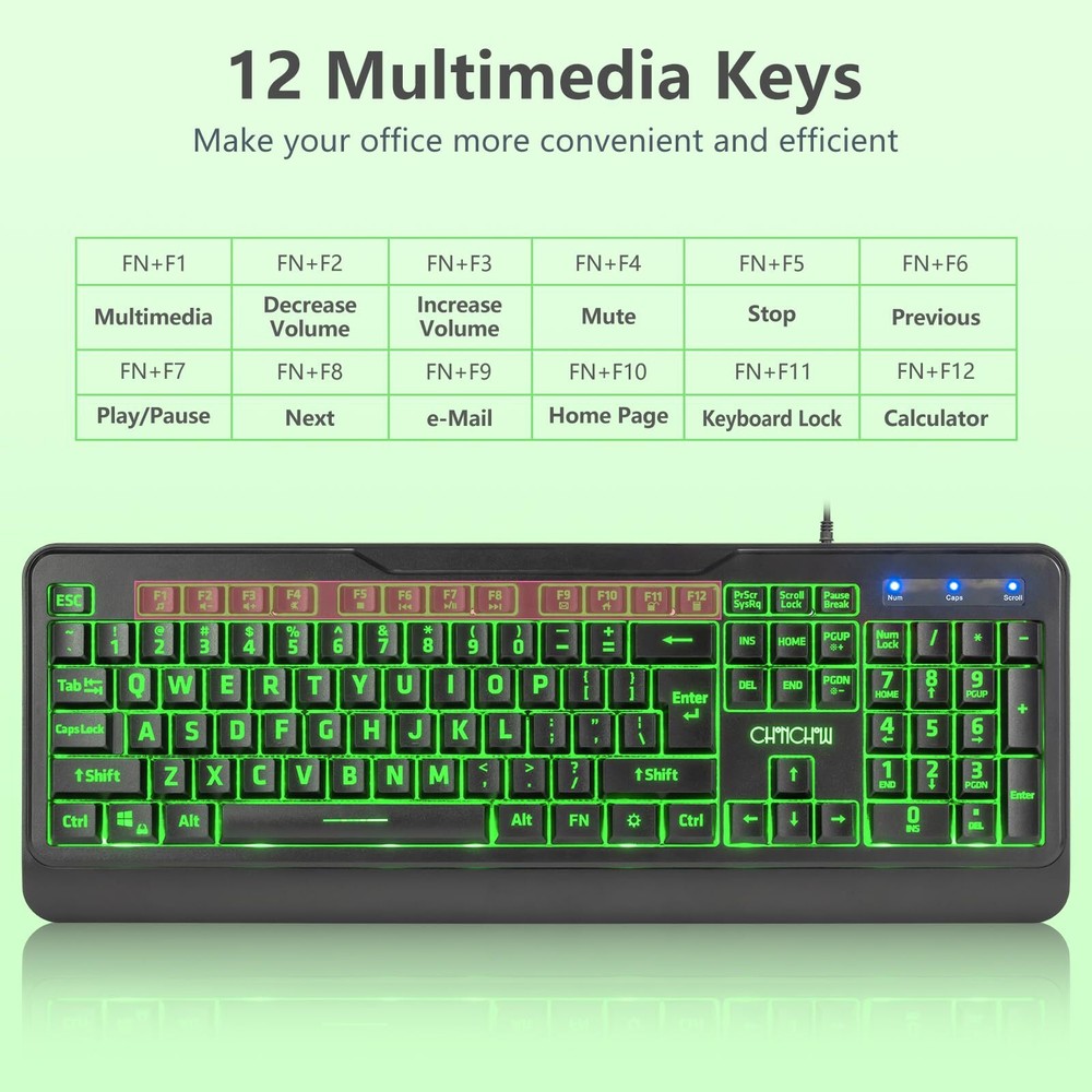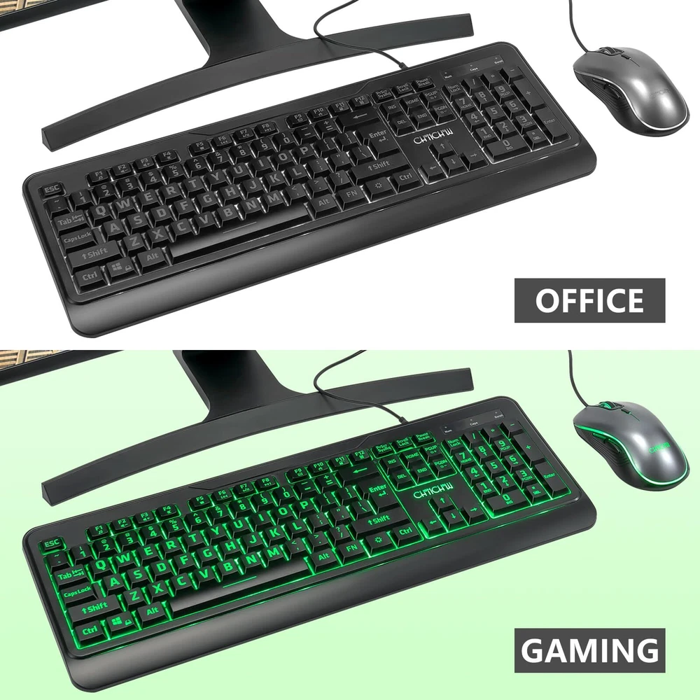 【Keyboard Design】The USB Keyboard with large print is sleek, compact, and spill-resistant. This light up keyboard features hot keys, multimedia function keys, a number pad, and low-profile keys that produce minimal sound. The keyboard with a thin profile, this USB wired keyboard also has sturdy and adjustable tilt legs, durable keys capable of withstanding 10 million keystrokes. Experience ultimate gaming performance with our keyboard and mouse combo. 【Comfortable and Quiet】Ergonomically designed with a comfortable wrist rest, this keyboard and mouse combo is perfect for extended gaming sessions on PC, Mac, or laptop. It is a silent keyboard - The low profile keys and quiet operation make it easy to focus on your gameplay without any distractions. 【Adjustable DPI & Ergonomic Design】The gaming mouse has 4 levels DPI (1200/1800/2400/3600) and optical laser for faster response, precise movement, and quiet tracking. The Wired gaming mouse with a precision optical sensor, ergonomic design, and symmetrical shape, it is comfortable for all users. The wired gaming mouse works well on smooth surfaces and can be used for long periods without hand fatigue. Long press the DPI to turn off the gaming mouse light. 【Multimedia Shortcut Keys and Backlight】The computer keyboard with 12 multimedia shortcut keys providing instant access to music, volume, computer, email and more, this wired keyboard greatly improves work efficiency. (Note: Some multimedia functions are not available on PC OS.) Additionally, the led light up keyboard has dazzling backlit, allowing for easy typing even in dark environments, with clearly visible characters. 【Wide Compatibility】The wired keyboard and mouse combo with number pad offers wide compatibility with various operating systems, including Windows Vista/XP/7/8/10, PC, and more. Get the ultimate gaming experience with this keyboard and mouse combo that is compatible with PS5, Xbox, and other gaming consoles, and features a USB connection for easy setup. 【After-sales Service】The product is backed by a one-year. Should the product fail to operate or be missing accessories upon receipt. We assure you that our dedicated after-sales team will promptly address the issue, ensuring you receive satisfactory after-sales support. We deeply appreciate your trust and support.