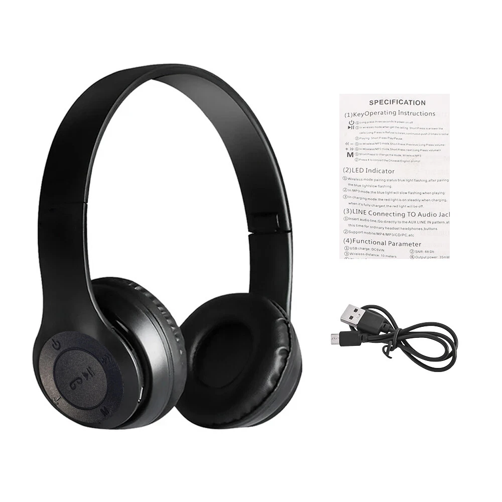 Specification: Connectivity: 3.5mm jack, Bluetooth, Micro USB, USB Type: Headset Color: Black, Blue, Green Features: Adjustable Headphones, Talking Function, Detachable Cable, Extra Bass, FM Radio, Foldable, HD Voice, Leatherette Padding, NFC Bluetooth Pairing, Noise Cancellation, Noise Isolation, Open Back, Rechargeable Battery, Replaceable Ear Cushions, Stereo, Surround Sound, Sweat Resistant, Volume Control, Waterproof, Wireless Wireless Technology: Bluetooth Form factor: On Ear Number of Headphones: Dual Suitable for: DJ, live monitoring, studio monitoring Type of microphone: Built-in Bluetooth version: 5.0 Voltage: DC5V FM frequency: 87.5-108MHz Bluetooth frequency: 2.401-2.480GHz Bluetooth distance: 10 meters Frequency Response: 50HZ-20KHz Output power: 35mW Signal-to-noise ratio: 88Db Charging time: 2 hours Frequency range: 20KHz-20000KHz Sensitivity: 90dB/mW Impedance: 32Ω Driver unit: 40mm Operating time: 5~6 hours Battery capacity: 250mA Transmission Frequency: 2402MHz-2480MHz Description: 1, 100% brand new and high quality manufacturing. 2, Bluetooth 5.0 chip, providing more stable and faster transmission. 3, Ergonomic design brings comfortable long time wearing experience. 4、Support TF card playback, FM, Bluetooth playback and make/receive calls. 5, Up to 6 hours working time, let you enjoy longer music and romantic LED light. 6, Foldable and portable, easy to carry and store. Package Includes: 1x Bluetooth headset 1x USB cable On Nov 29, 2024 at 23:15:10 PST, seller added the following information: