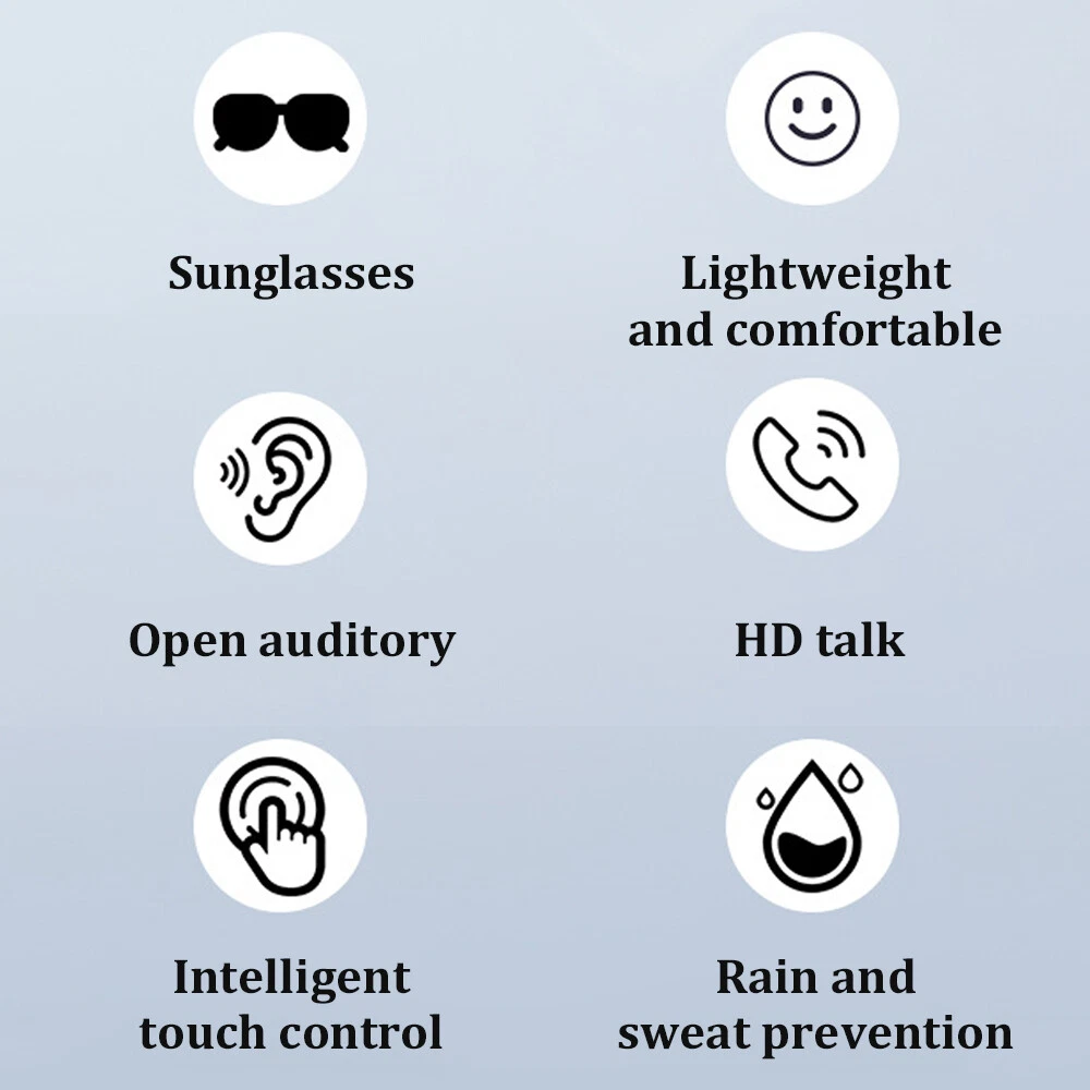 Features: 1, Open listening experience / HD stereo sound / Bluetooth audio call / voice control. 2, IPX5 level professional grade dustproof and waterproof, effectively prevent the splash of domestic water, as well as brief water showers. 3, Plenty of power lasting battery life, with high capacity 80MAH * 2 dual batteries, 2 hours fast charging, standby for about 5 days, 5 hours of continuous calls, 5 days of continuous standby, 4 hours of continuous music playback, 2 hours fast charging. 4, Optical against blue light always protect the health of both eyes, protect your eyes from harmful blue light, high transmittance ground chromatic aberration, comfortable sense of sight, clear vision. Specification: Bluetooth: 5.3 Transmission distance: barrier-free 10 metres Input voltage: 5V Music time: 5 hours Standby time: 120 hours Battery capacity: 80MAH Package List: 1*bluetooth glasses+1*charging cable+1*manual On Feb 21, 2025 at 23:03:29 PST, seller added the following information: