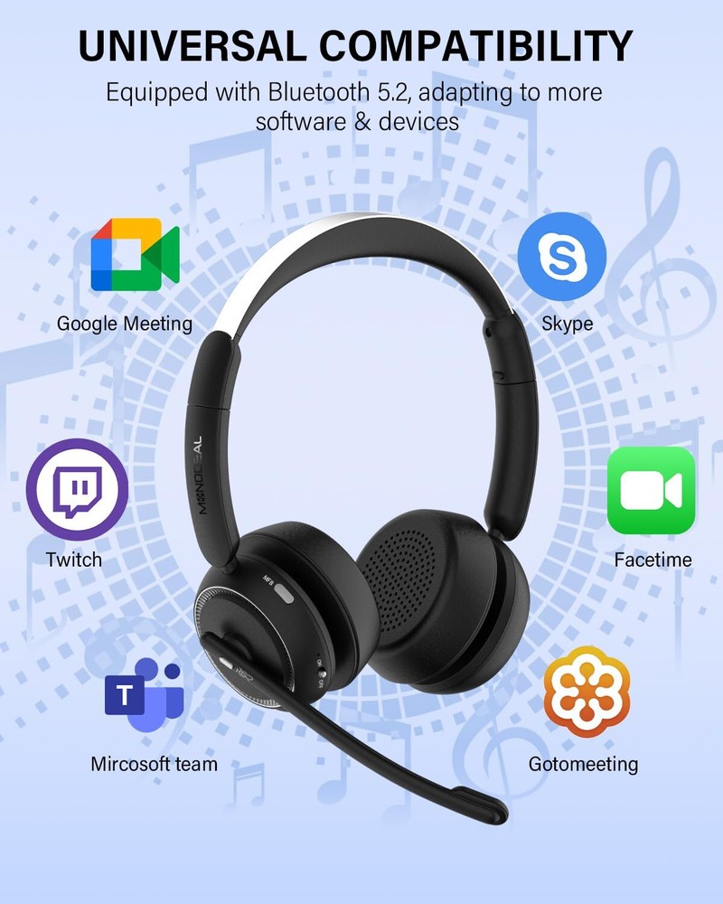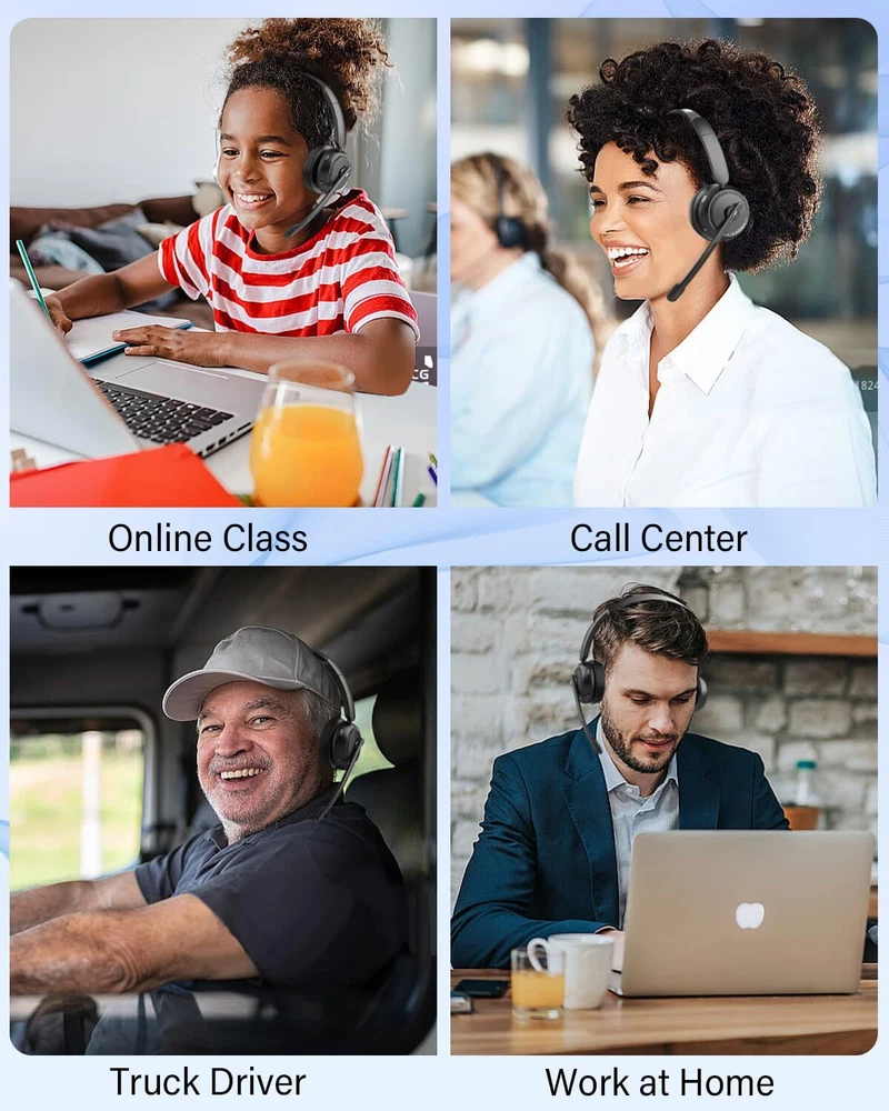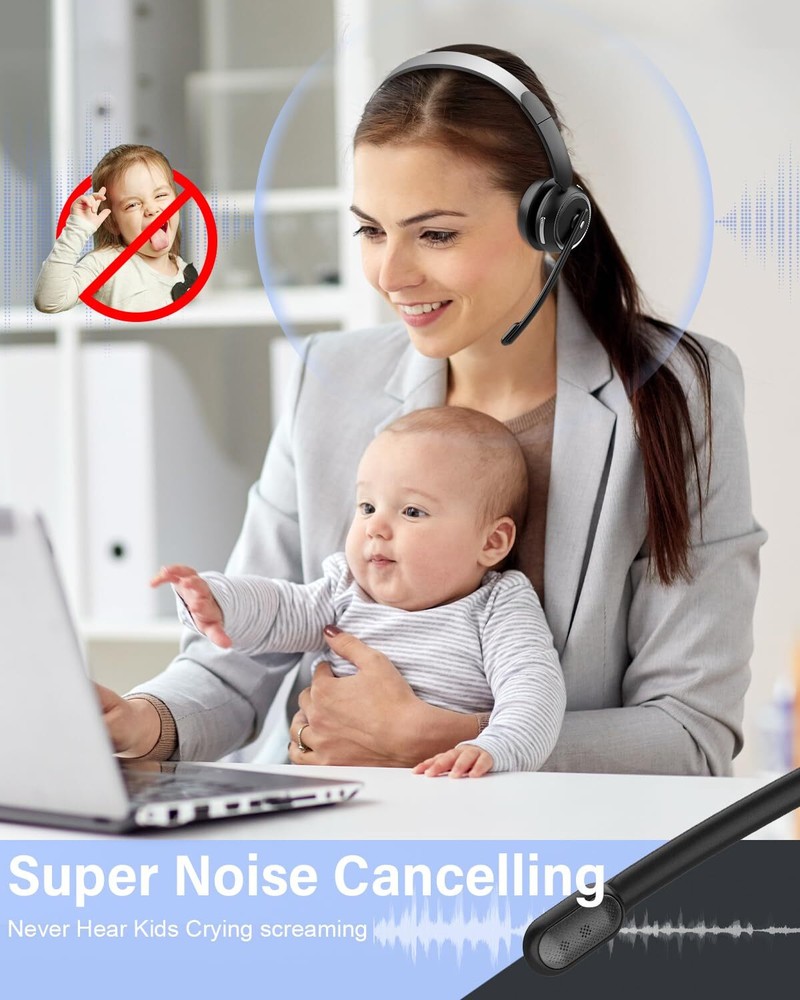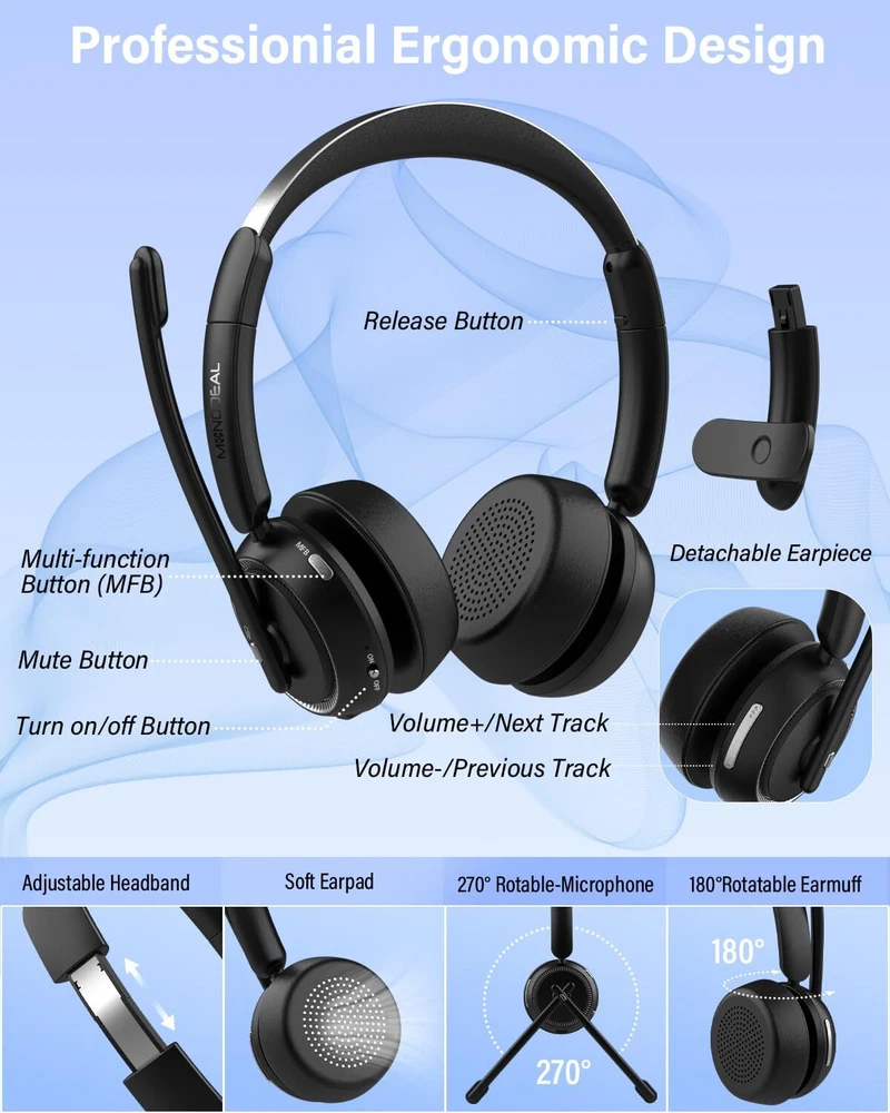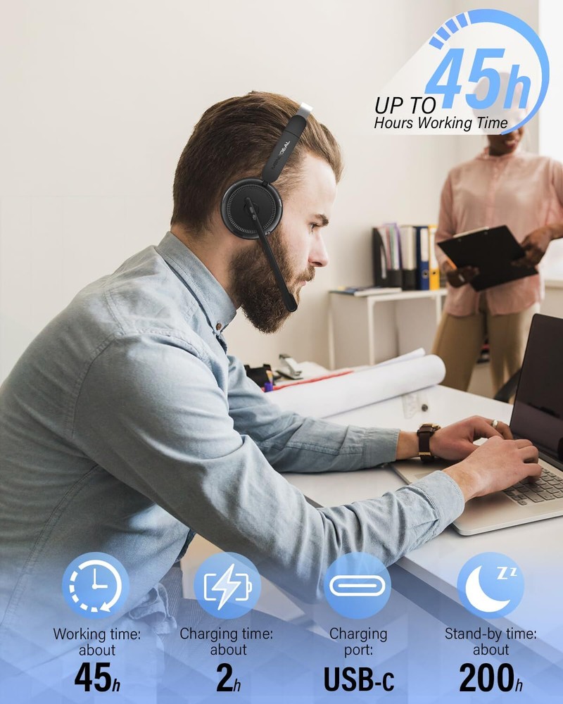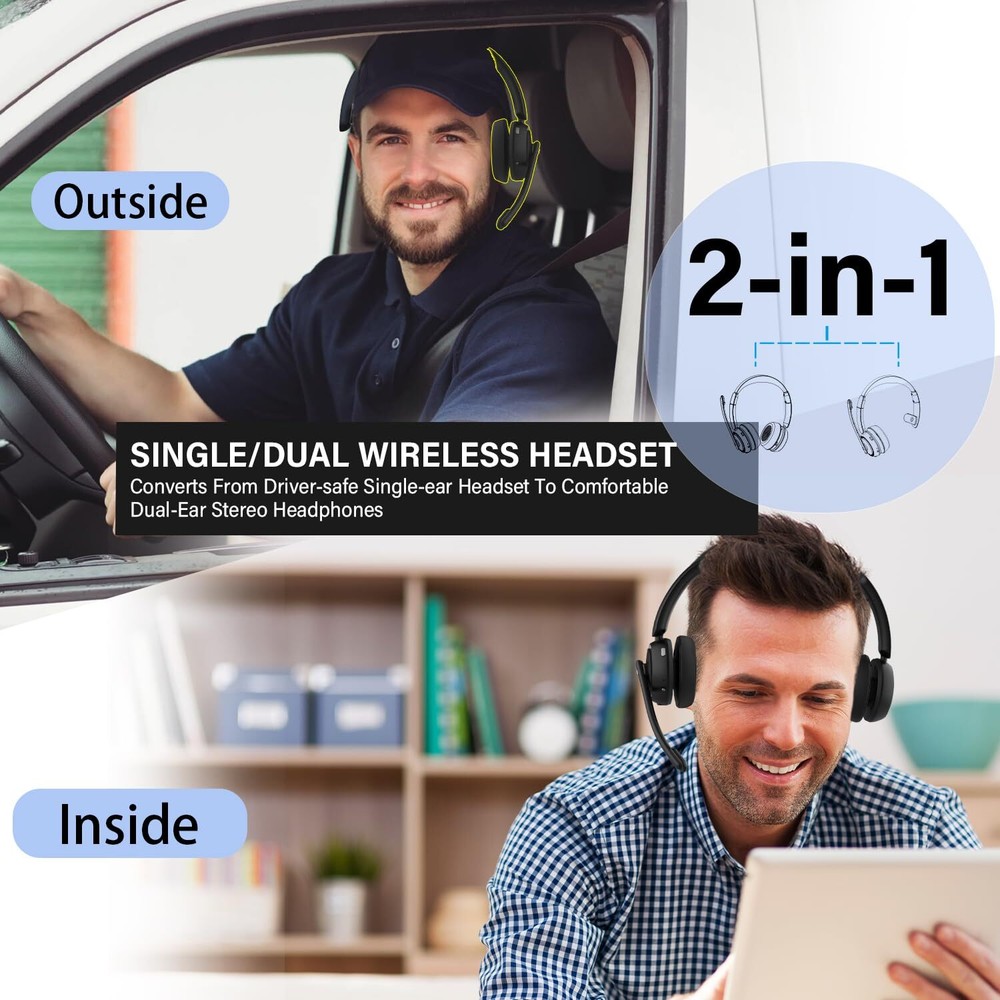 DUAL/SINGLE HEADSET CONVERTIBLE DESIGN: One of the earcups on this bluetooth headset with microphone is removable, easily converting your wireless headset from a premium mono headset to stereo headset for immersive media experiences. And with the MFB button, you can effortlessly answer/hang up calls(Only for Mobile Phones). With its easy operation and practicality, this trucker headset ensures safe and hands-free driving communication ADVANCED NOISE CANCELLING, CLEAR CALLS: Our wireless headset with microphone for pc incorporates a distinctive AI environment noise reduction technology. The advanced microphone of this work headset is designed to intelligently identifies and proficiently suppress up to 96% of disruptive background noise, ensuring crystal clear and polished voice quality. Even with toddlers at home, customers can never hear their crying or screaming MUTE SWITCH AND LONG BATTERY LIFE: The bluetooth headphones with microphone is designed with a dedicated mute button, granting you the freedom to easily mute your voice whenever you wish, creating a private meeting space. Moreover, the trucker bluetooth headset boasts a large 400 mAh battery, providing an impressive working time of up to 45 hours on a full charge (2 hours), making it an excellent choice for long-distance journeys or business use WIDELY COMPATIBLE: Our wireless headphones with microphone adapt the latest Bluetooth 5.2 technology, enabling faster pairing speed, more secure and stable connection, lower latency, better audio quality, and longer battery life. The office headset is widely compatible with most leading conference platforms, making it ideal for Facetime, Skype, VoIP, Webinar, MS Team, Call Center, Zoom, Dragon, GoToMeeting, etc ALL-DAY COMFORT: The wireless headset for work is equipped with ultra-light and soft protein memory foam ear cushions and adjustable headbands to ensure a comfortable, pressure-free fit around your ears and head throughout the day. The flexible 270° rotatable microphone boom can be easily adjusted, making it convenient for you to position the microphone at the optimal angle, and you can use the mic on either your right or left side