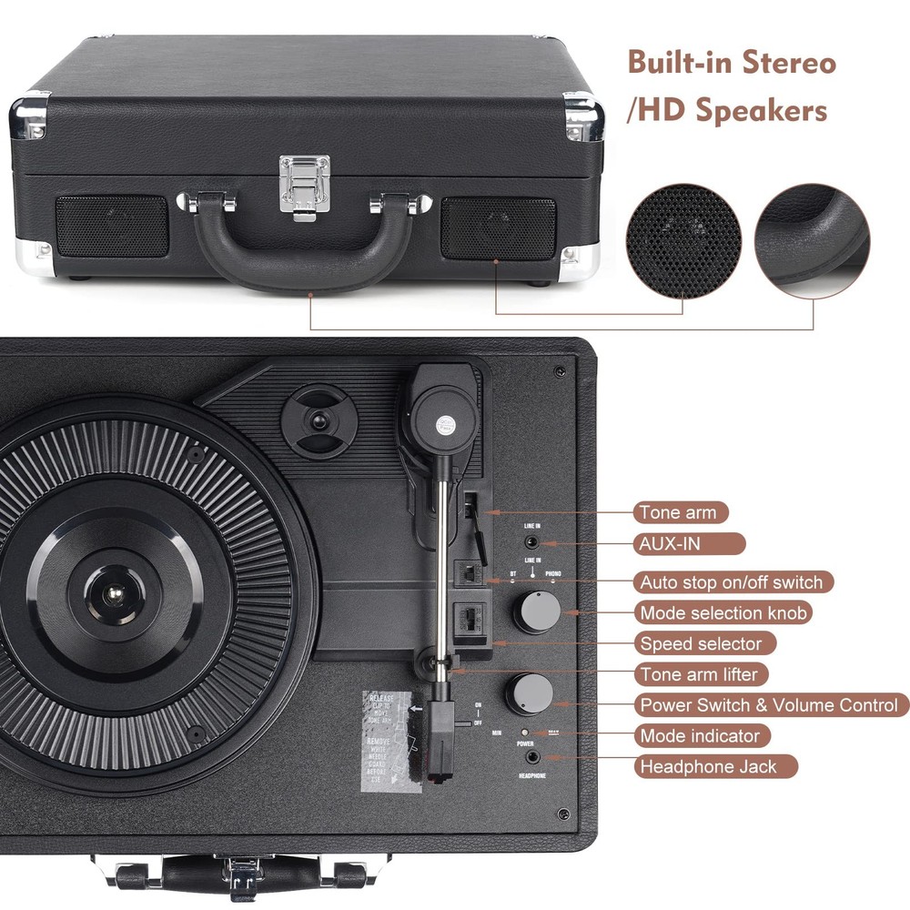 Flexible record player for your home The record player works as a stand-alone record player with integrated stereo speakers. Alternatively use the USB port to connect the player to your PC and use it as a USB record player, recording and converting your favourite vinyl to WAV or MP3 format for your MP3 player. If you want to connect it to your home stereo, no problem too, with stereo phono outputs on the rear can simply and quickly be connected. Stylish design & portable This one is built in to a stylish vintage styled briefcase / suitcase design and bound in a leather look finish with chrome coloured fasteners and black interior. Not only does it look great but it makes it incredibly portable too. 3 speed record player An absolute necessity for any record player is that it can play all your vinyl. It is switchable between 33 1/3, 45 or 78 RPM so will support your whole record collection. Includes record player, USB cable, mains power cable, CD with Audacity audio software & manual Wireless Bluetooth Connection: The built-in Bluetooth speaker can play MP3 audio or smartphone audio through a powerful Bluetooth transmission connection. The Bluetooth signal is stable and the connection is faster, allowing you to enjoy your favorite music more freely. Three-Speed Turntable: Supports three playback speeds (33-1/3, 45 or 78 RPM) and three record sizes (7"/10"/12"). The turntable includes a 45 RPM adapter. Built-in HD Speakers: 2 built-in stereo speakers. The turntable can also be connected to external home speakers via RCA outputs. Equipped with a 3.5mm headphone jack for connecting headphones. Auto-Stop Switch: Stops spinning once the record reaches the end of the record. Quick mode switching (Bluetooth/auxiliary input/phono) for your convenience. It is perfect to use when you need to relax, party and party etc. Audio conversion: Convert analog audio signals from vinyl records to digital audio files, such as MP3, WAV and other formats.
