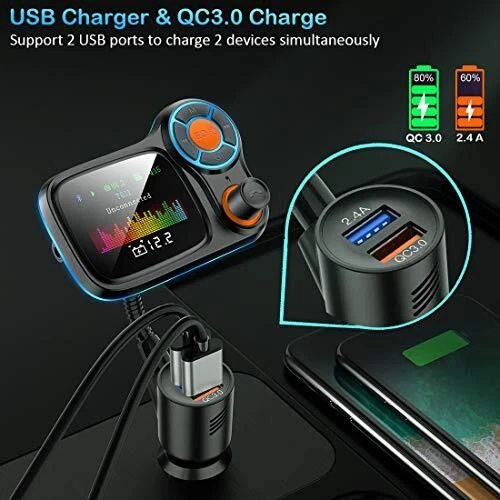 Return Policy Fast Delivery Trusted seller Wireless Car Bluetooth Adapter,Radio FM Transmitters HandsFree Call Receiver and MP3 Music/APP Audio Play,QC3.0 and Smart 2.4A Dual USB Charger,1.8" Color Display,Aux Port,TF Card Product Description [UNIQUE BLU-RAY &1.8" DISPLAY] Larger and clearer color display featuring LED color screen show music mode, FM channel, car battery voltage, volume, with Blue colors led backlit that it can offer visual enjoyment; 360-degree flexible gooseneck to offer a more comfortable visual interface. [HANDSFREE CALLS] The Bluetooth FM transmitter for car have the latest Bluetooth 5.0 provides a stable connection; Built-in microphone with advanced CVC noise cancellation reduces background noise for clearer calls; Answer calls phones safely with one , reducing interference while driving. [FOUR MUSIC MODES] The car Bluetooth transmitter can play your favorite songs on the car stereo through 4 methods: Bluetooth devices, USB Flash Drive(≤32GB), TF Card(≤32GB), Aux(3.5mm Jack). The music adapter can bring you an auditory experience with its clear and stereo sound. [DUAL USB CHARGING] The car charger with a QC3.0 and 2.4A charging port, Input 12-24 V,Supports 2 USB ports to charge 2 devices simultaneously.The smart output current pairs most cellphones or tablets. Safely charging to your device without damage to the battery with this Bluetooth radio transmitter. [WIDE COMPATIBILITY] The radio adapter works well with most Bluetooth enabled devices, such as iPhone, iPad, iPod, Samsung, HTC, Sony, LG, Google phone, tablets, and smartphones, etc; And it will fit most of Cars or Trucks(voltages among 12-24V). Shipping Returns Payment Shipping Shipping is FREE to all addresses other than APO/PO boxes in the lower 48 states. All our stock ships from US-based warehouses. Shipped via USPS or UPS (depending on location and package weight) Unless stated otherwise, all orders will ship within 24-72 hours of your payment being processed. Check our feedback to see the great reviews of FAST shipping we offer. Returns Seller does not accept returns Payment We currently accept payment via eBay managed payments only. Once payment is cleared, we will dispatch your shipment within 1-3 business days. Please refer to the "Shipping" tab for more information regarding shipping speed to your destination.
