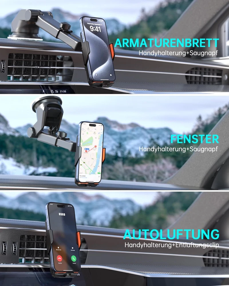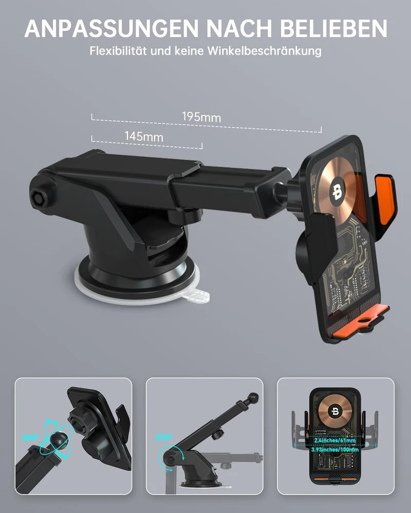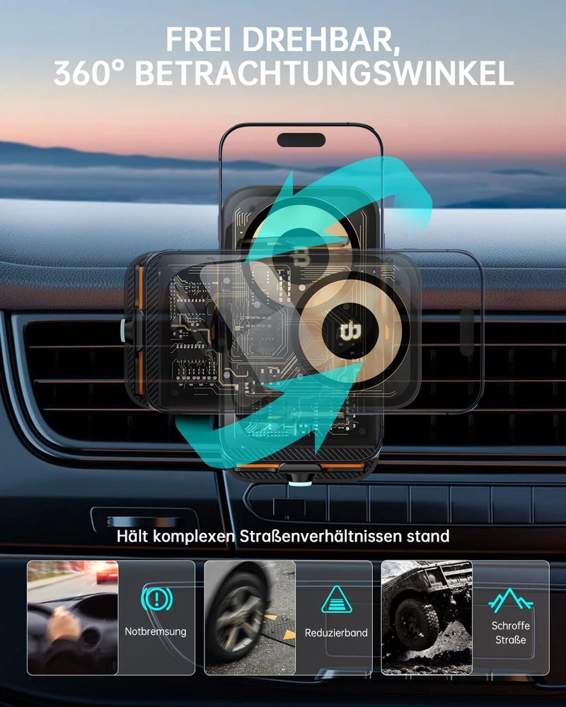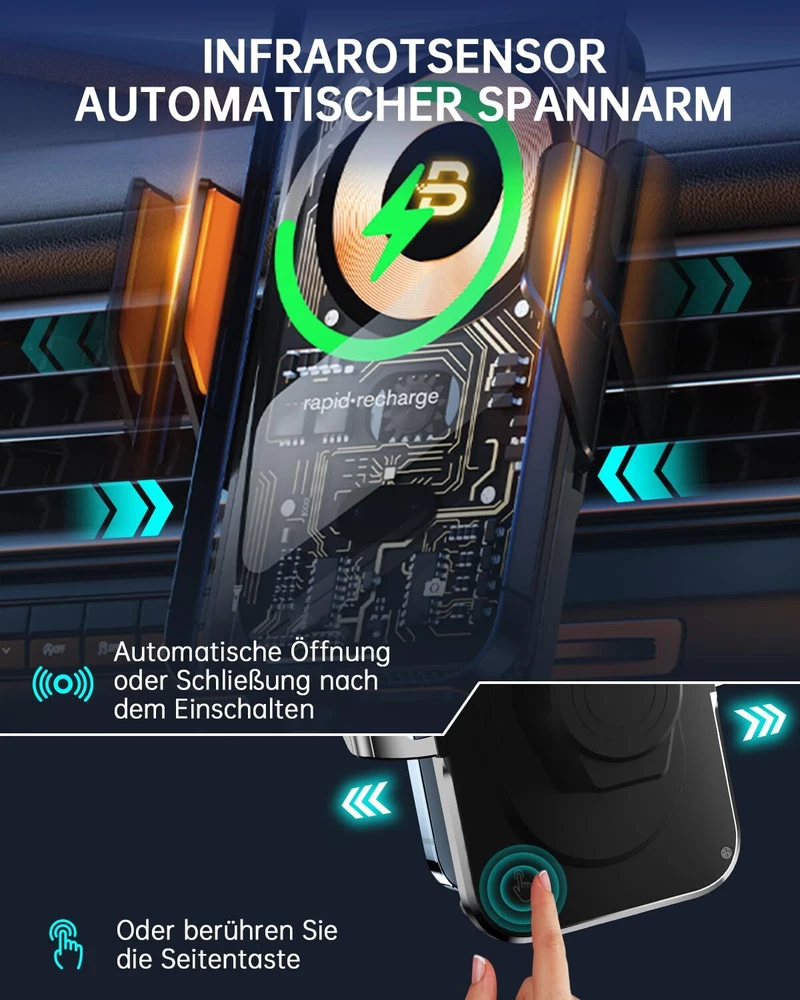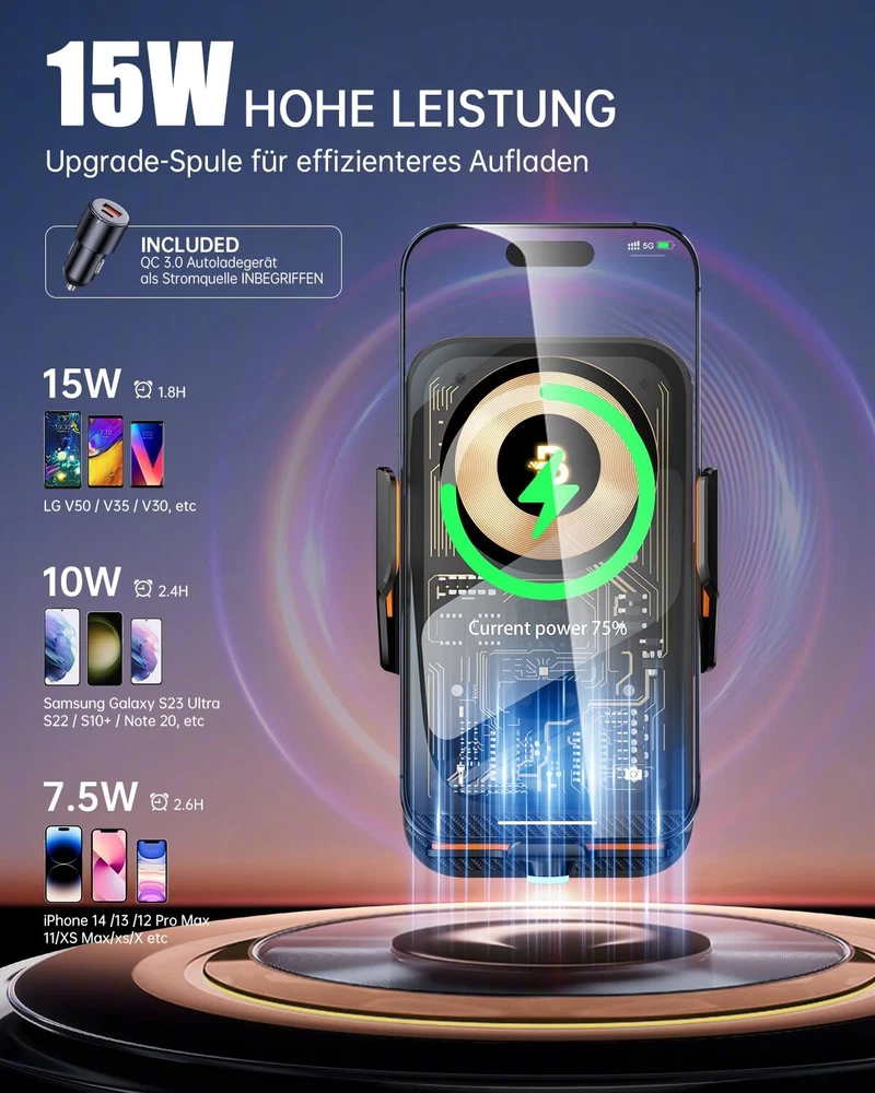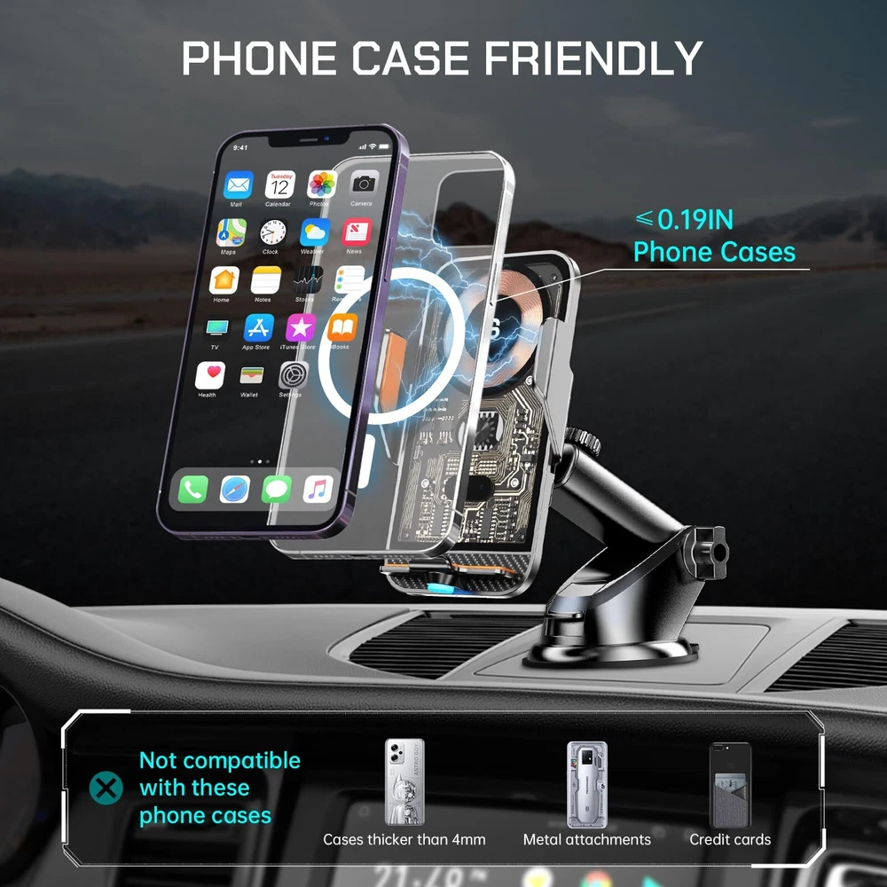 【Cyberpunk 15w Wireless Car Charger】Elevate your driving experience with our cutting-edge car phone holder wireless charger. Featuring an upgraded smart control chip, it effortlessly recognizes your phone model for seamless charging. Enjoy fast charging capabilities with up to 15W for LG V50 / V35 / V30, 10W for Samsung Galaxy S22 Ultra/ S21+/ S20/Note 10+, 7.5W for iPhone 15/14/13/12 Pro Max/11/ XS Max/XS, and 5W for other compatible phones. The package includes a QC 3.0 car charger adapter. 【Smart Sensor Auto Clamping】Simply connect the cable, and when you bring your phone close to the holder, the smart car wireless charger phone holder will automatically open and clamp your phone – making it easy to use with just one hand. Built-in capacitor, touch the button on the back of the charger to quickly release the phone in 1 second, still available when the car is off. 【3-In-1 Design & Upgrade Suction Power】The cell phone holder car kit includes steel metal air vent clips and upgraded adhesive nano-gel suction cups to provide greater stability. You are free to choose where to mount your wireless car charger. The phone holder for car dashboard mounting can be mounted on the dashboard and windshield, or on the air vent with the stabilizing air vent clips. 【Flexible Angle Adjustmen】The holder's ball joint allows the chargerless to rotate 360° for optimal viewing angles. The telescoping arm extends from 5.7 to 7.6 inches and rotates in a 270° arc, allowing you to customize the angle for your phone. The cell phone charging stand supports both portrait and landscape mode use of your phone, giving you secure access to GPS navigation and phone calls. 【Case Friendly & Easy To Use】Without removing the case, the cell phone car mount supports charging through cases up to 5mm thick, excluding metal attachments. The grip arms and bottom are equipped with non-slip rubber pads to hold your phone securely and withstand severe vibrations. You will get 1 x Car Phone Holder Mount Charger, 1 x Suction Cup Mount, 1 x Air Vent Clip, 1 x QC3.0 car adapter, 1 x Type C Cable,1 x User Manual.
