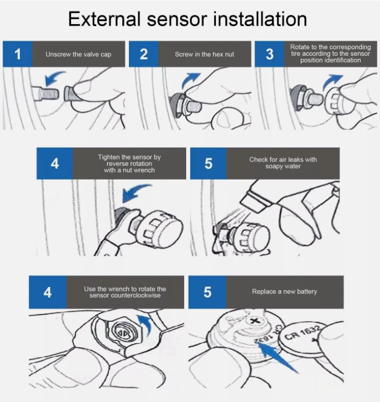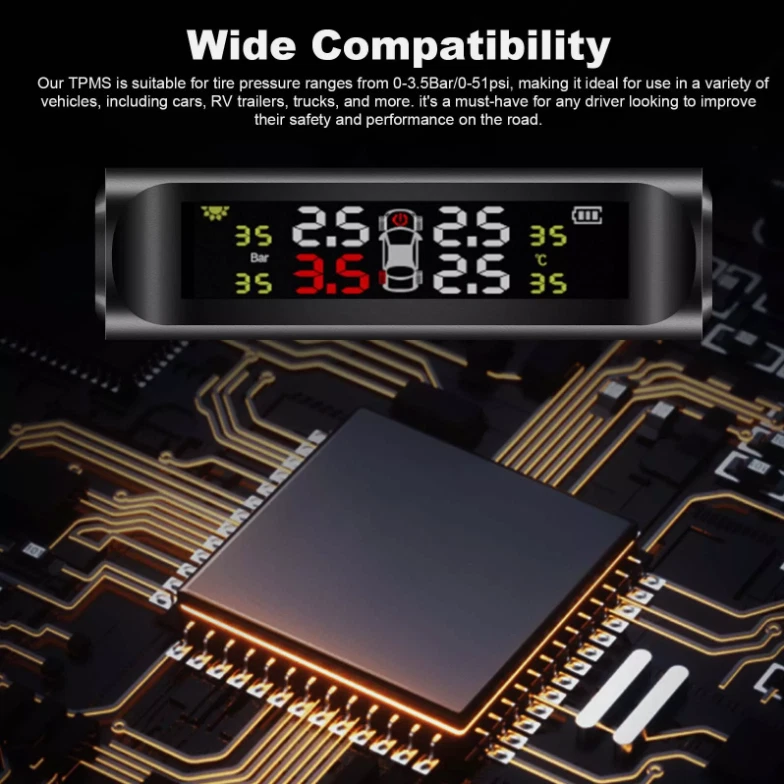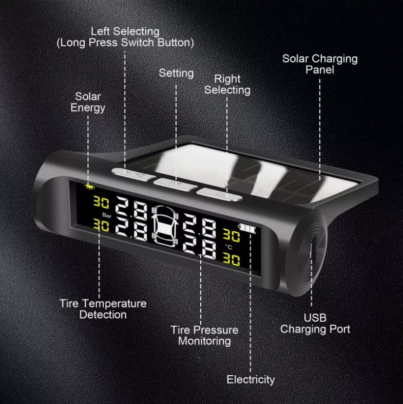 Product Description Real-time Monitoring: The LCD display can clearly display the temperature and pressure of the tire in real time. The temperature and pressure data can be switched (default is 0- 3.5 Bar / 0-50 Psi), the temperature unit ℉ / °C / Bar and the pressure unit: PSI / Bar are optional. Solar Power & USB Charging: Support solar power charging and USB cable charging, do not occupy the car cigarette lighter socket,ensure that the TPMS can work continuously, You don't need to worry about low battery. Intelligent Voice Alarm: When the tire temperature or pressure is abnormal, TPMS will give voice Alarm to broadcast tire problem immediately, you don’t need to stare at the monitor screen to confirm tire problems, Press any button will stop alarming, it is more convenient and safe. Intelligent on and off: It has vibration sensing, After the tire pressure monitoring system is opened, If the tire pressure monitor sensor does not detect vibration, the display will automatically enter sleep mode to save power, it will automatically turn on when the car vibrating. After manually shutting down, you need to manually start it. 4 External Waterproof Sensors: 4 IP68 sensors can be waterproof, dustproof and snowproof, anti-corrosion,good accuracy for measure temperature and pressure, monitor the temperature and pressure of the tires for you, ensure the safety of the driver, and extend the service life of the tires. Specification: Display screen:LCD Operating temperature: -30°C-85°C Working voltage: 3.7-5V Daytime operating current/Night operating current/Standby current:<20mA/<4mA/<50uA Transmission frequency:433.92MHZ+/-20KHZ Transmission mode:FSK Pressure unit: BAR/PSI Charging ways:Solar energy/USB Battery:1*303450 3.7V 500mAh Sensor: Operating temperature: -30°C-85°C Working voltage: 3.7-5V Standby current:<1uA Transmission frequency: 433.92MHZ+/-20KHZ Transmitted power:>8dBm Open Distance:>30M Battery(each sensor):1*CR1632 3V Monitor size: Approx.9.5*8.5cm Sensor size(each): Approx.2*2*2cm Package Included: 1 TPMS Receiver host 4 Sensors 4 Anti-lost nuts 1 Hex spanner 1 Anti-slip Pad 1 User manual Fit for Ford Fusion Ford Escape etc 20PCS M12x1.5 19 mm Wheel Lug Nuts 13.99 USD Free shipping Carburetor Carb Assy For Yamaha A iPower SC2000i 2000/1600 W Inverter Generator 14.99 USD Free shipping 60" Inch Truck Tailgate LED Light Bar Brake Reverse Turn Signal Stop Tail Strip 12.99 USD Free shipping Electric Oil Transfer Pump Extractor Fast Change Transmission Fluid Extractor 17.99 USD Free shipping 2 x Copper Nickel Brake Line Tubing Kit 3/16 OD 25 FT Coil Roll All Size Fitting 19.0 USD 22.35 USD Free shipping 15% off 3.5V-36V Digital Automotive Car Power Circuit Electrical Tester Probe Test Light 16.88 USD 19.99 USD Free shipping 16% off powered by