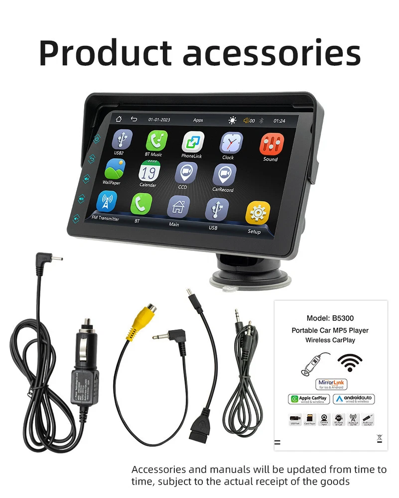 Home Payment Shipping About us Contact us Store Categories Store Categories Other Details 7inch Portable MP5 Car Radio Multimedia Video Bluetooth Player Wireless Carplay And Android Auto Mirror Link Basic parameters Type:Portable Car MP5 (Sunshade style, detachable sunshade) System: full log melis system Software solution: F133 Radio transmission frequency: 88.60/89.20/89.50/89.80/91.50/91.80/93/00/93.60/93.90/94.50/95.10/95.70MHz Radio transmission IC: AB5301B Power amplifier IC: CS8571E Output power: built-in 1W speaker Working voltage: 12-36V Working temperature: -10~60 ℃ Bluetooth version: 5.0 (default name: CarPlay) WiFi frequency: 2.4G/5G dual frequency (automatically switches based on the frequency band of the hotspot connected to the phone, used when connecting to Android AUTO and Apple CARPLAY) CPU: F133 Running memory: 1Gbit DRAM Display resolution: 1024x600 Screen size: 7 inches high-definition Installation size: 65x65MM Shell size: 190x116MM Host depth: 22MM Functional parameters Mobile internet: support Reverse image: support(camera not included) Play video warning: support Dash cam: support (optional,not included) Integrated speaker: support Rear USB ①: USB2.0 Rear USB ②: USB2.0 TYPE-C interface: USB 2.0 Read (CARPLAY only) Left touch button: supported Reset button: support Audio format: MP3/AAC/APE/OGG/M4A/RA/WAV Video format: H263/H264/H265/DIVX HD/AVI/FLV/MKV/MPEG/MP4/WMV9/VC/ASF/TS/QT Image format: JPEG/PNG/BMP/GIF/TIFF Language parameters:English, Chinese, Spanish, Portuguese, Russian, German, French, Polish, Türkiye, Arabic, Hebrew, Italian, Czech, Japanese Accessories 1. Host 2. Instructions 3. Cigarette lighter power cord 4. Suction cup bracket 5. Steering wheel remote control 6. Reverse video cable Basic functions 1. Radio frequency transmission function (set the radio frequency point of the original car radio to be consistent with the preset frequency point of the machine, and the audio signal of the machine can be amplified and output to the speaker through the original car radio) 2. Reading USB flash drives (audio/video/images) 3. Bluetooth function 4. Wired phone screen projection, wired and wireless Android AUTO/Apple CarPlay 5. Rear view function in reverse (camera optional) 6. Driving recorder function (recorder optional) 7. Audio output 8. Colorful touch button lights Shipping Policy Payment Method Returns Policy Shipping Policy Payment Method Returns Policy Home Payment Shipping About us Contact us Home Payment Shipping About us Contact us Store Categories Store Categories Other Details 7inch Portable MP5 Car Radio Multimedia Video Bluetooth Player Wireless Carplay And Android Auto Mirror Link Basic parameters Type:Portable Car MP5 (Sunshade style, detachable sunshade) System: full log melis system Software solution: F133 Radio transmission frequency: 88.60/89.20/89.50/89.80/91.50/91.80/93/00/93.60/93.90/94.50/95.10/95.70MHz Radio transmission IC: AB5301B Power amplifier IC: CS8571E Output power: built-in 1W speaker Working voltage: 12-36V Working temperature: -10~60 ℃ Bluetooth version: 5.0 (default name: CarPlay) WiFi frequency: 2.4G/5G dual frequency (automatically switches based on the frequency band of the hotspot connected to the phone, used when connecting to Android AUTO and Apple CARPLAY) CPU: F133 Running memory: 1Gbit DRAM Display resolution: 1024x600 Screen size: 7 inches high-definition Installation size: 65x65MM Shell size: 190x116MM Host depth: 22MM Functional parameters Mobile internet: support Reverse image: support(camera not included) Play video warning: support Dash cam: support (optional,not included) Integrated speaker: support Rear USB ①: USB2.0 Rear USB ②: USB2.0 TYPE-C interface: USB 2.0 Read (CARPLAY only) Left touch button: supported Reset button: support Audio format: MP3/AAC/APE/OGG/M4A/RA/WAV Video format: H263/H264/H265/DIVX HD/AVI/FLV/MKV/MPEG/MP4/WMV9/VC/ASF/TS/QT Image format: JPEG/PNG/BMP/GIF/TIFF Language parameters:English, Chinese, Spanish, Portuguese, Russian, German, French, Polish, Türkiye, Arabic, Hebrew, Italian, Czech, Japanese Accessories 1. Host 2. Instructions 3. Cigarette lighter power cord 4. Suction cup bracket 5. Steering wheel remote control 6. Reverse video cable Basic functions 1. Radio frequency transmission function (set the radio frequency point of the original car radio to be consistent with the preset frequency point of the machine, and the audio signal of the machine can be amplified and output to the speaker through the original car radio) 2. Reading USB flash drives (audio/video/images) 3. Bluetooth function 4. Wired phone screen projection, wired and wireless Android AUTO/Apple CarPlay 5. Rear view function in reverse (camera optional) 6. Driving recorder function (recorder optional) 7. Audio output 8. Colorful touch button lights Shipping Policy Payment Method Returns Policy Shipping Policy All items will be checked before packing. All items are new and of high quality. Item will be shipped within 1 business days upon receipt of payment, excluding weekends and public holidays. If to USA,we will ship your order by USPS,it will take about 2-6 working days to you,and you can track it on line. If to other country,we will ship your order by China Post or Singapore Registered Air Mail,it will take about 14-21 working days to you,you aslo can track it on line. Delivery time is about 14-28 business days and it may take up to 8 weeks. Payment Method We accept payment by PayPal ! Payment should be completed within 5 days after buyer places the order,or else an unpaid case will be opened in order to cancel the transaction. If you can not pay in time, please contact us. e-check from PayPal will only be processed once the payment clears. All of the items will be shipped to buyer's EBAY address,please confirm your address on Ebay before you buy.Your order will be usually shipped out the same or next business days once the payment is made and cleared. Returns Policy 30-day Warranty with Exchang