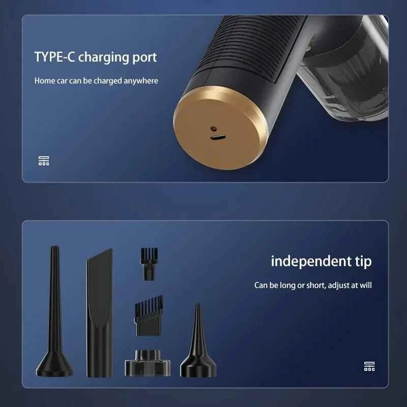 Description Report Item �� Rechargeable Battery :No need to constantly replace batteries. Simply recharge the vacuum cleaner and use it again and again. �� Wireless Convenience :No more tangled cords or limited mobility. The wireless feature allows for easy and convenient use in any room. ��Powerful Suction :The 120w power and strong suction ensure that even the toughest stains are removed with ease. �� Dry and Wet Use :This vacuum cleaner is suitable for both dry and wet use, making it versatile and perfect for any cleaning task. [Product Name]: Handheld Vehicle Vacuum Cleaner [Product functions]:mainly cleaning cars, vacuuming, blowing dust, blowing balloons and so on Version introduction: CA0002-1: Single filter screen Without vacuum cleaner Only suitable for this vacuum [Pro Version]:AU00020 [Product material]: ABS [Motor]: New upgraded Brushless motor [Vacuum degree]: 1290000PA [Rated speed]: 35500rpm [Capacity of lithium battery]: 2 * 2000mAh [Charging mode]: Type-C charging line [Noise]: ≤ 52dB [Operating temperature]: - 20 ℃~+50 ℃ [weight]:550g [package list]: vacuum cleaner X1 Accessories X 6 Charging line X1 User manualX1 [Basic version]:AU00021 [Product material]: ABS [Motor]: Ordinary motor [Vacuum degree]: 1290000PA [Rated speed]: 15500rpm [Capacity of lithium battery]: 2 * 2000mAh [Charging mode]: Type-C charging line [Noise]: ≤ 52dB [Operating temperature]: - 20 ℃~+50 ℃ [weight]:550g [Package list]: vacuum cleaner X1 Accessories X 6 Charging line X1 User manualX1 Notice: 1.The recommended charging time in winter is 8 hours Charging time in summer is 4 hours 2.During the charging process, the vacuum cleaner cannot be started. You need to unplug the power and start it again. 3..Press and hold for 10 seconds to enter the first gear of the vacuum cleaner 4.Press and hold for two seconds to change the suction power of the vacuum cleaner