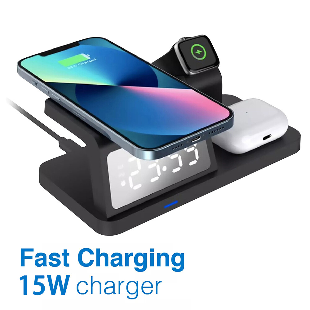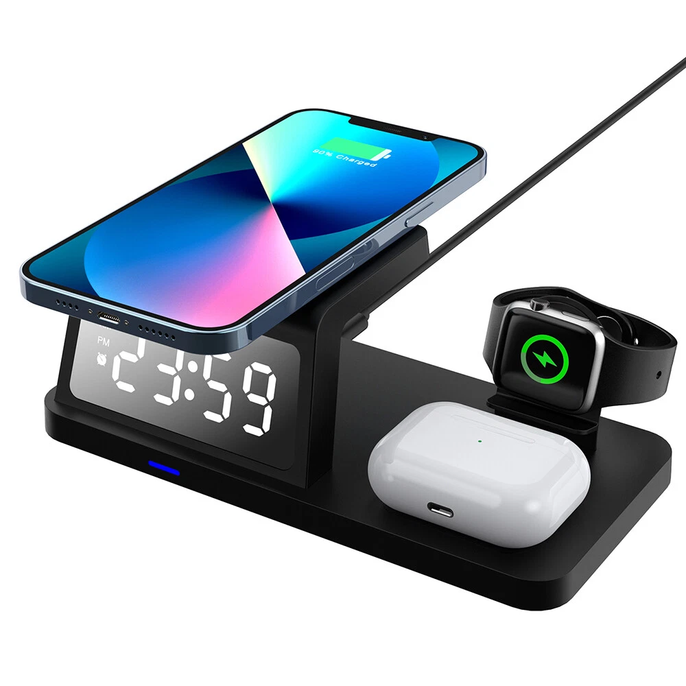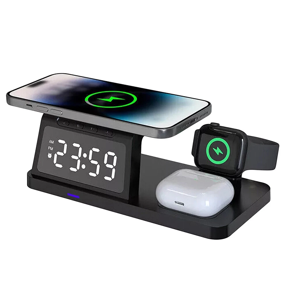 Picture Gallery Description Features: [5-in-1]:The 5-in-1 wireless charger can wirelessly charge up to 3 devices, you can also connect 1 device for wired charging. It includes night light and alarm clock. LED Clock Display】:Equipped with time display and alarm clock, this charger is very useful to keep on your desk. [Widely Used]:The 5-in-1 charging cradle can be used in the bedroom, kitchen, office and anywhere you like. 5-in-1 Design】: The wireless charging station can charge your phone, Apple Watch, and headphones at the same time, leaving your desk and bedside table tidy and organized without messy cords. For better charging experience, please use QC 3.0 power adapter (QC 3.0 adapter not included). 【Safe Charging】:The cordless phone charger provides temperature control and voltage protection as well as short circuit prevention to ensure safe and stable charging. This wireless charger provides you with a safe experience. Anti-slip silicone pads on the base and bottom protect your device from scratches and slips while charging. 【Universal Compatibility】:Apple charging cradle for most Apple devices. Compatible with iWatch series 8/7/6/SE/5/4/3/2/1; Compatible with AriPods Pro/3/2/1; Compatible with iPhone series. (Not compatible with Samsung watches). Compatible with iPhone 8/X/11/12/13/14 series, Samsung S10/S20/S21/S22; Note8/10/20/21 series; other Samsung series that support wireless charging and all other cell phone brands that support wireless charging. Attention: 1.For a fast charging experience, please use a 9V-3A or 12V-2A power adapter (adapter not included). 2.The watch charger is only for Apple Watch, it can't charge Samsung Watch or other brand watches. Specifications: *Product name: 5-in-1 wireless charger *Mobile phone output: 5W/7.5W/10W/15W *Watch output: 2.5W (max) *Headphone output: 3W (max) *Charging distance: 1-8MM *Charging efficiency: ≥75% *Product Material: ABS *Product color: black Package List: 1*5-in-1 wireless charger 1*Type-C cable 1*User Manual Attention: 1.Not included not include the power adapter! 2.Item is limited to charger only, excludes headphones, watch! 3. Due to manual measurement, please allow a difference of 1 cm error! 4. may vary according to light color or monitor tint! Shipping Policy Payment Policy Return Policy Shipping Policy 1. We only ship to the confirmed address provided by eBay. Please make sure your ebay address is 100% matches the address you would like us to ship to. If not, please let us know before we sent you the package, or we will not be responsible for any loss. Hope you could understand. 2. Orders will be processed instantly and dispatched within 1-2 business days except hoilday, so we do NOT accept any email/message note after you place orders. Payment Policy We accept PayPal only. We only ship item to your PayPal verified address. Please pay attention that import duties, taxes and charges are not included in the item price or shipping charges. These charges are the buyer's responsibility. Please check with your country's customs office to determine what these additional costs will be prior to bidding/buying. Return Policy 1. We offer 60 day money back or replacement guarantee. In addition, it allows customers to return new and unused products in their original factory condition for any reason within 60 days from the date of purchase. 2. Although we test each item and they are packed professionally, few item (less than 0.1%) might be damaged during the shipping. Please feel free to contact us within 4 days after you receive your package about replacement. 3. If you don't receive items over 35 days, please make sure to contact us before leaving any neutral or negative feedback. We'll try our best to help you solve the problem. If we authorized the return, customers will get an email with instructions for returning the item. Email will be replied within 24 hours on Chinese business hours. On Dec 22, 2024 at 19:14:44 PST, seller added the following information: