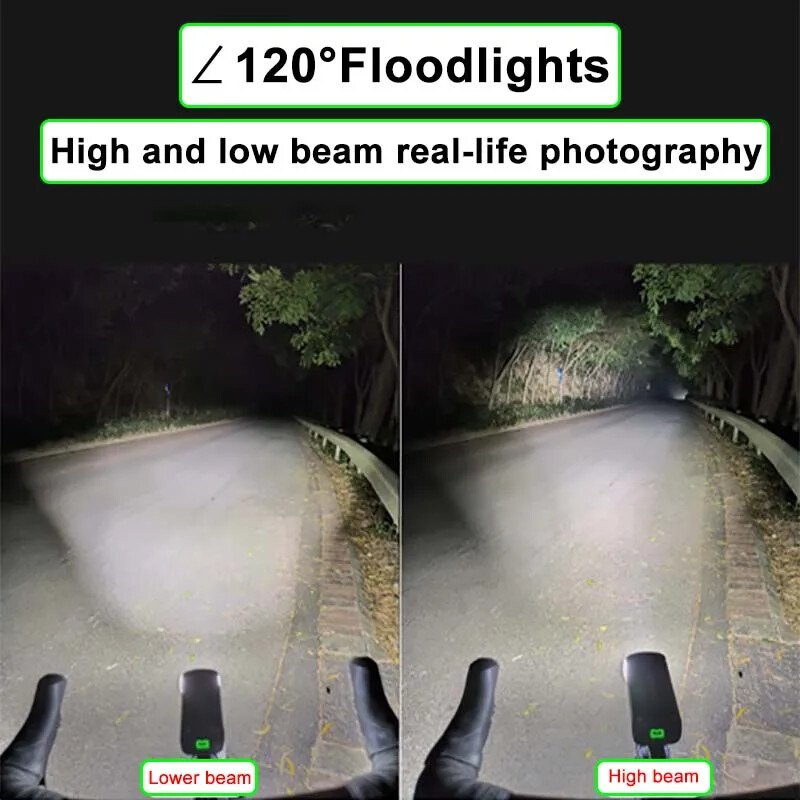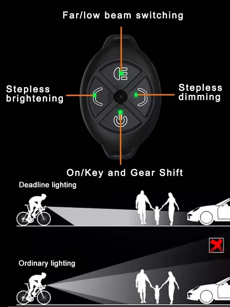 wireless remote control bicycle lighting, multifunctional bracket reverse high beam light, cut-off line, anti glare bicycle light, bicycle glare flashlight, waterproof bicycle lighting and bicycle accessories suitable for various road conditions. Product specification: Waterproof grade: IP65 (light rain, splashing water) Product material: aluminum alloy Exposure distance: over 300 meters LED: Flat car lamp beads Bracket: Multifunctional extension bracket (4 bracket options) Charging and discharge protection: built-in overcharge and discharge ICs. Extending battery life Working voltage: 3.7V Product color: black Lighting mode: strong light lighting; Medium light; Weak light; Burst flash Intelligent mode: automatic start stop function LED color temperature: 7500K Charging type: TYPE-C 2A fast charging - USB charging Battery: Built-in 5000 mA/h rechargeable lithium battery Switch settings: wireless remote control Lens type: cu