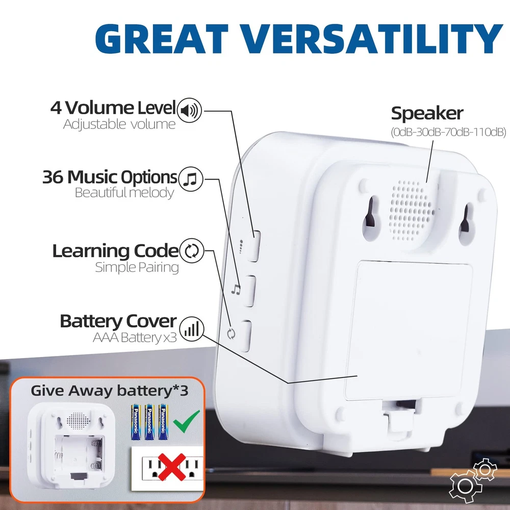 Specification: Receiver voltage: 12V DC (included) Battery: CR2032 3V battery (included) Power consumption: <0.5W Volume: 0-110dB Range: 1200ft in open area Frequency: 433.92 MHz±200KHz Working temperature: -4° F~140 °F (-20°C-55°C) Package Includes: 2x Battery-operated Receiver 1x Doorbell button 1x User Manual 1x Mounting Accessories 【Battery Operated Doorbell】Wireless doorbell does not need a socket, just 3 AAA batteries (included). Doorbell Wireless has an effective working range of 1200 feet in open areas, ensuring you never miss a visit. 【Flashing Light Doorbell】This wireless doorbell has eye-catching colorful flashing LED lights, and the receiver can be placed anywhere you need it. This is a light doorbell for the hearing impaired. 【Portable Doorbell Receiver】Wireless doorbell has 0DB silent mode. In addition, Door bell ringer wireless has built-in 36 ringtone options and 4-level volume selection (mute-low-medium-loud). 【Easy to install & use】Open the doorbell button back cover and remove the insulating sheet to use. For installation, the wireless doorbell package includes double-sided tape and screws and a screwdriver. 【100% Satisfaction】If you have any problem with our wireless doorbell, we will fix it here. We will always do our best to support you (warranty or return).