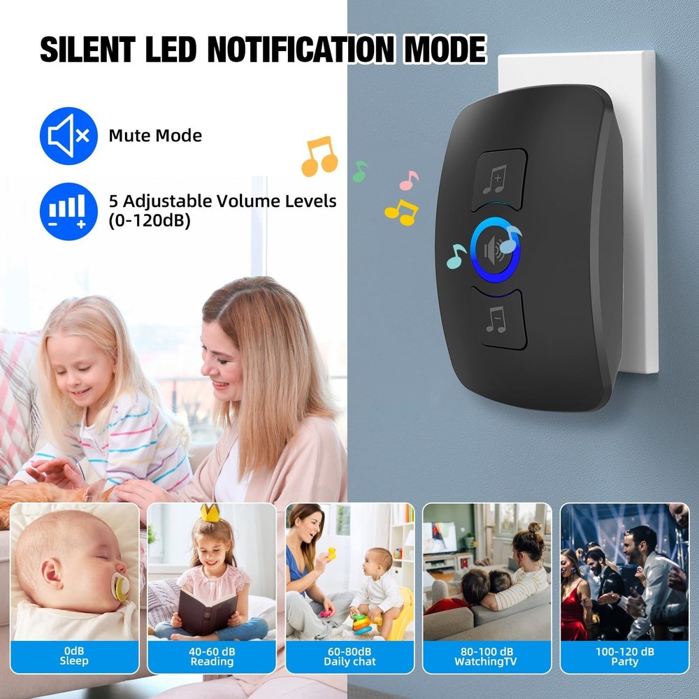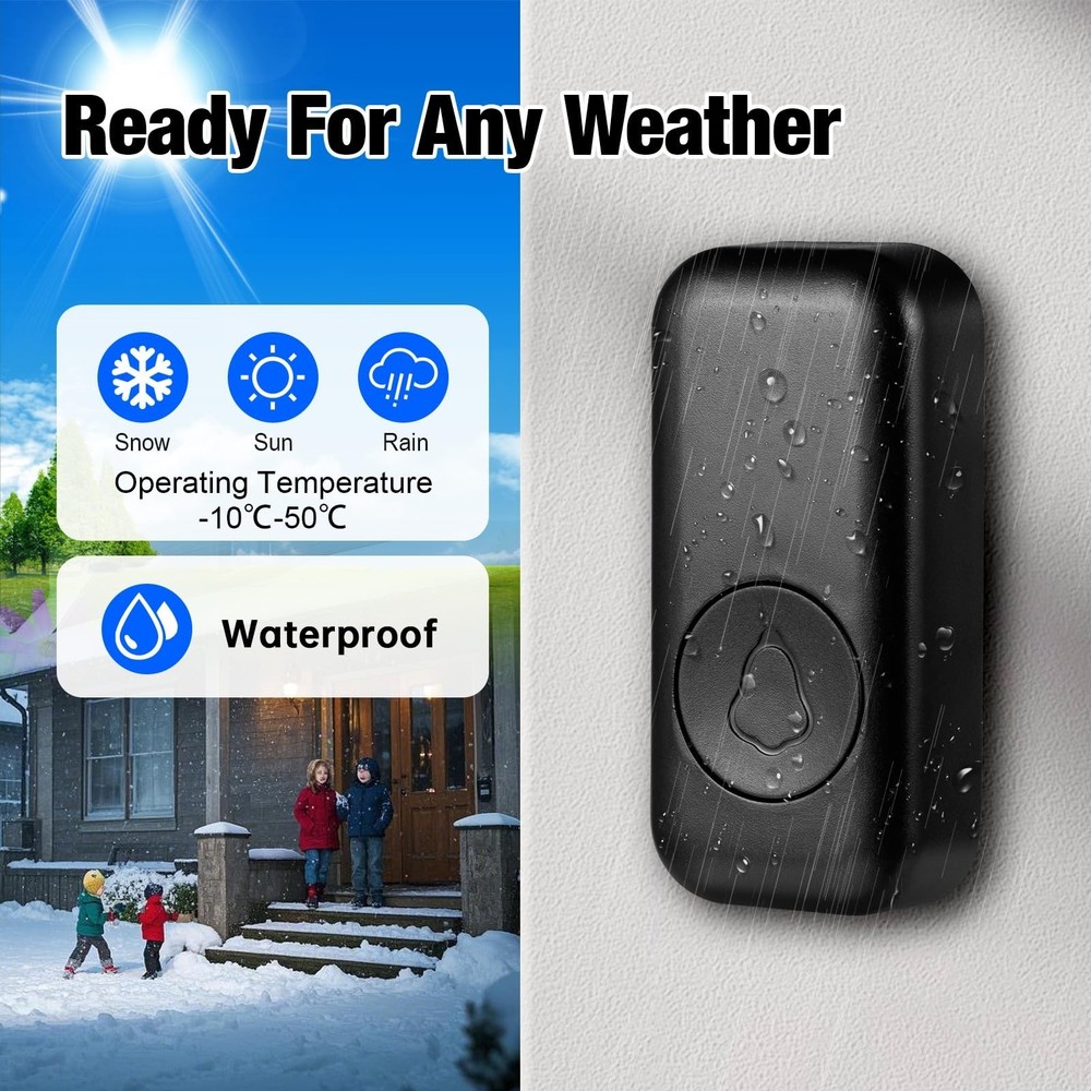 Wireless Doorbell Chime with 60 Melodies, 5 Volume Levels, LED Light, IP55 Waterproof