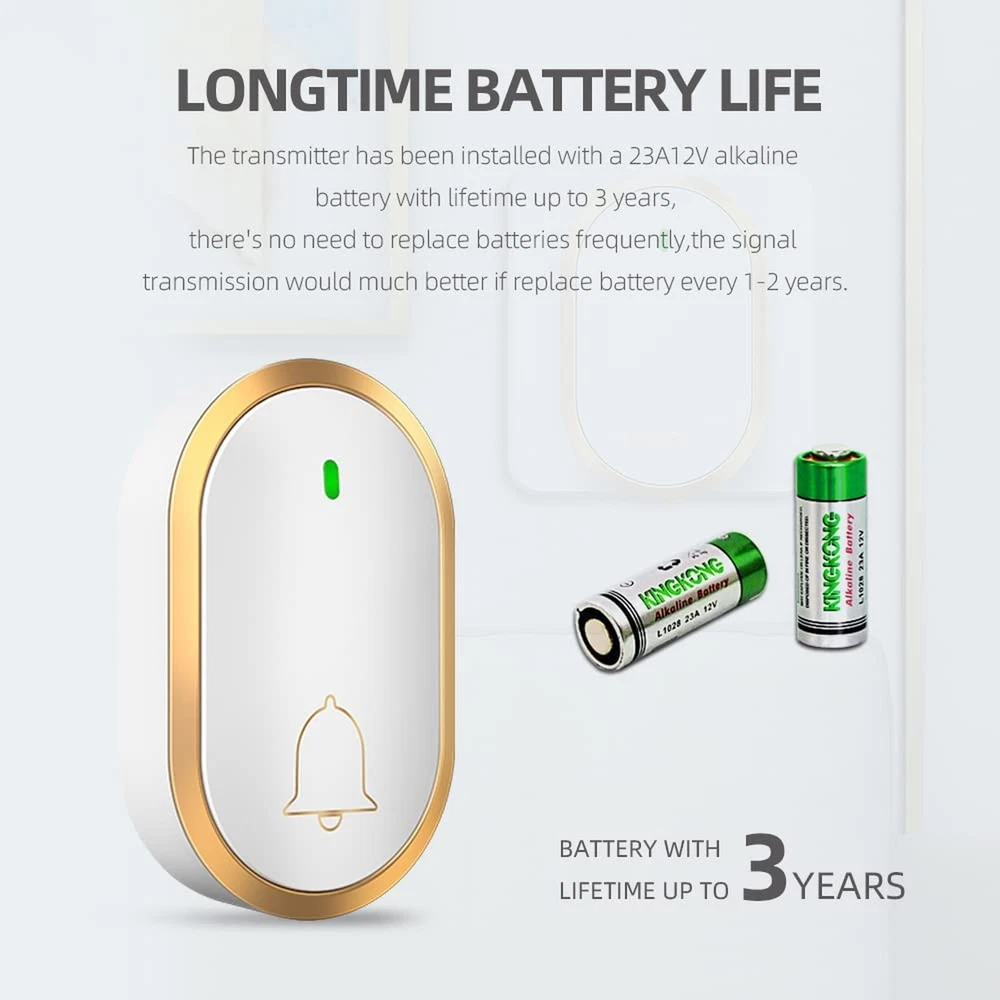 Wireless Doorbells for Home, Doorbell Chime, Wirelss Doorbell in1000ft Range, 60 Chimes, 4 Volume, Waterproof, LED indicator Product Details Color: White+Golden Number of Items: 1 Brand: Bensejk MPN: A68GW UPC: 765015661690 EAN: 0765015661690 Manufacturer: ‎Shenzhen Jingke Zhichaung Co.,ltd Part Number: ‎A68GW Item Weight: ‎4.5 ounces Product Dimensions: ‎2.2 x 0.86 x 3.6 inches Country of Origin: ‎China Item model number: ‎A68 Color: ‎White+Golden Item Package Quantity: ‎1 Included Components: ‎Transmitter, Reveiver Batteries Included?: ‎Yes Batteries Required?: ‎Yes Battery Cell Type: ‎Alkaline Date First Available: September 14, 2024 [Multi-Ringtones and Adjustable Volume]: Take this door bells for homes, there are 60 ringtones and 4 adjustable volume levels for choosing, the voice is loud enough to hear clearly [Long Wireless Doorbell Range]: The reveiving distance is long, up to 1000ft Range in open area. This wireless doorbell transmitter and receiver adopts FM signal, no need wired which has strong anti-interference features and one-to-one signal pairing [Loud Doorbell Kit]: Doorbell Adjustable Sound is from 25-115DB. With Metal speaker, the ringer is loud enough you can hear it clearly in your house. Nice bedroom doorbell [Easy Installation]: Plug the doorbell receiver in the socket and place the Transmitter on the wall, either by double sided tape or screws(See the user guide), easy set up and simple operate. Nice wireless doorbells for home [Water Resistance]: The door bell is steek design, dustproof and waterproof protection, IP44 compliance. Working temperature:-4 F -140 F. The transmitter does not consume power without being pressed and battery life: 3 years [Call Alarm] A Door bell but A Call bell too, It helps alarm and take notice as need, Call from dooryard/upstairs or Call Button Alerts for caregivers