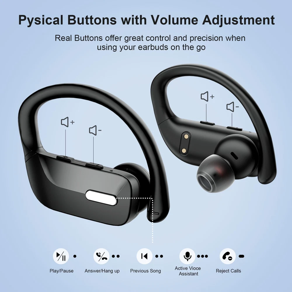 LED Power Display for Charging Case: the wireless Bluetooth headphones' charging case features an LED power display that shows the remaining power in percentage. The charging case displays its battery level from 1% to 100%. While charging the right or left wireless ear buds earbuds Bluetooth, the LED bars for the earbud on the case will flash. Once the earbuds wireless Bluetooth are fully charged, the LED bars will no longer flash.Convenient to know the charging status of your wireless earbuds 48 Hours Battery Life with Charging Case: The built-in 600mAh charging case provides a total of 48 hours of battery life. Each sport Bluetooth wireles earphone can last for 8 hours of music time on a single 1.5-hour charge.The charging case can recharge the twin Bluetooth wireless sports earbuds up to 6 times, resulting in a total playtime of 48 hours when using the portable charging case.You can enjoy uninterrupted music with wireless Bluetooth headphones during your workouts Stereo Music & Clear Call: With audio technology, Bluetooth wireless earbuds produce rich, immersive sound with deep bass and clear treble.The true wireless earbuds feature noise-canceling calls, effectively reducing partial background noise, guaranteeing a stable signal and minimal power usage during phone calls.Experience immersive stereo sound and enjoy hands-free calls while working out, wirelessly and effortlessly One-Step Auto Pairing: Simply pick up Bluetooth earbuds wireless from the charging case, and they will power on and automatically pair with each other.Then activate Bluetooth function on your mobile phone and search for "T17" to connect. After the initial successful connection,the earbuds wireless Bluetooth will automatically connect to the last paired device upon reboot.When using a single earbud wireless, just remove the second one to seamlessly transition between single mode and twin mode Engineered Design for Sports: The wireless Bluetooth earbuds are designed with adjustable and secure-fit silicone ear hooks and an ergonomic design, ensuring a comfortable and firm fit during running, and other outdoor sports activities.They come equipped with 3 pairs of different-sized spare ear caps for options. Even during strenuous exercise,the earbuds wireless Bluetooth will not fall off. And IPX5 waterproof rating protects headphones wirelsess Bluetooth from water drops or sweat damage