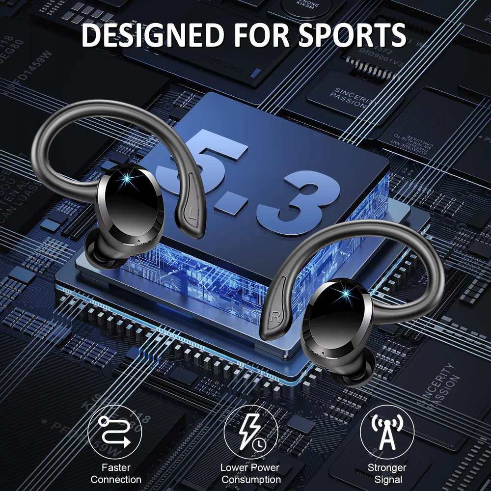 Bluetooth 5.3 Technology & Auto Pairing: Features Bluetooth 5.3 with dual-channel transmission for instant pairing and stable, uninterrupted connectivity. Earbuds automatically connect to the last paired device when taken out of the charging case. Ergonomic Comfort Sports Design: Includes soft ear hooks that fit the contours of your ears, ensuring comfort and a secure fit during strenuous activities. Comes with 3 pairs of different sizes of spare ear caps for a customized fit. IP7 waterproof rating protects against sweat and rain, making them ideal for sports, workouts, and running. Stereo Sound Quality & Clear Calls: Equipped with 14.2 mm vibrating diaphragms and AAC/SBC audio coding technology for strong bass and balanced mid and high frequencies. HD microphone in each earbud reduces background noise for clear, realistic calls. 48 Hours Ultra Long Playtime & Dual LED Display: Offers up to 8 hours of playtime on a single charge, extended to 48 hours with the portable charging case. Dual power display shows remaining battery of the case by number and charging status of earbuds by LED bar.