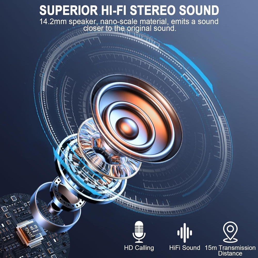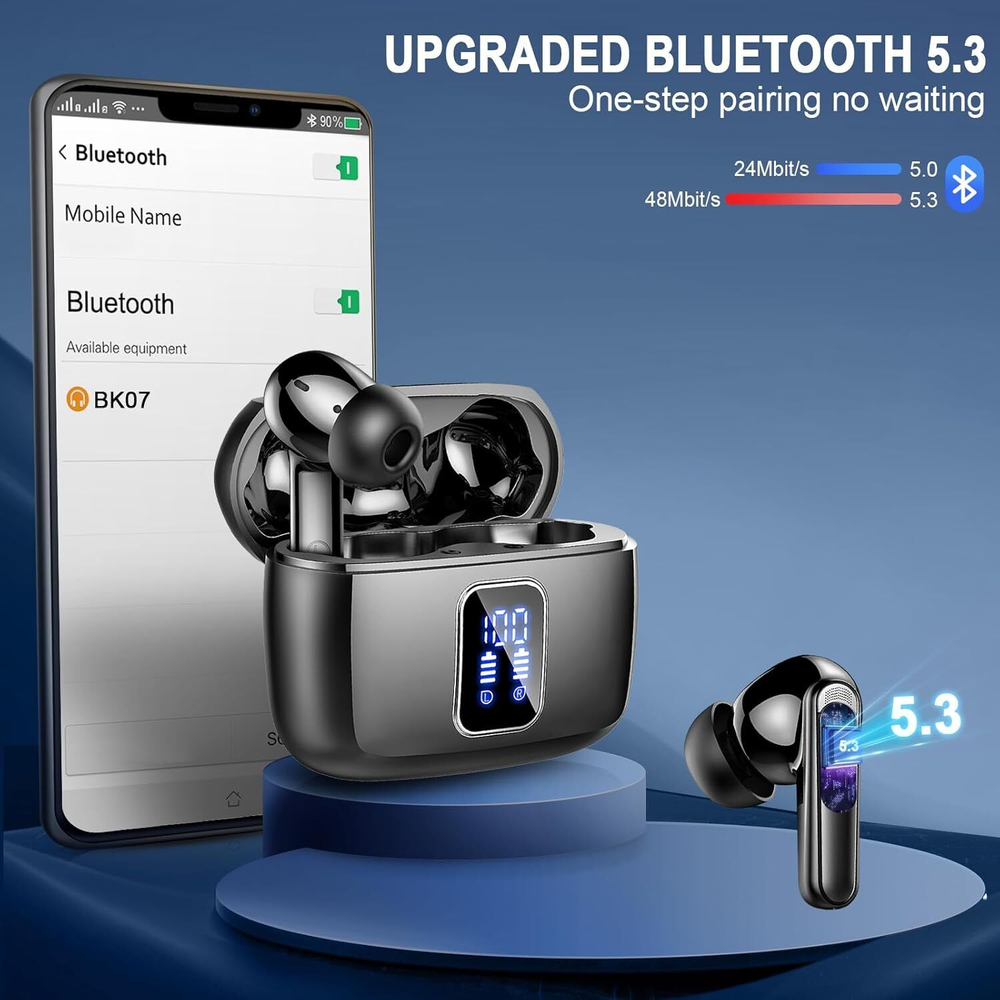 eBay Wireless Earbuds, Bluetooth 5.3 Headphones, Ear Buds Wireless Earbuds Bluetooth with 4 ENC Noise Cancelling Mic, 48H Playtime HD Stereo, LED Power Display, IP7 Waterproof Wireless Earphones, Jet Black Item Description Bluetooth 5.3 and One-Step Pairing: The Bluetooth earbuds utilize advanced Bluetooth 5.3 technology and support HID, HFP, A2DP and AVRCP Bluetooth protocols, allowing you to connect to multiple devices at the same time, with data transfer speeds up to 2x faster than the previous generation, dramatically reducing data latency and improving connection stability. The wireless earbuds also come with a capacitive touch interface and a full control suite that performs all functions with a single tap. LED Power Display and 48 Hours Playtime: The wireless ear buds provide 6-8 hours of music playback or 3-4 hours of talk time on a 1.5 hour charge, and when used with the charging case, provide up to 40 hours of total playback time for a full day of work and sports. The LED power display can track the remaining power of the charging case and the charging status of the earphones in real time. The Type-C charging port ensures a faster and more convenient charging experience. Premium Stereo Soundstage and Crystal Clear Calls: The wireless headphones are equipped with 13mm speakers that deliver powerful bass, ultra-clear vocals and stunning highs for a high-fidelity sound experience. The Bluetooth headphones have 4 built-in microphones with omni-directional sound capture and a signal-to-noise ratio of up to 57dB, which effectively reduces moderate wind noise while keeping the caller's voice clear, allowing you to enjoy high-quality calls. Ergonomic Design and Lightweight: To ensure a secure fit and long-lasting comfort, the noise cancelling earbuds comes with three different sized earbuds that fit 99% of the contours of the ear canal. These BK07 ear buds are lightweight, with individual earbuds weighing just 0.13 ounces, so you won't even feel them when you're wearing them and enjoy freedom of movement throughout the day. With dimensions of 58.7*47.7*26.6 mm, the charging case is small enough to fit directly into your pocket. IP7 Waterproof and Wide Compatibility: The Bluetooth earphones are equipped with nano-coating protection that not only prevents water and sweat from seeping in, but also prevents moisture in the air from damaging the components, thus extending their lifespan. The material of the case is smooth and easy to clean. In addition, the headphones can easily connect to almost any Bluetooth-enabled audio device, getting rid of the tangle of wired earbuds and enjoying unrestricted movement. › Bluetooth 5.3 technology extends transmission distance and reduces dropouts. Take out both earbuds and they will automatically power on and pair with each other. The wireless earbuds are equipped with 13mm speakers that deliver powerful bass, ultra-clear vocals and stunning highs for a high-fidelity sound experience. Payment We accept payment only through PAYPAL Shipping We ship products worldwide through standard express courier service, it will reach within 7 to 10 days to abroad buyers, we ship the product after recieved clear payment and give full information about shipment to the buyer Return We accept product return within 7 to 21 days from delivery date but product should be in original position and not in damaged condition,the return shipping charges will be buyer responsibility