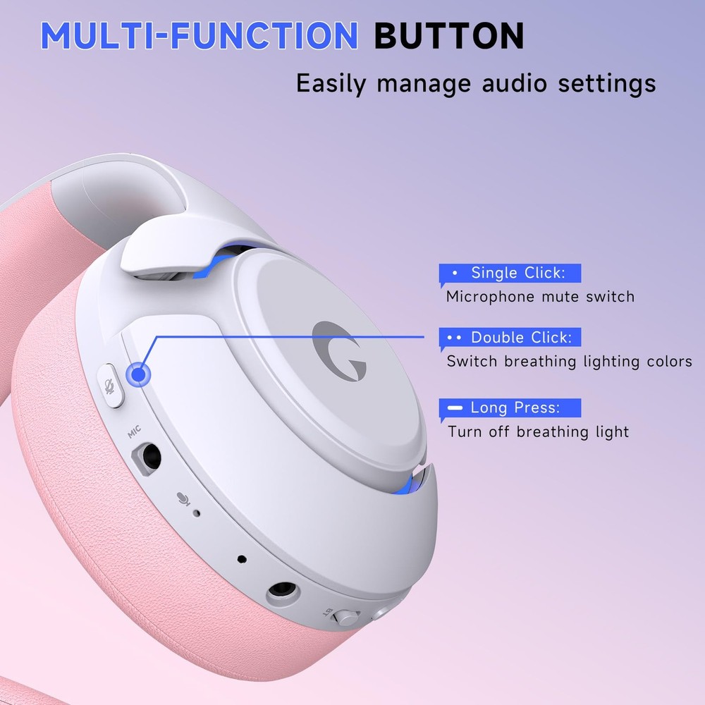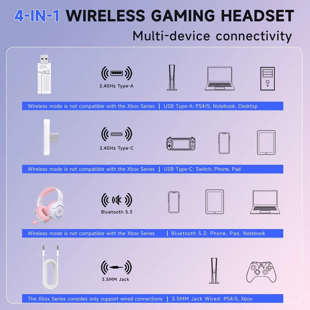 Why Choose the Captain370 for ps5 Headset Wireless? 1. Wireless gaming headset features 4 connection modes①2.4GHz USB Wireless: For PS4/5, laptops, desktops, Mac, phones, and Switch; ②Type-C Wireless: For phones, tablets, and for ps5 with Type-C ports; ③Bluetooth 5.3: For phones, tablets, and laptops; ④3.5mm Wired: For PS4/5, Switch, PC, and Xbox series 2. For ps5 headset wireless with colorful breathing lights to enhance the gaming atmosphere. The microphone mute button is multifunctional: single click mutes the microphone, double-clicking changes the light colors, and a long press turns off the lights. The high-precision 50mm magnetic neodymium drivers increase speaker sensitivity, providing deep bass and clear high-frequency details; 3D surround sound deliver a realistic audio experience. 3. For ps5 wireless headse features a built-in backup microphone that supports normal calls even after detaching the main microphone. For ps5 headset with mic external microphone uses Noise Cancelling (ENC) technology to effectively reduce background noise during team calls, making your voice richer, clearer, and more professional. Gaming headset noise cancellation performance has been improved by 40% compared to the previous generation. 4. Bluetooth gaming headphones with mic offers up to 45 hours of continuous gaming, ensuring you stay immersed in the world for Fortnite. The Type-C port design makes charging quick and convenient, with a full charge taking just 3 hours. Bluetooth headphones with mic provides stable connectivity with a range of up to 49 feet, delivering excellent sound quality and as low as 20 milliseconds of latency, ensuring seamless audio feedback during intense gaming sessions. 5. wireless gaming headset is made of high-quality, durable materials and features a sleek, stylish design.The base color tone of the for ps5 headset makes it both a wireless gaming headsets for pc and a bluetooth gaming headset suitable for a variety of scenarios (subway, home, out and about) by simply removing the microphone. Meanwhile, we have experienced engineers and a professional support team to provide comprehensive assistance for all customer.. What's included in the box? 1 x Captain 370 Wireless Gaming Headset 1 x Headset Transmitter 1 x User Manual 1 x Audio/Mic Splitter Adapter 4-IN-1 Wireless Gaming Headset: The Captain370 for ps5 headset wireless supports 2.4GHz USB, Type-C wireless, Bluetooth 5.3, and 3.5mm wired connections. Compatible for ps5, ps4, Switch, PC, Xbox series, laptops, tablets, and phones. (Note: External mic is not available on Switch.) Gaming Headsets Wireless: This pink gaming headset features colorful breathing lights and multifunctional mic control. Equipped with 50mm neodymium drivers, it delivers deep bass, clear highs, and 3D surround sound for an authentic gaming experience Supports Calls Without the Microphone: The wireless pink headset with mic supports calls even after removing the external mic. ENC technology reduces background noise by 40%, ensuring rich, clear, and professional communication during gaming or calls Headset Offers 45-Hour Battery Life: This wireless gaming headset offers up to 45 hours of playtime with a 1000mAh battery. Type-C charging gets you back in action in just 3 hours. Bluetooth stays stable up to 49 feet with 20ms low latency 24/7 Service & Technical Support: Made from high-quality materials, the wireless gaming headset for PC easily transforms into stylish Bluetooth headphones by removing the mic. Backed by a professional support team offering 24/7 technical assistance Note 1: When using a 3.5mm audio cable to connect an Xbox controller, an adapter (not included) is required. Audio cables alone are not directly compatible with Xbox controllers Note 2: The microphone of this gaming headset is not compatible with Switch. If the microphone does not work when you use it for the first time, please check if the “Microphone Button” is muted. If so, switch the “Microphone Button” to unmute so that the microphone can work properly