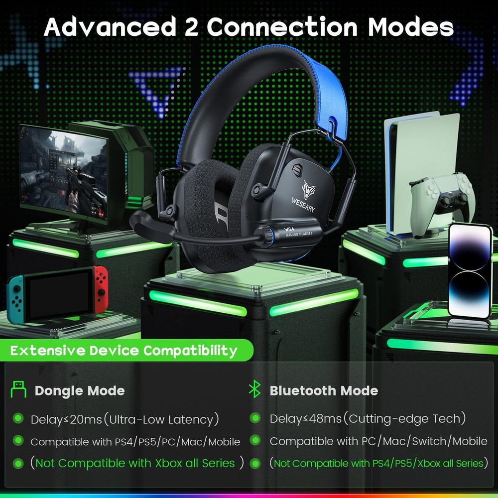 Our wireless gaming headsets features advanced 2.4GHz ultra-low latency technology, delivering audio delay of ≤20ms. It supports both 2.4GHz dongle mode and Bluetooth mode. With a 40mm dynamic driver and omnidirectional noise-canceling microphone, it ensures clear communication and immersive sound. The 900mAh battery lasts up to 45 hours, compatible with multiple platforms, and suitable for all ages. 🏆【Unrivaled 3D Stereo Sound for Immersive Gaming】Elevate your gameplay with our gaming wireless headset for pc, featuring high-definition dynamic drivers that deliver rich, immersive 3D stereo sound. Whether it's the faintest footstep or the roar of an explosion, experience crystal-clear audio that keeps you ahead in every match. Designed for ultimate realism, intensifies your gaming environment and gives you the competitive edge you need to dominate the battlefield. 🚀 【Ultra-Low Latency for Seamless Gaming】 Elevate your gaming with our state-of-the-art wireless headset for PS5, featuring a 2.4GHz USB dongle for ultra-low latency audio (≤20ms). Enjoy a truly immersive gaming experience where every sound is delivered with lightning-fast precision. Switch effortlessly to Bluetooth mode with a single press for swift responsiveness (<48ms). Embrace the freedom and customization that take your gaming to the next level. 🔄 【Ultimate Compatibility Across Devices】WG4 Gaming headsets are your go-to solution for versatile connectivity. The 2.4GHz dongle mode ensures flawless performance with a gaming headset compatible with PS5, PC, PS4, Switch, Mac, and laptops. The Bluetooth mode is easily compatible with PC, Mac, Switch, Mobiles, tablets, and laptops.🚫 Note: Bluetooth mode is NOT compatible with PS4/PS5.❌ Both modes are NOT compatible with Xbox Series.⚠️ The microphone is NOT compatible with Switch. 🎤 【ENC Omnidirectional Mic】 Lead your team to victory with our Gaming Headphones compatible with PS4, featuring a 360° rotatable omnidirectional mic for crystal-clear communication. Advanced noise-cancelling tech blocks out background noise, ensuring you hear every crucial step, reload, or voice cue in games like Fortnite, Call of Duty, The Legend of Zelda, and RPGs with precision. Mute the mic with a single click, giving you full control and clarity in every intense battle. 🎮 【Ultimate Ergonomic Comfort for Gamers】 Experience unparalleled comfort with our Gaming Headset for PS4, crafted with an adjustable headband that evenly distributes pressure for a personalized fit. Designed for gamers of all ages, it ensures lasting comfort during long gaming sessions. The breathable earmuffs provide excellent noise isolation, while the moisture-wicking fabric keeps you cool and dry, even during the most intense gaming marathons. Elevate your gaming experience. 🔋【Unmatched Battery Power】Experience gaming like never before with our gaming headset for pc, featuring a powerful 900mAh battery that supports up to 35 hours of gameplay with dynamic LED lighting, or an impressive 45 hours without. Enjoy ultimate convenience with our quick 2-hour USB-C charge, which allows you gaming session never has to pause. Designed for dedicated gamers, ensures you're always ready for action. 🌈 【Lightweight & Portable Folding Design】 Our wireless headphones for PC are lightweight and feature a foldable design for easy storage and convenient travel. Whether you're commuting or on an adventure, this space-saving design ensures you can enjoy high-quality sound anytime, anywhere. 🎁【Perfect for All Ages & Occasions】This gaming headset for mac makes an ideal gift for C-hristmas, birthdays, or special celebrations. Whether for boys, girls, family members, or friends, it’s designed to bring joy and elevate their gaming or entertainment experience. A thoughtful G-ift that will impress any gamer or music lover!