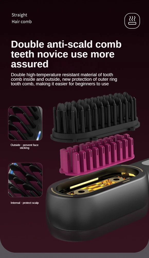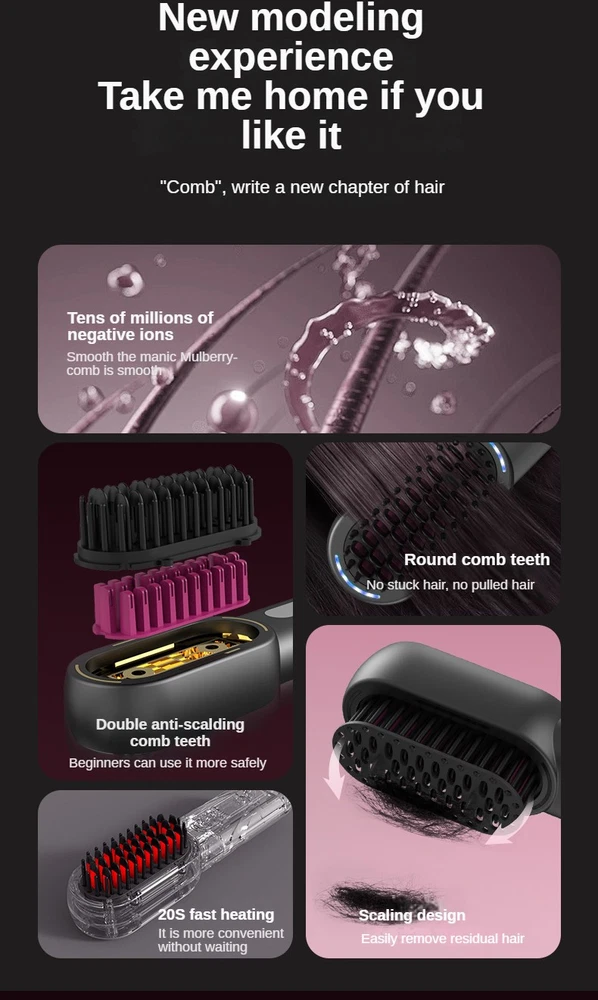 Product Description: Our wireless straight hair comb is a game - changer in the world of hair styling. It comes in a sleek, classic black design and offers a multitude of features. Wireless Usage : The convenience of wireless operation allows for easy handling and portability. You can style your hair anywhere, anytime without the hassle of cords. 4 - Speed Temperature Adjustment : With four different temperature settings, you can choose the ideal heat level for your hair type. This ensures that your hair is styled without excessive heat damage. Expansion and Contraction Design : This innovative design allows for better contact with your hair, ensuring smooth and efficient styling. Blue Light Sterilization : The blue light function helps to keep the comb clean and hygienic, reducing the risk of bacteria buildup. When compared to old - style straight hair combs, our wireless straight hair comb stands out. The old - style combs are inconvenient due to their wired nature, difficult to clean, and lack of features like negative ion generation and temperature control. In contrast, our wireless straight hair comb offers wireless portability, easy - to - clean scalina design, tens of millions of negative ions for hair care, and four - gear temperature adjustment for safe and effective styling. This straight hair comb also offers two modes: curly hair mode and straight hair mode, allowing you to achieve your desired hairstyle in just 1 minute. The package includes a hair cutter and an ordinary hairpin, providing all - round hair styling solutions.