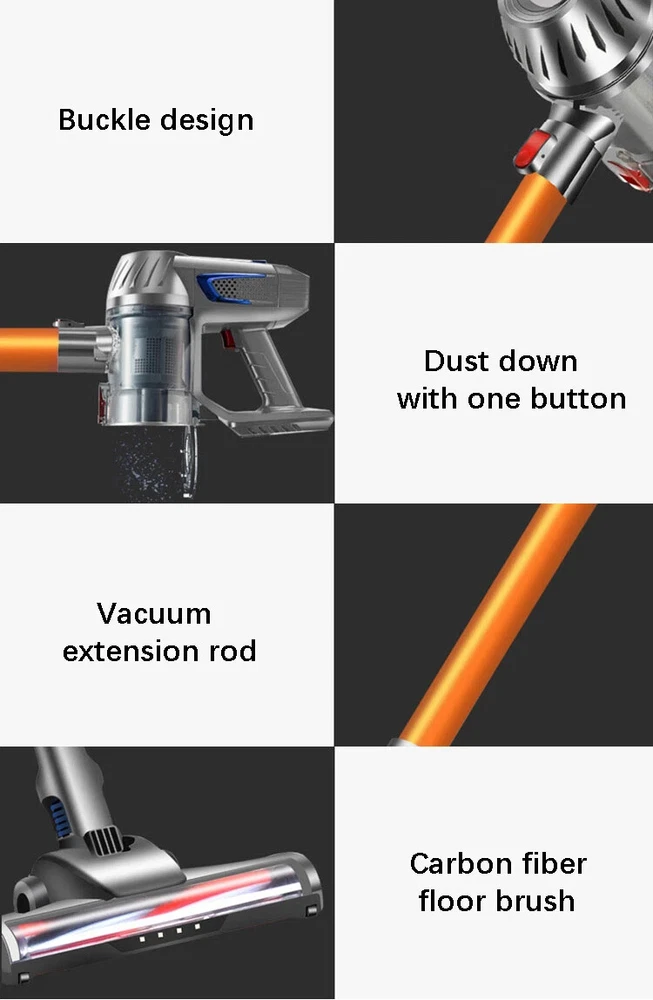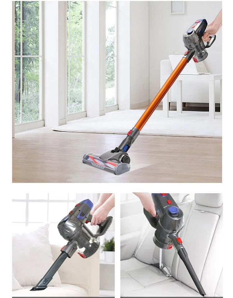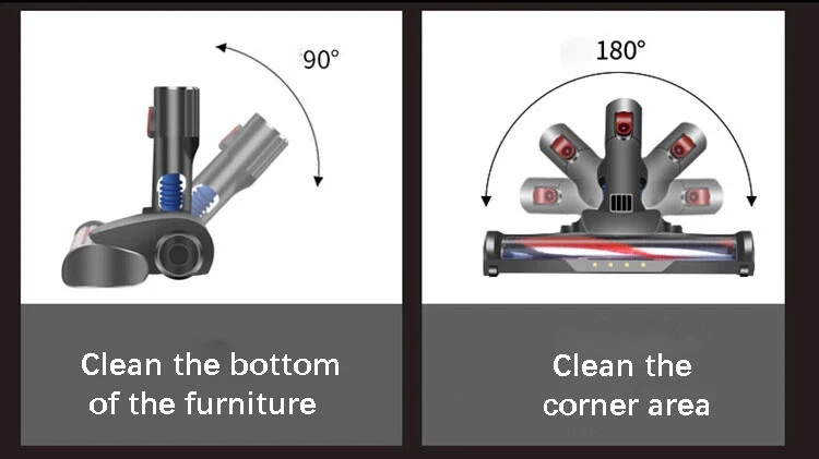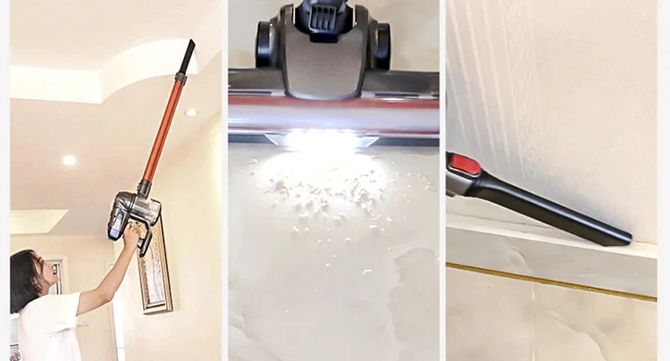 Wireless detachable battery dual motor vacuum cleaner 1. Powerful Suction: With a strong suction power of 16kPa, this wireless vacuum cleaner effectively removes dirt and debris from surface. 2. Detachable and Replaceable Battery: Our wireless vacuum cleaner comes with a removable battery. 3. Built-in LED Light: The integrated LED light provides enhanced visibility, helping you clean hard-to-reach areas and corners, leaving no dirt or debris behind. 4. Dual Operation Modes: Choose between two operation modes - standard and strong - to adjust the suction power according to your cleaning needs. 5. Advanced 5-Stage Filtration System: Equipped with a comprehensive 5-stage filtration system, our vacuum effectively captures particles as small as 0.3 microns, leaving behind cleaner air and reducing allergens in your home. 6. Long-lasting Battery: The 2600mAh battery ensures longer cleaning sessions without the hassle of frequent recharging. Double motor drive cleaning more thoroughly The main motor is matched with the independent motor of the floor brush The dual motors are driven at the same time, which significantly increases the dust removal force The dust collection efficiency is higher, and the dust that is difficult to remove is deeply cleaned. Electric mite removal brush head Suck away the dust, dander, mites, etc. hidden deep in the quilt and mattress, and give yourself and your family a healthy living environment Independently brush the motor Increase the suction power again to completely remove dust and dirt Switch between two modes at will The suction power can be adjusted according to the degree of dirt, making it easier to clean 5-fold filtration system Filter dust particles layer by layer to avoid secondary pollution, and protect your health while removing dust Front LED lighting Visually clean, illuminate dead spots Floor brush can be up and down 90°, left and right 180° rotation Easily clean the bottom of the furniture and the corners of the walls, and the narrow and difficult-to-clean areas in the corners of the furniture Easy to disassemble Consumables can be disassembled, making daily maintenance easier Dust cup, honeycomb filter and filter element are all washable Clean and environmentally friendly, no need to replace parts frequently Equipped with a variety of brush heads, clean without dead ends more details Product acessories 1. Main motor 2. Floor brush 3. Battery 4.Round brush 5. In addition to mite brush 6. Hanger 7. Telescopic tube 8. Two-in-one brush head 9. Power adapter 10. Other accessories Q&A Q1:How long can the battery last? The vacuum cleaner has two gears, the powerful gear can run for 20 minutes, and the standard gear can run for 40 minutes. Q2:Does the vacuum cleaner clean the carpet or only the floor? The vacuum cleaner cleans carpets and floors very well. Q3:If the suction power weakens after using for a period of time Please check whether the HEPA filter element is wet, or whether it should be cleaned. Wet and clogged HEPA filter elements will cause the suction to weaken Precautions for use: 1. The product needs to be charged for 4-5 hours and used after fully charged (it is forbidden to turn on the phone during charging, and it will cause battery damage when turned on during charging) 2. After the product has been used for a period of time, the HEPA filter needs to be cleaned or replaced. If the filter is blocked, the suction will be reduced. 3. When using, pay attention to if the floor brush wheel is entangled with hair, it needs to be cleaned in time to avoid damage
